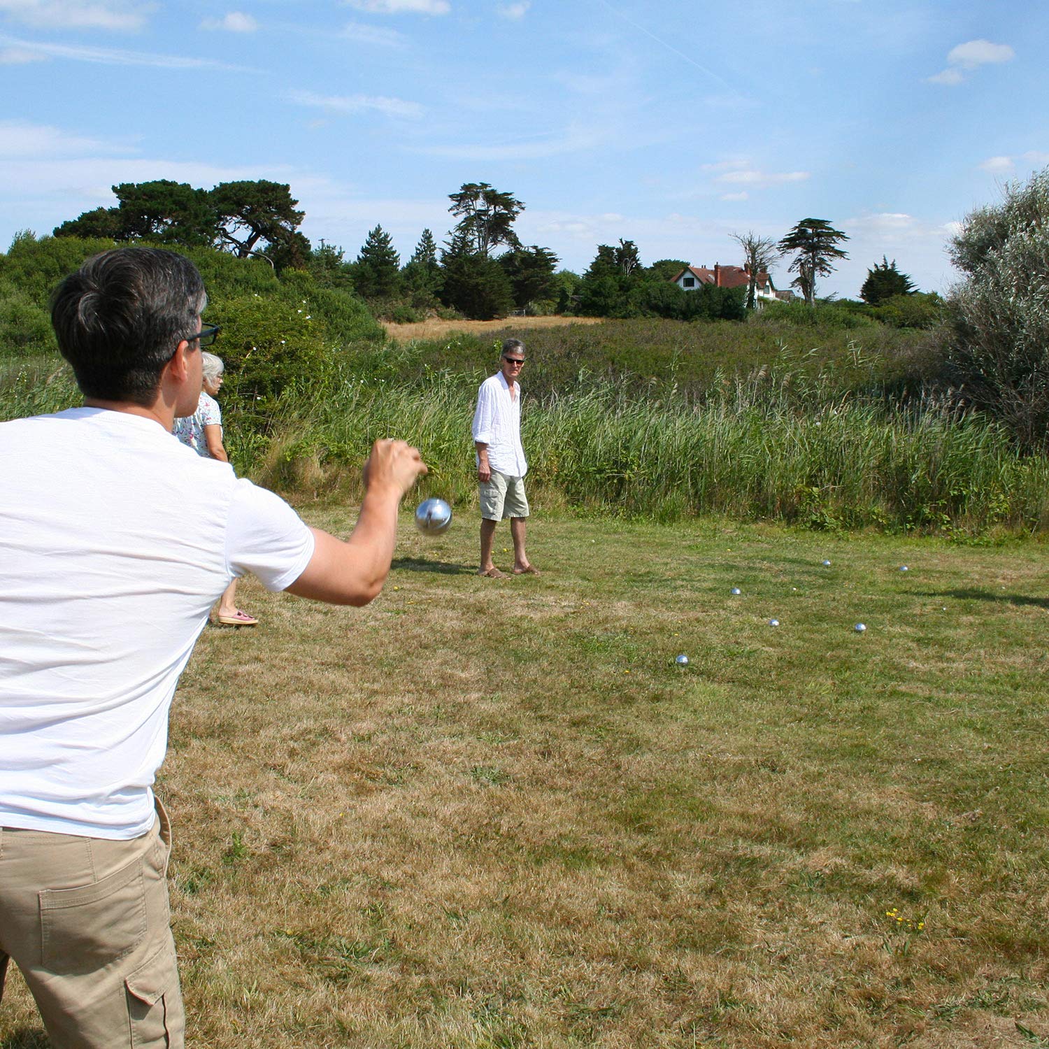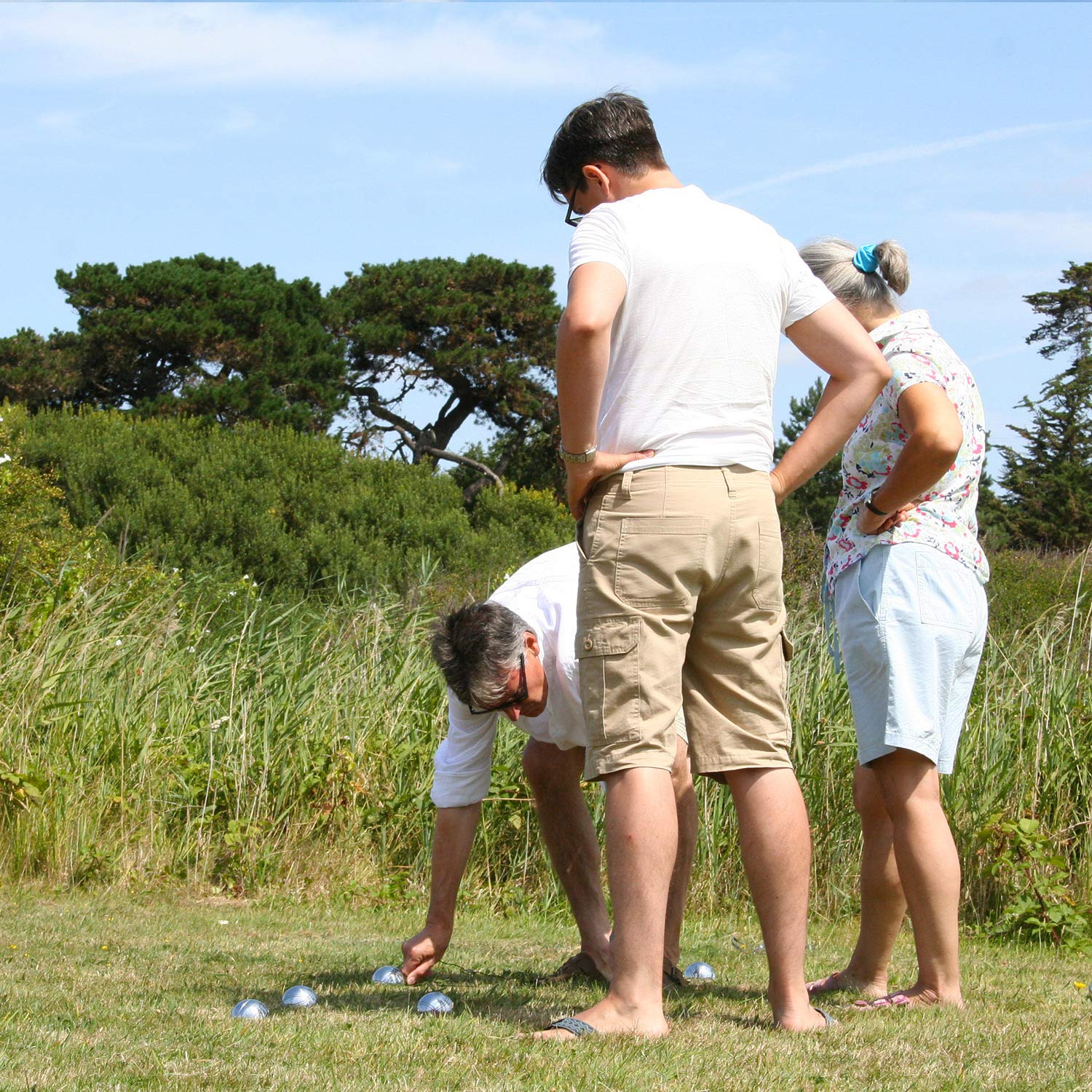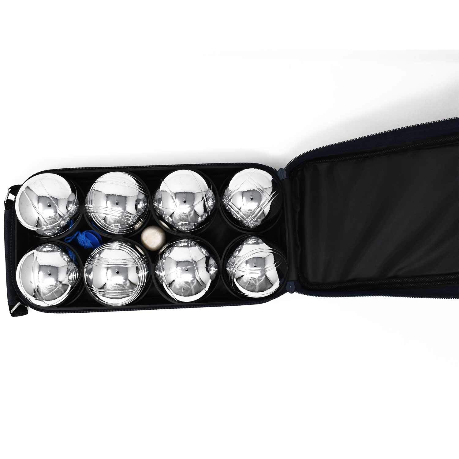 "["Luxuriously polished 8 metal ball Bocce set with rust protection for added durability and superior quality","Presented in a beautiful, thickly padded canvas carrying bag with molded support for extra strength and padded handle for added comfort","Durable compartments in the carrying bag ensure each ball is secure and protected","Steel balls in official size and weight are engraved with 4 classic patterns with clear markings so players can easily identify their own boules","This complete Petanque set for 4 players includes a measuring device and a wooden jack"]