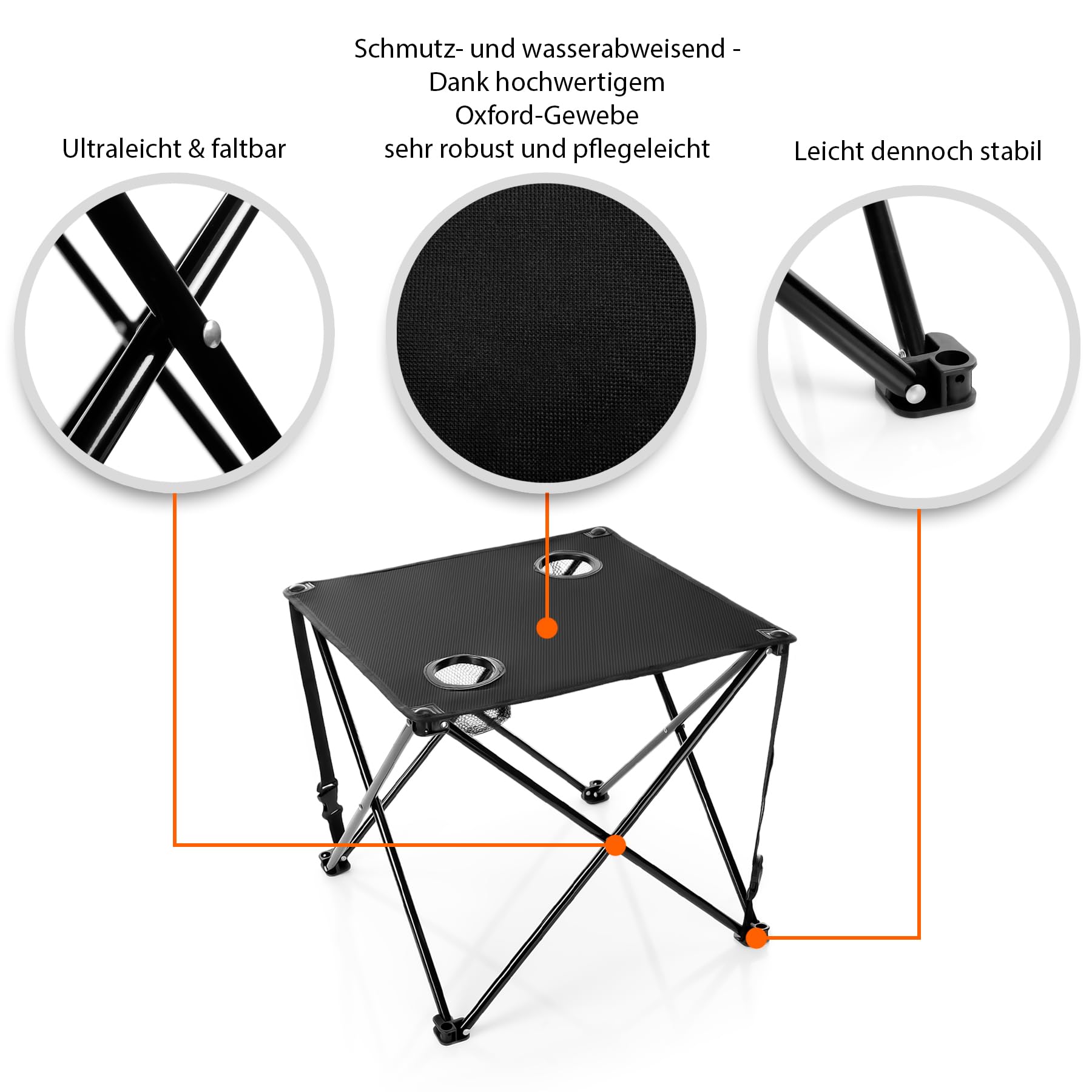 "CAMPING TABLE WITH CUP HOLDERS: The foldable table complements the outdoor set perfectly and offers a practical surface for food, drinks, or camping gear. Thanks to the integrated cup holders, bottles and cups stay securely in place - no more spilling or tipping over."