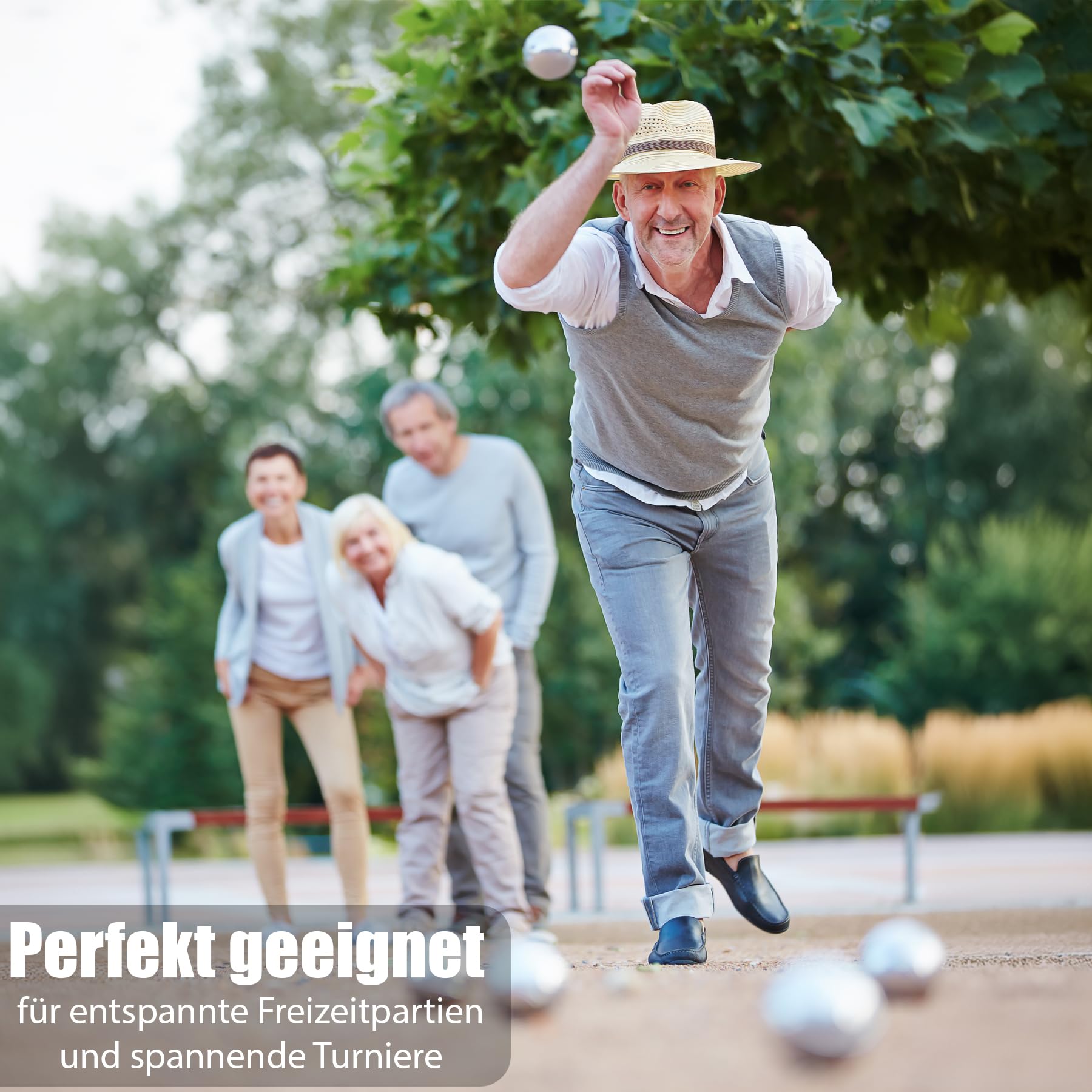 ["HIGH-QUALITY CHROME-PLATED PETANQUE BALLS: The Boule Set consists of 8 sturdy chrome-plated Boccia balls, ideal for the beach, garden, or social gatherings with friends.","PERFECT SIZE AND WEIGHT: Each boule ball is perfectly balanced to ensure optimal control and precision while playing - ideal for beginners and pros. Botcha balls for real gaming fun.","SUITABLE FOR ANY SURFACE: Whether sand, grass, or gravel - this Boccia set is versatile and guarantees fun on any surface. Our Boule Set 8 balls will impress you. Promised.","PRACTICAL CARRYING BAG INCLUDED: The Boule Set comes with a durable carrying bag that allows for easy transport and secure storage. Furthermore, our Boule set comes with foam inserts that minimize the balls from sliding in the case. The popular Boule game for young and old.","DETAILS: 8 balls with 4 designs for easy identification of your balls // Weight of the Boule Set: 5.8kg // Color: Silver // Package Contents: 1x Boule Set","The boule balls are delivered in a convenient bag and accessories as shown."]