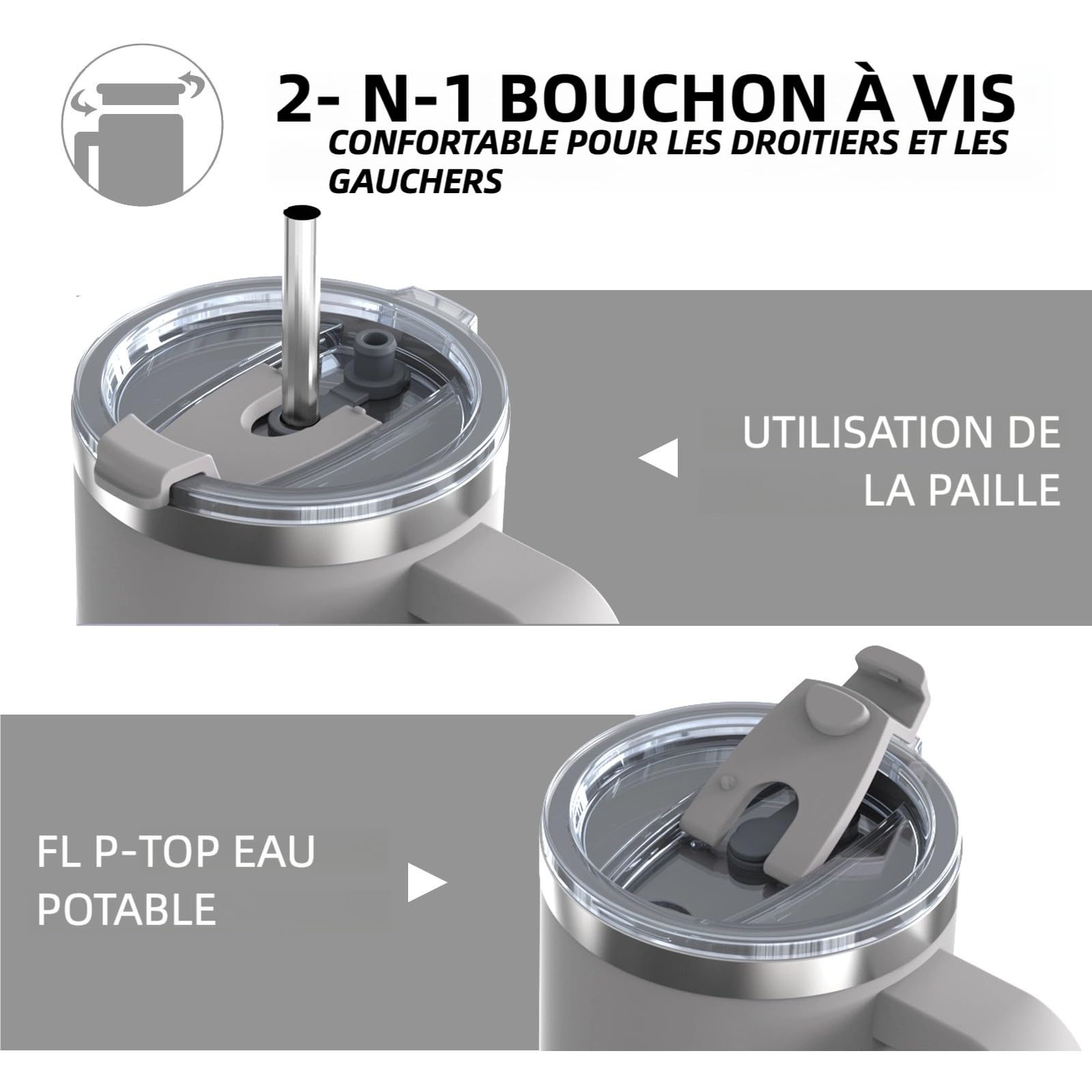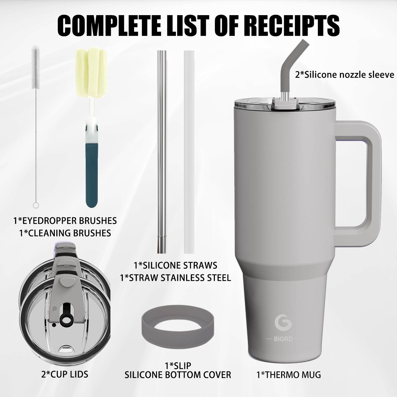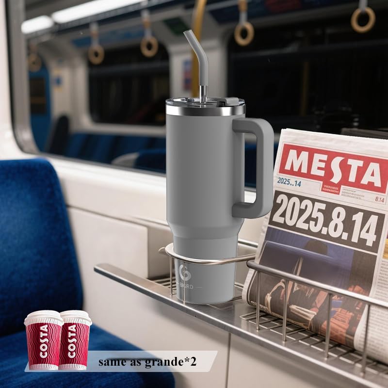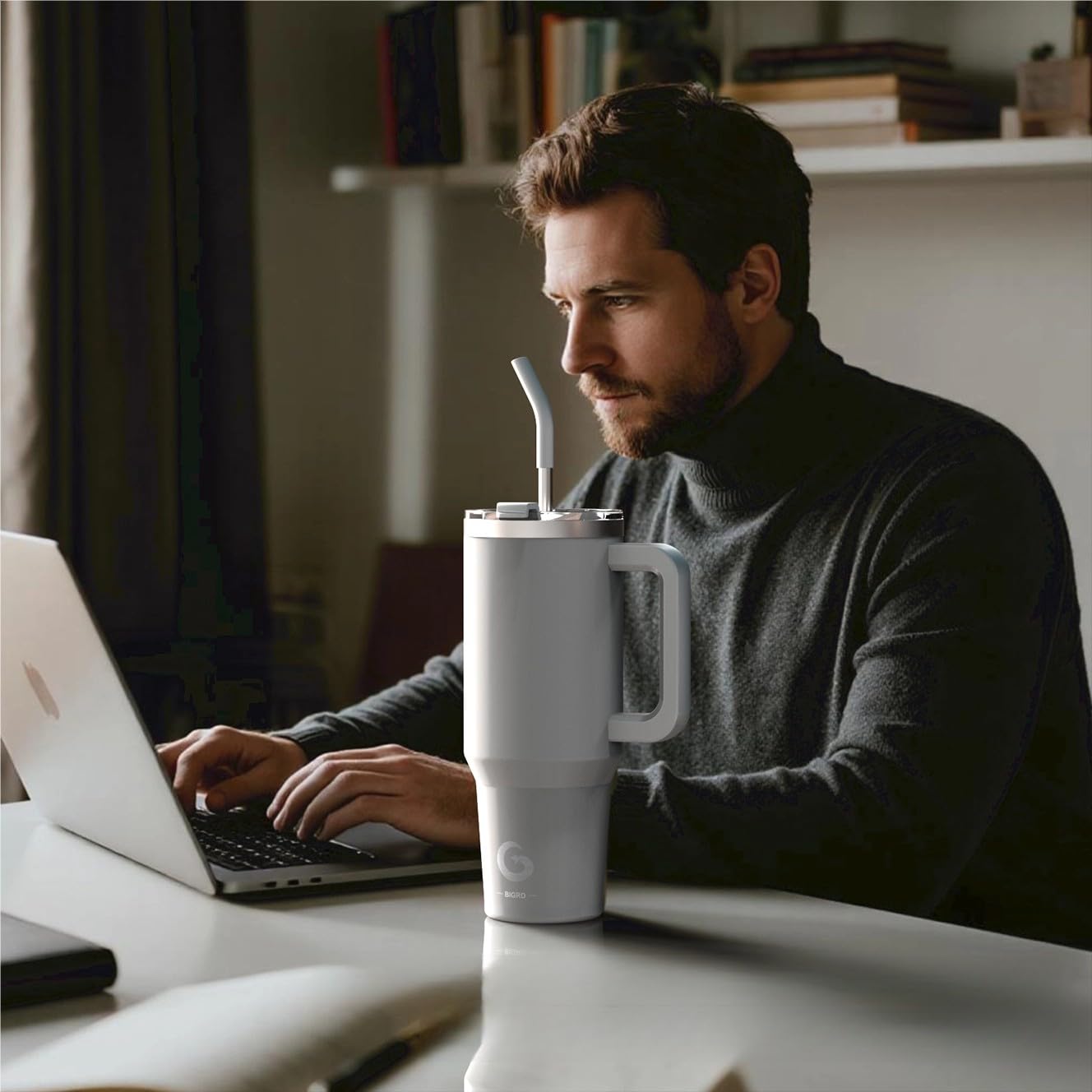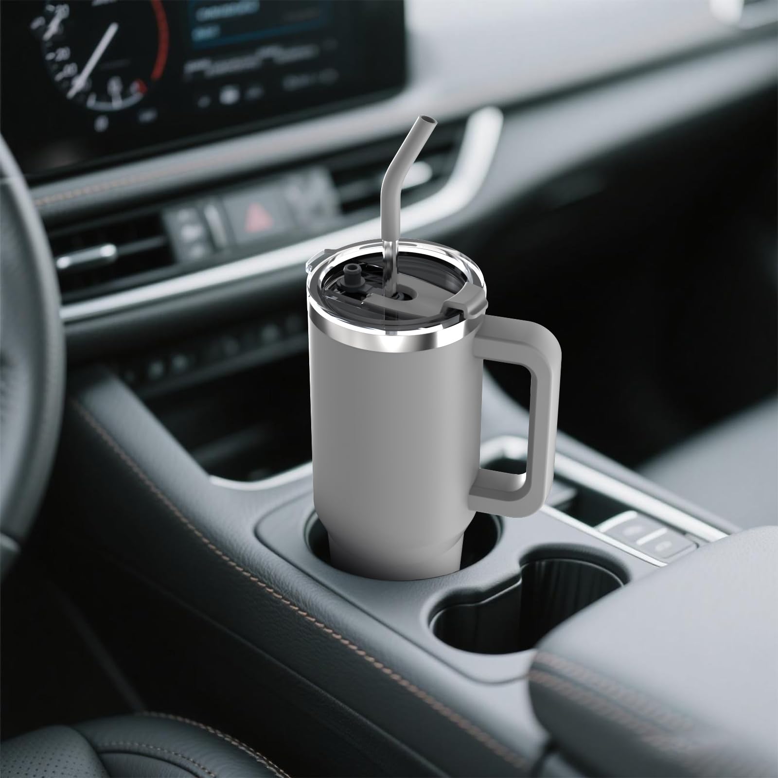 BIGRD 1.13 liter coffee mug to go, thermal mug, vacuum insulated double-walled leak-proof drinking bottle with straws & handle, BPA-free, travel mug for cold and hot (Ash)