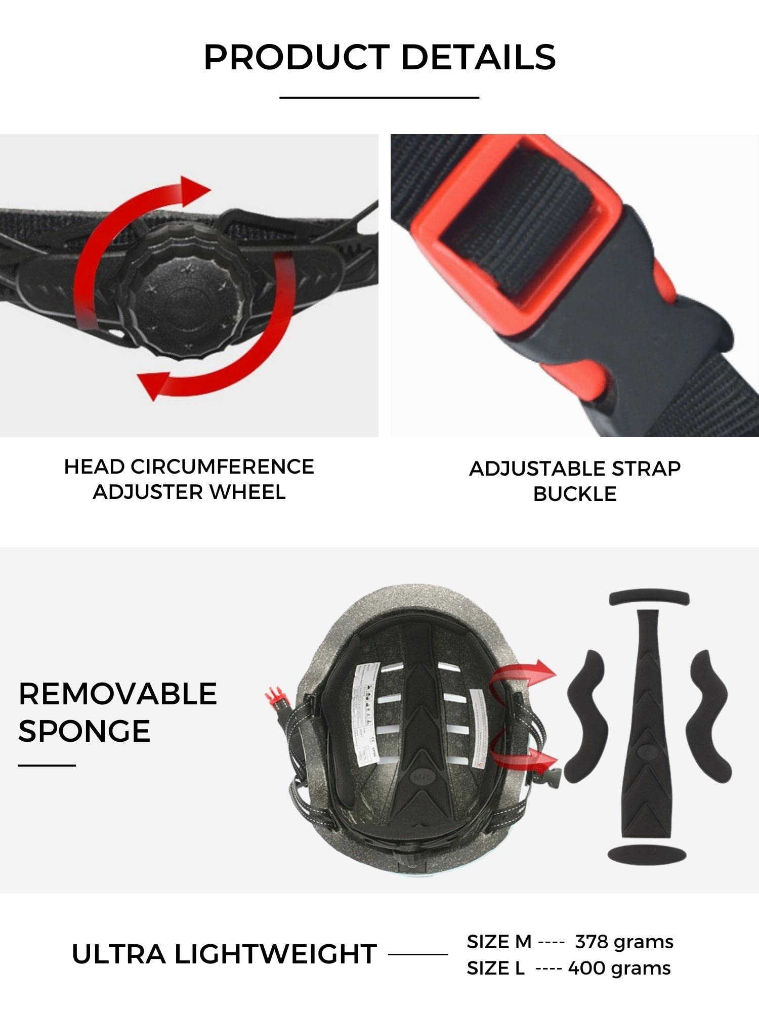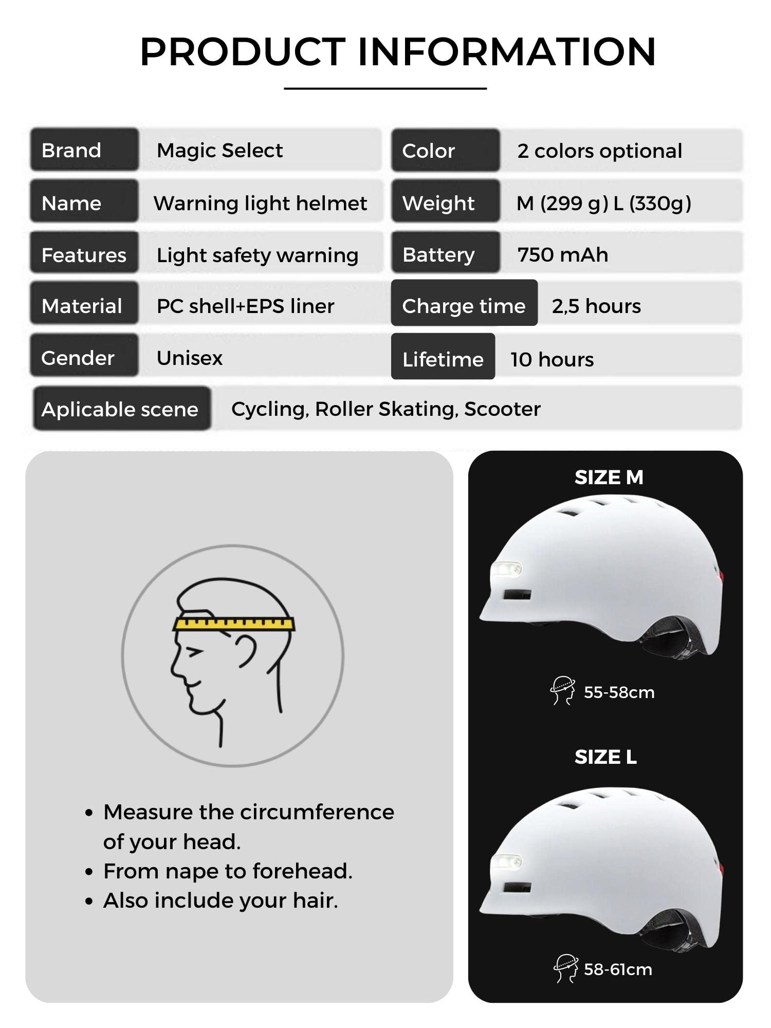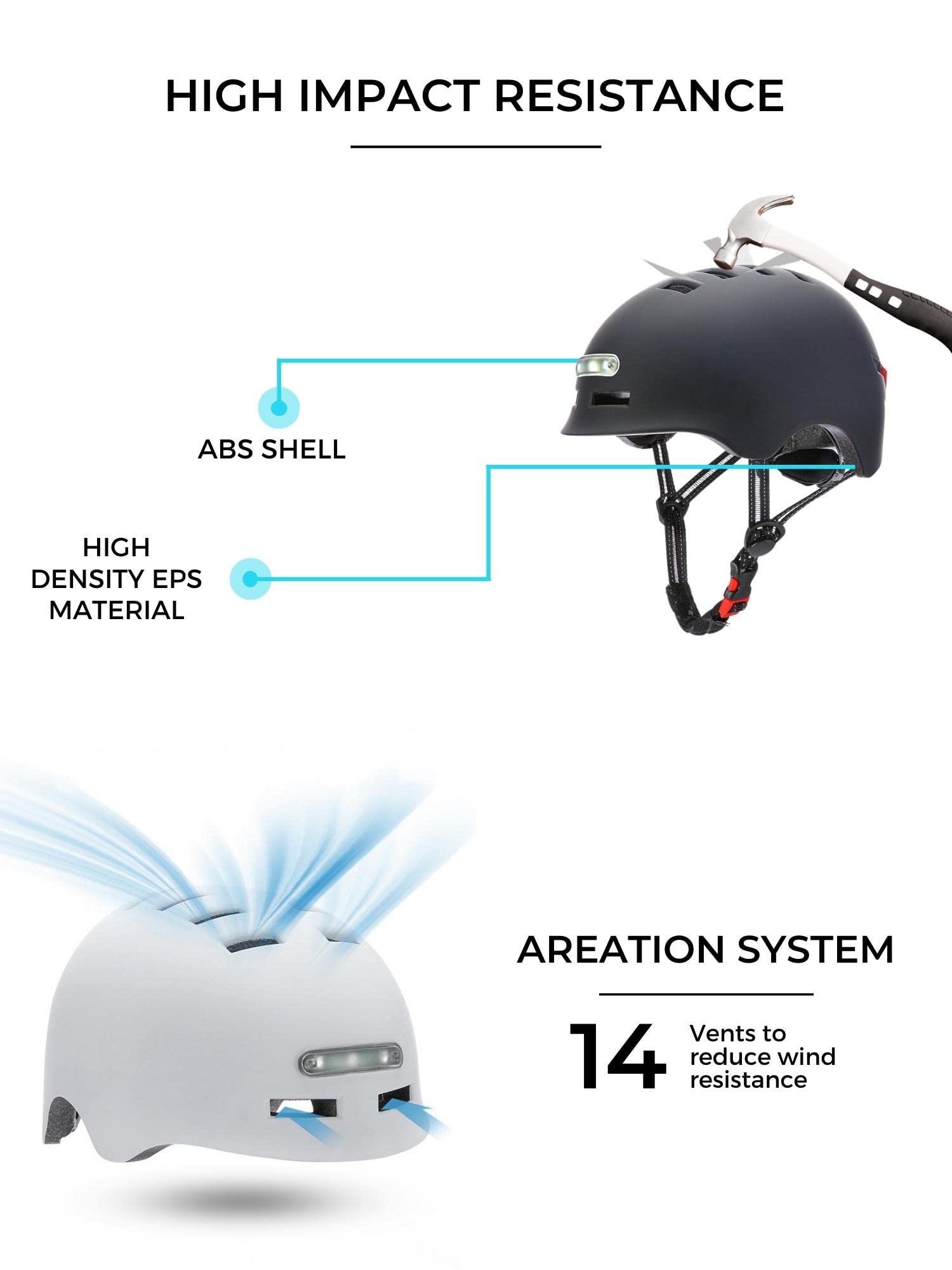 ["BIKE HELMET: Warns you of your presence on the road with its 10 red LED lights on the back, reaching up to 200 meters, and 3 front LED lights illuminating 10 meters of your path. Safe cycling at night.", "LIGHT MODES: MODE 1: BOTH LIGHTS CONSTANTLY ON: Press the rear button 1 time. MODE 2: CONSTANT FRONT LIGHT AND SLOW BLINKING REAR LIGHT, press the button 2 times. MODE 3: CONSTANT FRONT LIGHT AND FAST BLINKING REAR LIGHT, press the button 3 times. MODE 4: FRONT LIGHT OFF AND REAR LIGHT BLINKING, press the button 4 times.", "ADJUSTABLE SIZE: Available in sizes M (head circumference between 55 to 58 cm) and L (58 to 61 cm). Both sizes can be adjusted with the strap buckles and rear circumference adjustment dial; This way you get a better fit to the head for more safety and protection.", "MULTI-PURPOSE: With this helmet, you can safely ride city bikes, motorcycles, electric scooters, skateboards, ice skates, etc.", "SHOCK RESISTANCE: Its PC shell and EPS layer make it resistant to strong impacts compared to helmets from other brands."]