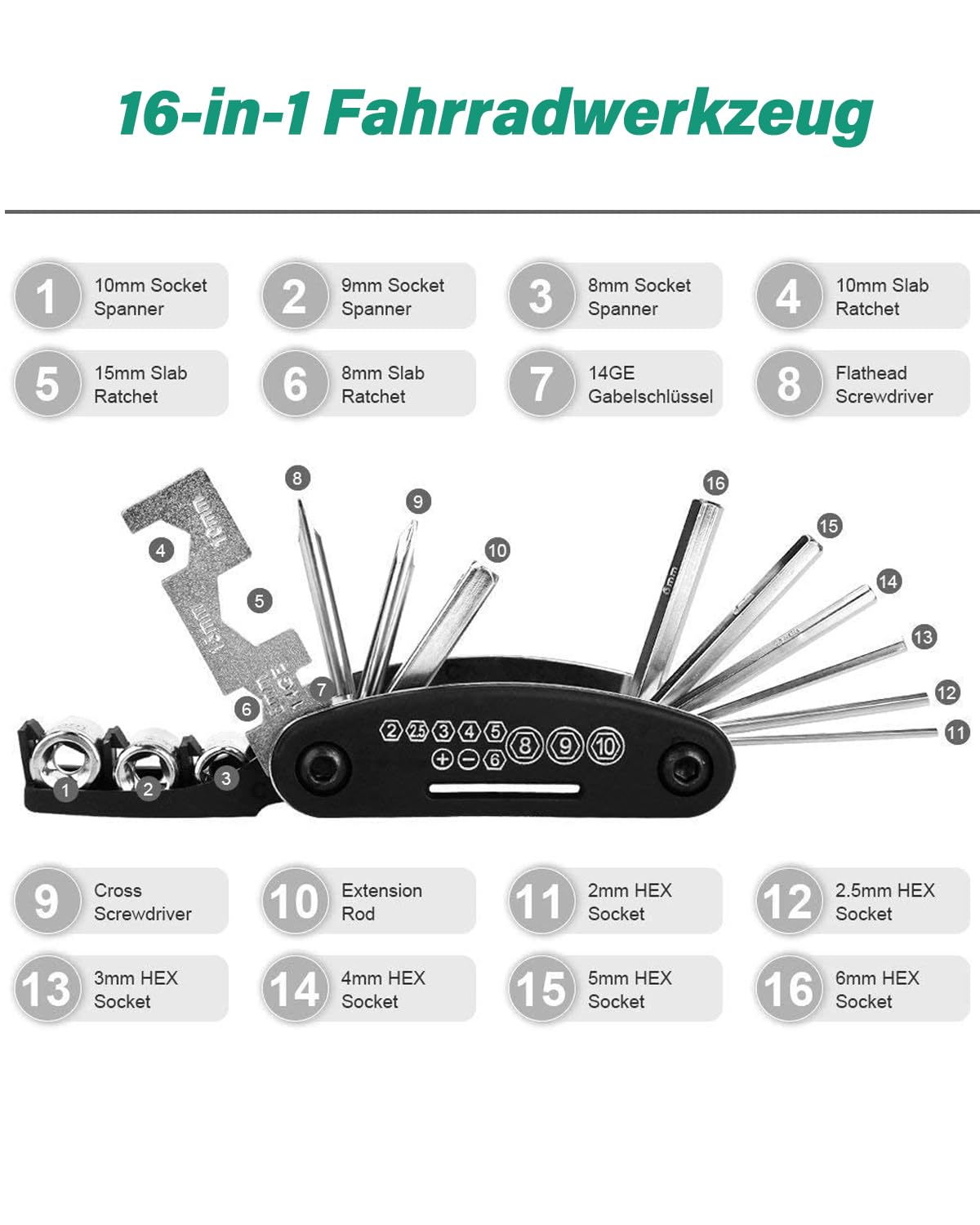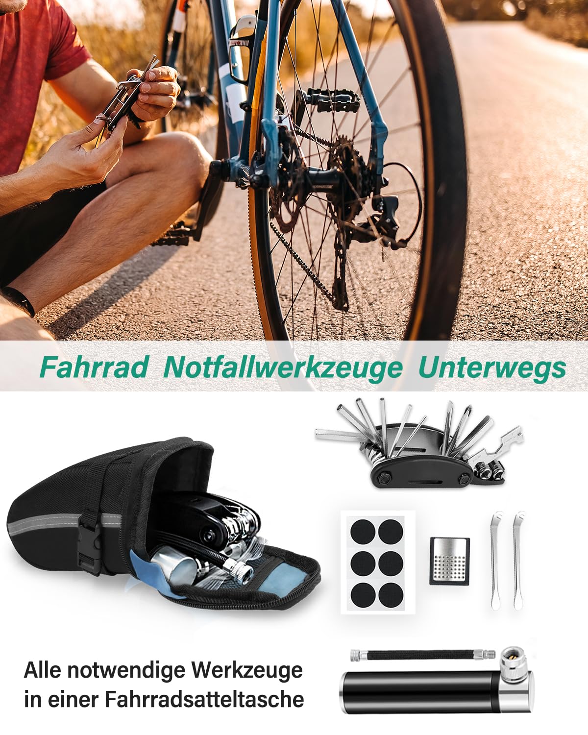["π΄ All-in-One Bicycle Emergency Tool Set | Our comprehensive bicycle repair kit includes a convenient saddle bag, a 16-in-1 multitool, a mini air pump (120 PSI), 2 sturdy stainless steel tire levers, 6 self-adhesive bicycle patches (25 mm), and a metal rasp. Ideal for bicycle emergencies and regular maintenance. Enjoy hassle-free biking adventures!","π΄ 16-in-1 Folding Bicycle Multitool Kit | Made of high-quality steel, sturdy and durable. This bicycle tool set includes 2/2.5/3/4/5/6 mm allen keys; Phillips and flathead screwdrivers, spoke key, socket extension, socket head, and allen keys 8/9/10 mm; solid wrench 8/10/15 mm.","π΄ Practical Bicycle Repair Kit | Contains everything you need for a quick tire repair: 2 stainless steel tire levers, 6 self-adhesive bicycle patches (25 mm), a metal rasp, and a mini air pump (up to 120 PSI). No extra glue needed - simply peel and stick for a quick repair.","π΄ Compact & Reflective Bicycle Saddle Bag | Attaches compactly under the saddle, providing ample storage space for tools, keys, and the mini pump. With highly reflective strips for better visibility at night and a practical taillight holder (taillight not included).","π΄ Versatile Application | This on-the-go bicycle tool set is perfect for bicycles, mountain bikes, and road bikes. A practical bicycle accessory and the perfect gift for cycling enthusiasts to accompany them on any adventure!"]