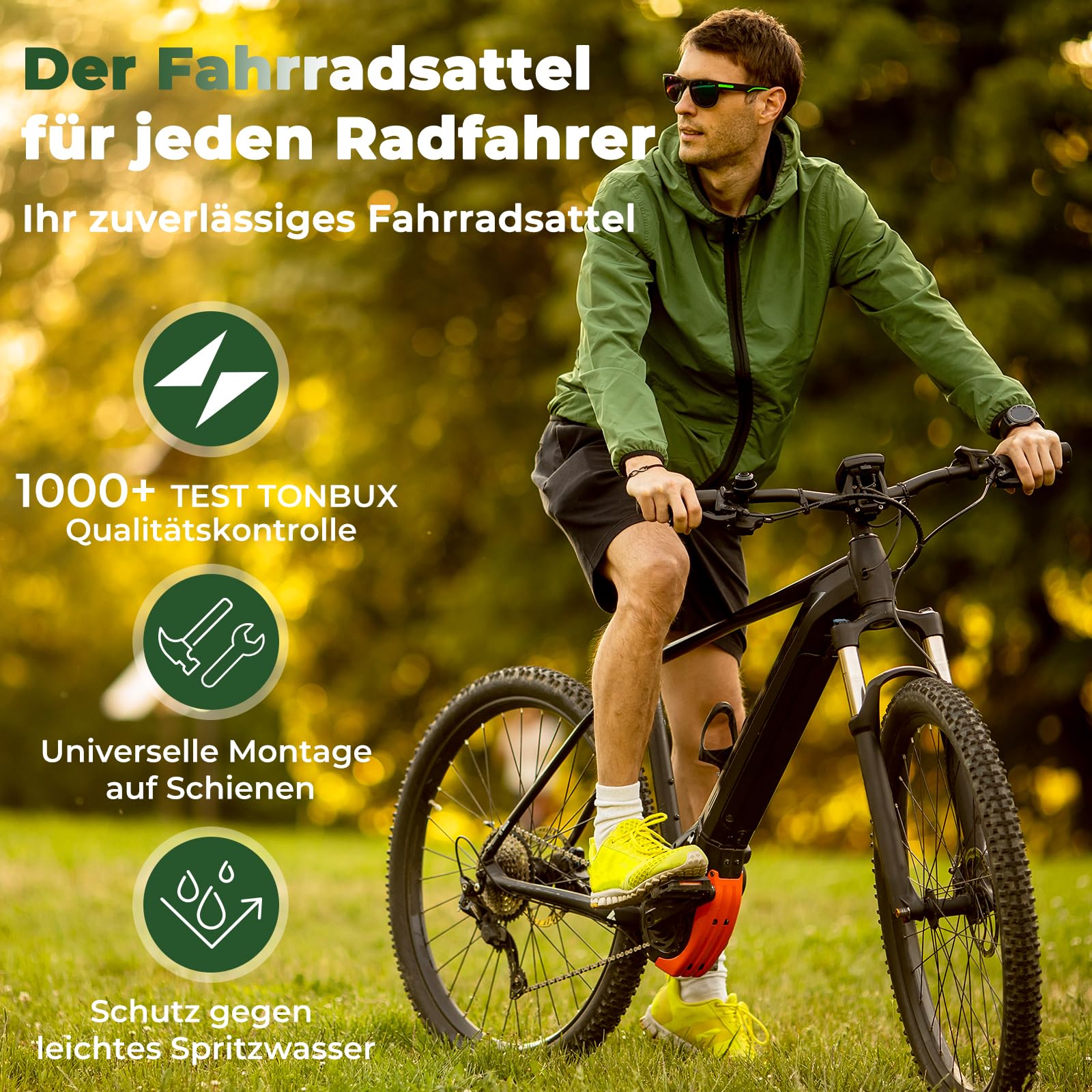 Ergonomic bicycle seat. With an ergonomic and health-beneficial design, the bicycle saddle is suitable for both men and women and fits your intended use, seating position, and upper body posture, allowing you to ride pain-free. The TONBUX saddle has a width of 20 cm, making it best suited for an upright sitting position. It also has a maximum user weight of 120 kg.