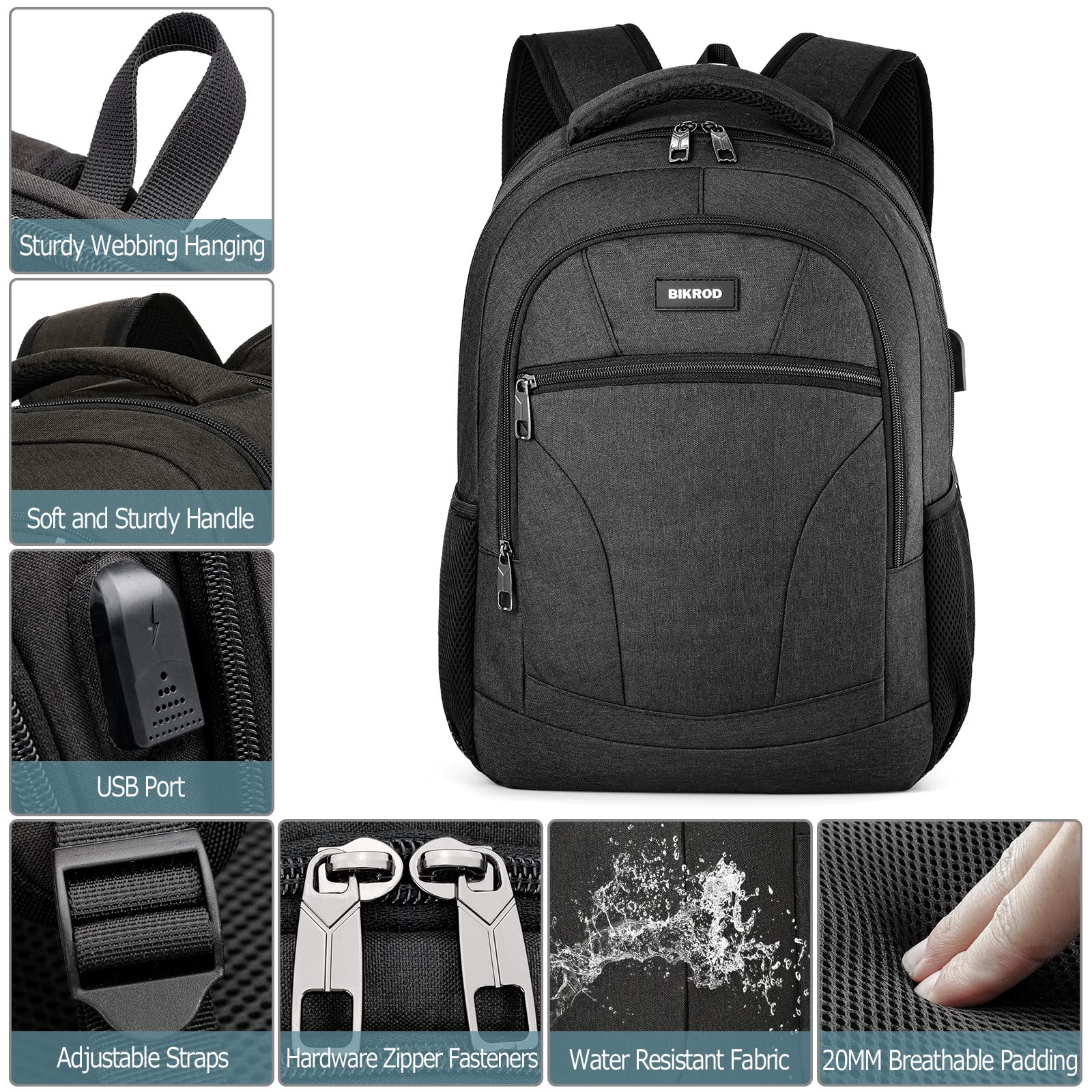 BIKROD backpack for men, school backpack for teenage boys, 15.6 inch laptop work daypack with USB charging port for business, hiking, travel, camping school bag, black