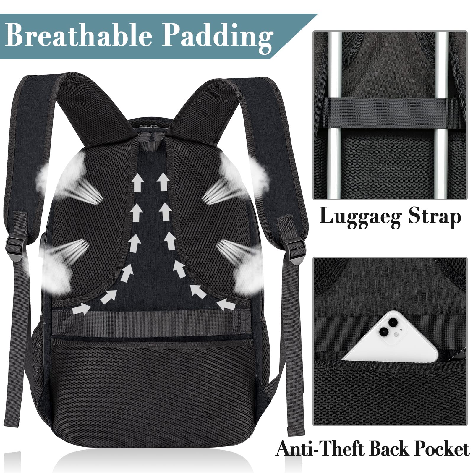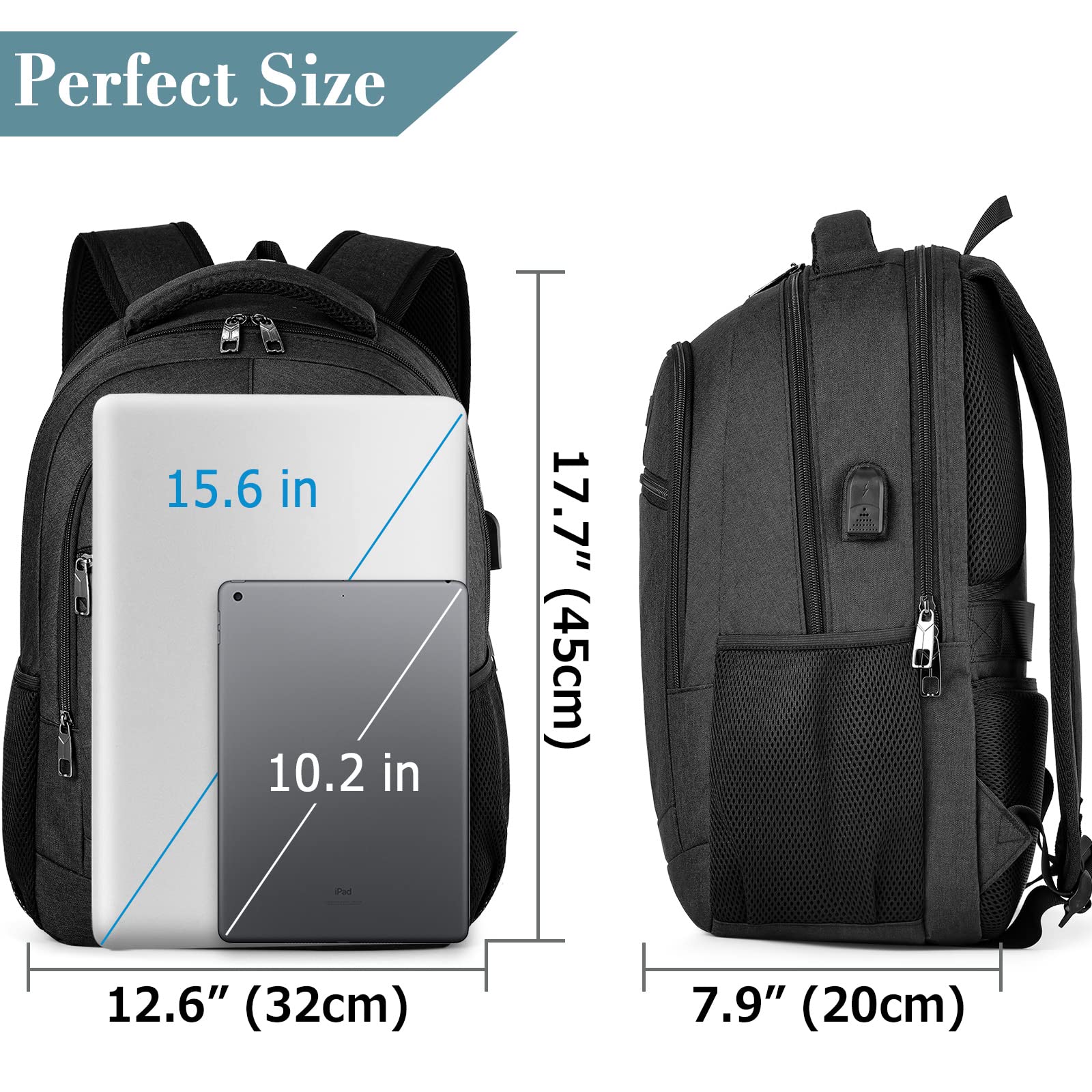 ["Unique Laptop Backpack Design: The laptop backpack for men can easily fit up to a 15.6 inch laptop. A separate padded compartment with velcro closure protects your laptop all around. There is also a compartment for your office accessories such as notepad, iPad, Bluetooth keyboard, wireless mouse, etc. Meet your work, travel, school, hiking, and other needs.","Usb port & Anti theft: With hidden back pockets, our anti-theft backpack for men provides private space and protects your valuables from thieves. The integrated USB port is convenient for safely charging your phone via the connected power bank. (Power bank not included).","Waterproof & Luggage strap design: Made of durable and high-quality waterproof fabric to protect your belongings from wetness on rainy days. The luggage strap design on the back allows you to place the school backpack directly on the luggage and free your hands. Breathable mesh shoulder straps relieve shoulder pressure. It is also a great option for air travel and business trips and fits perfectly under an airplane seat.","HIGH QUALITY MATERIAL: Made of durable and high-quality waterproof fabric. Product size: 17.8" x 12.2" x 7.9" / 31 x 20 x 45.5 cm (LxWxH). Weight: 1 kg. Backpack capacity: 20-35 L.","Multipurpose Daypack: This laptop backpack is large and durable, perfect for college, travel, business, daily use, and outdoor activities. The daypack suits many occasions. Unisex for men and women, it is a great gift for Valentine's Day, Thanksgiving, or Christmas. Also the best gift choice for father, mother, husband, son, friends"]