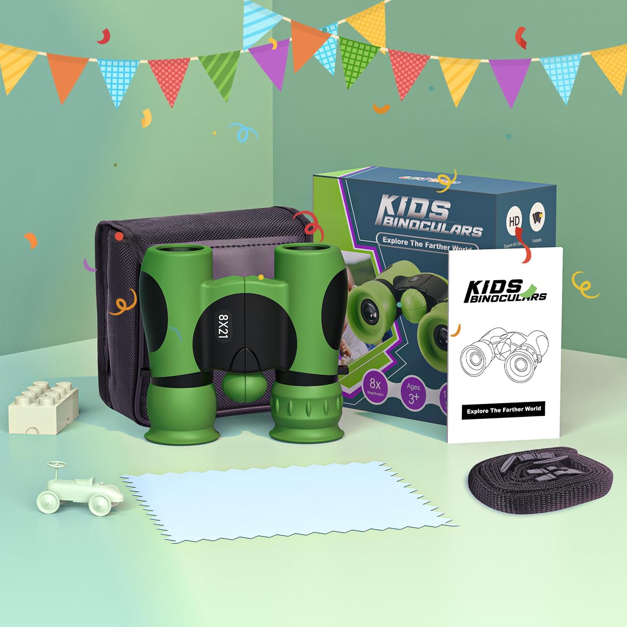 ["Premium Material --- High-quality optics with 8x magnification and roof prism system for bright, sharp, crystal-clear images. Best for bird watching. Real kids binoculars for boys and girls.", "Safe for Kids --- Binoculars for kids easy to focus. To protect the eyes, there are soft rubber-surrounded eyepieces, so kids won't hurt their eyes or face.", "Shockproof Design --- Soft rubber surrounds the lens better in case of drops. You don't have to worry about the quality. Each binocular is rigorously tested before being sent to your hands.", "Fosters Curiosity for Kids --- Kids can learn and explore ideal for nature adventures like hiking, camping, bird watching and spotting, sports events. Promotes curiosity, exploration, and outdoor family time.", "Best Gifts for Kids - High-quality gift box makes this the best gift or gift set for kids. Great birthday or holiday gifts for boys and girls."]