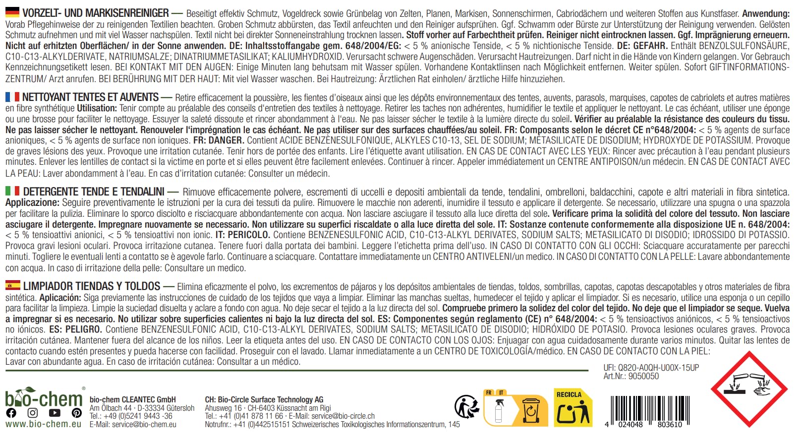 Bio-chem awning and awning cleaner - efficient special cleaner with deep action - ideal for awning, tent, sail, tarpaulin, gazebo, parasol - 3x 500 ml - Made in Germany
