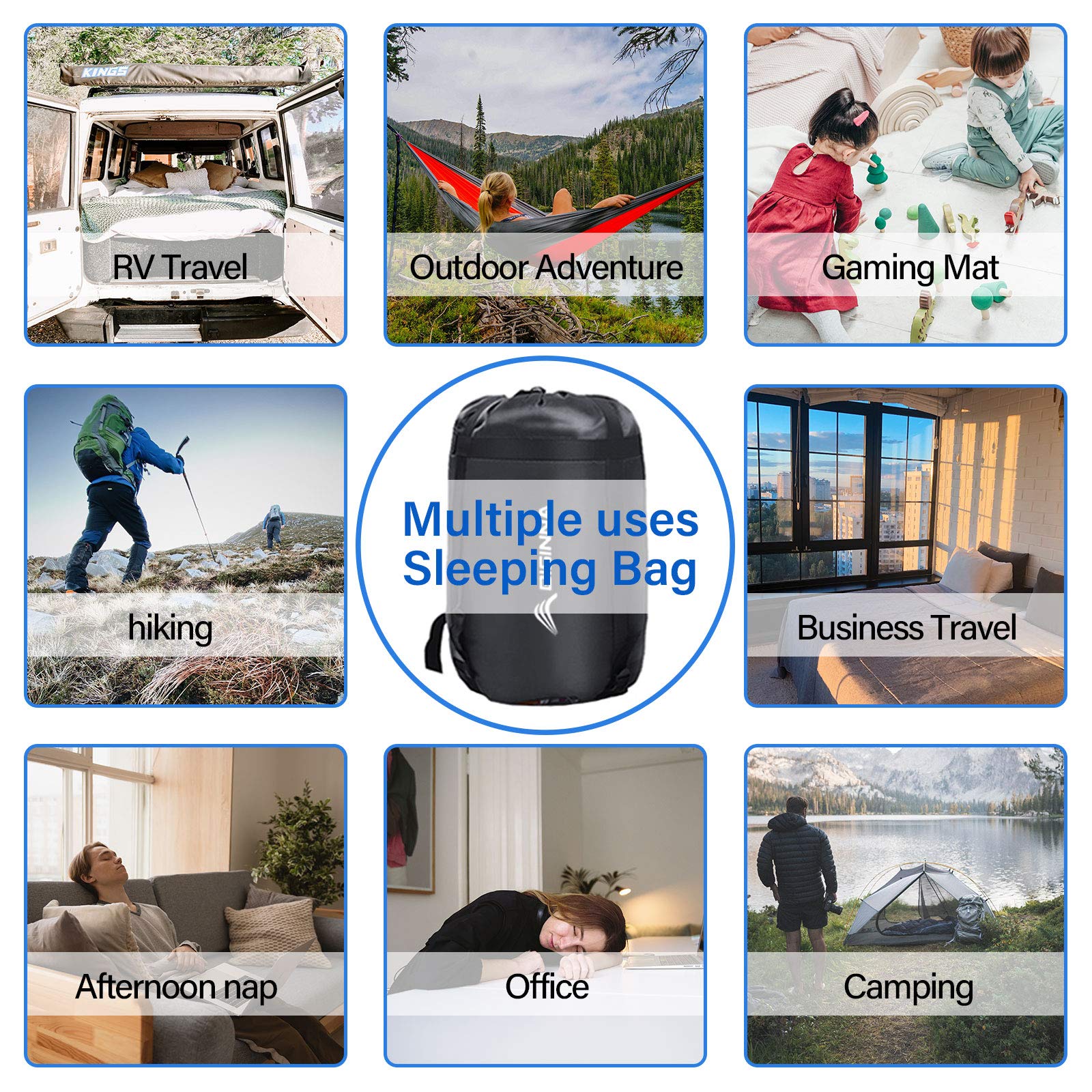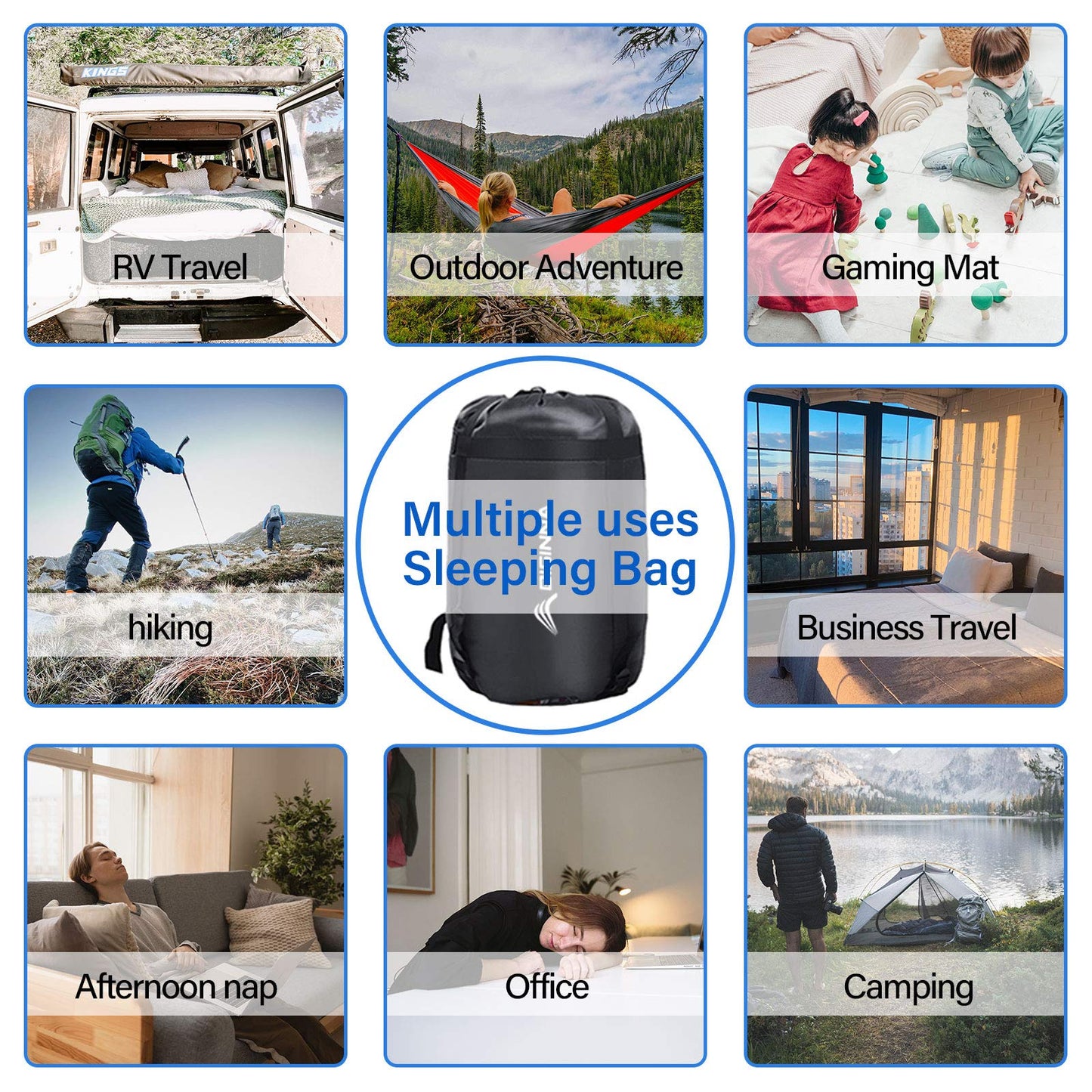 ["Skin-friendly and Waterproof"] The surface of the sleeping bag is made of 210T polyester and hollow cotton as filling, making it soft, comfortable, skin-friendly, and waterproof, allowing you to recover from a strenuous day of hiking, camping, traveling, outdoor activities, or other explorations.