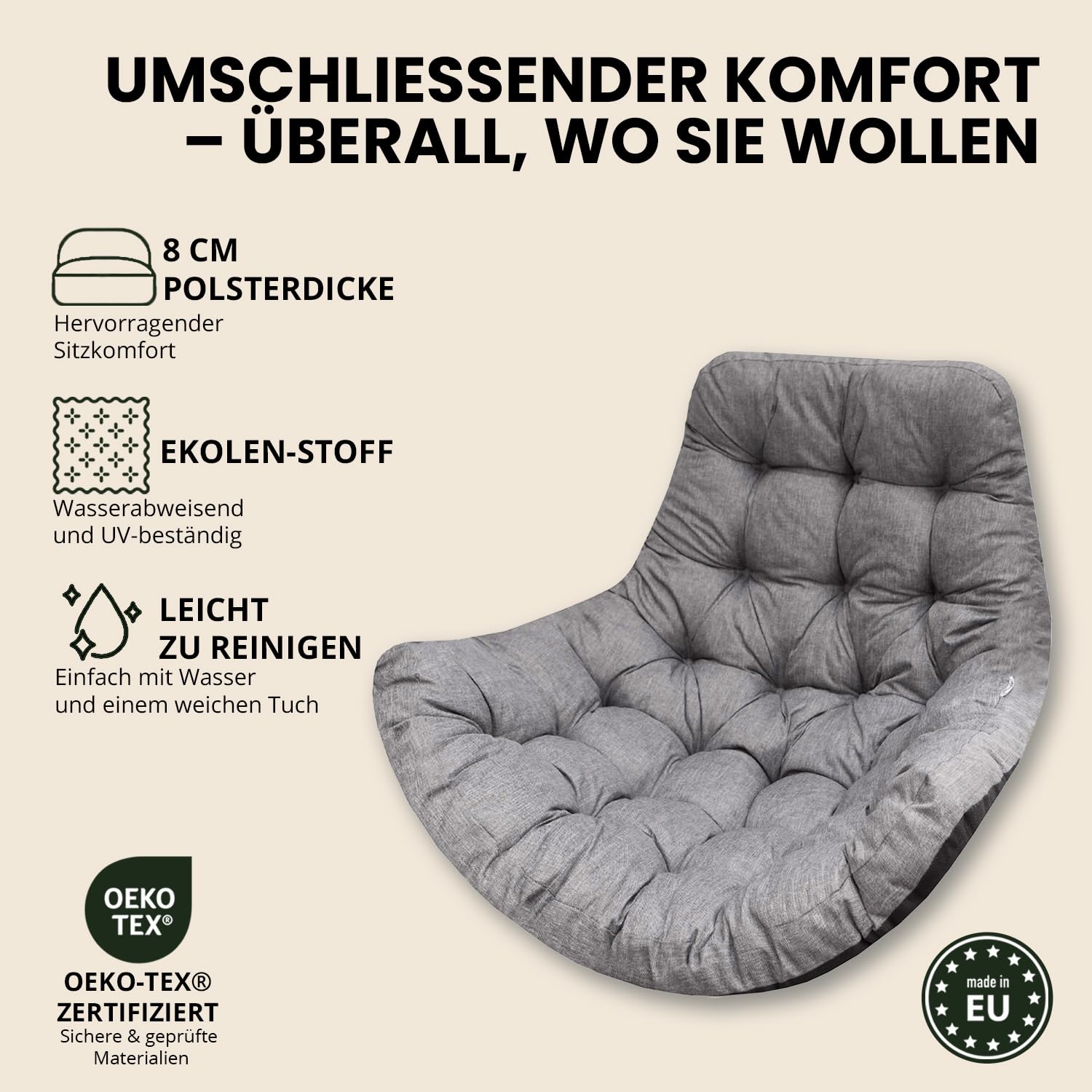 ["Suitable for most hanging swings made of polyrattan and rattan", "Made in the US - all materials used for production are safe and have ÖKO-TEX certificates.", "Our seat cushion is easy to care for, cleaning only requires water and a soft cloth. However, you can also wash the product entirely by hand or with the addition of cleaning agents.", "UV resistant - the color of the material lasts a long time.", "Weatherproof - The garden cushions are water repellent, a little rain won't harm them. Water remains on the surface of the material for some time."]