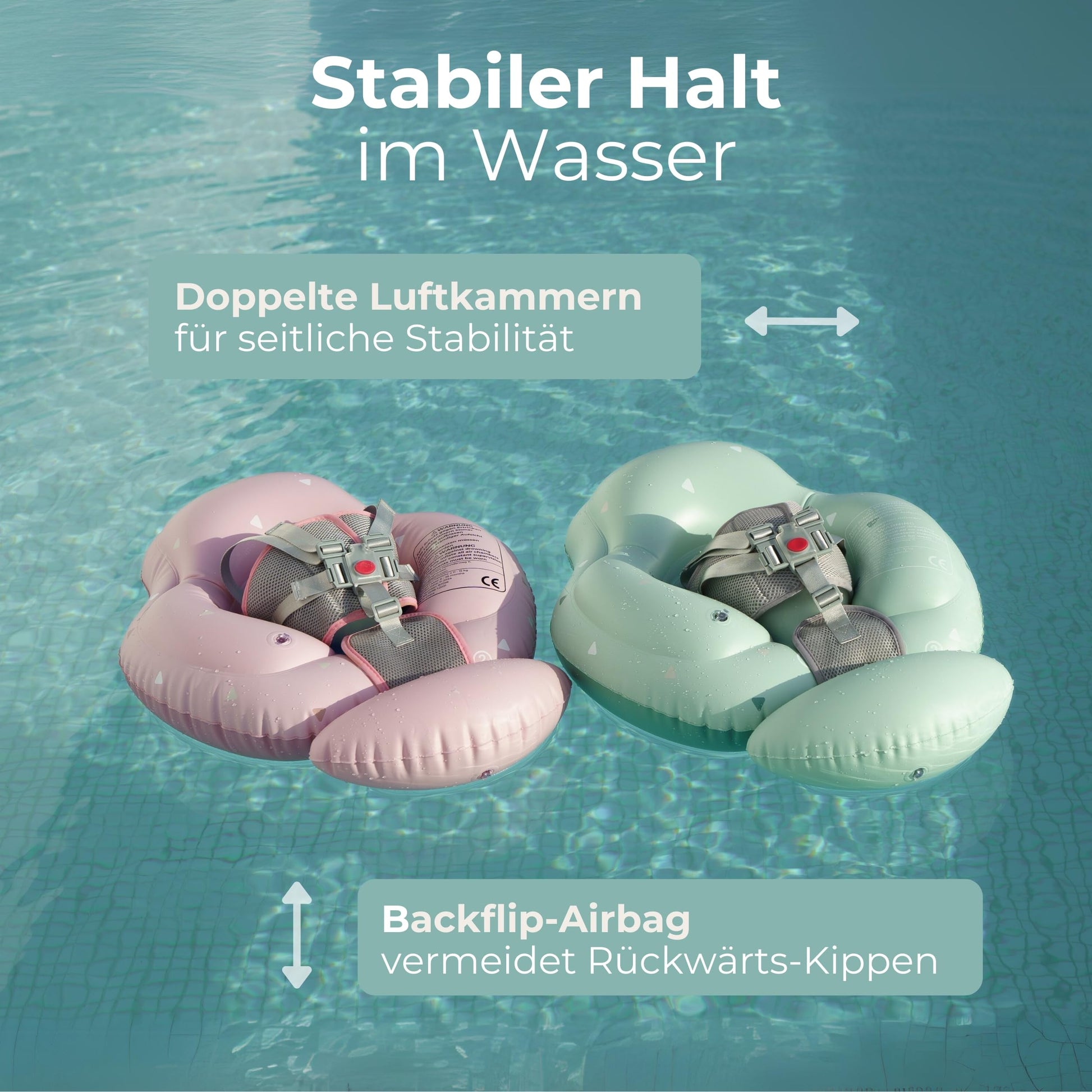 STABLE SUPPORT IN WATER – The baby swim ring with 5-point harness, double air chambers & Anti-Backflip Airbag prevents tipping or slipping through. For carefree water acclimatization & safe splashing.