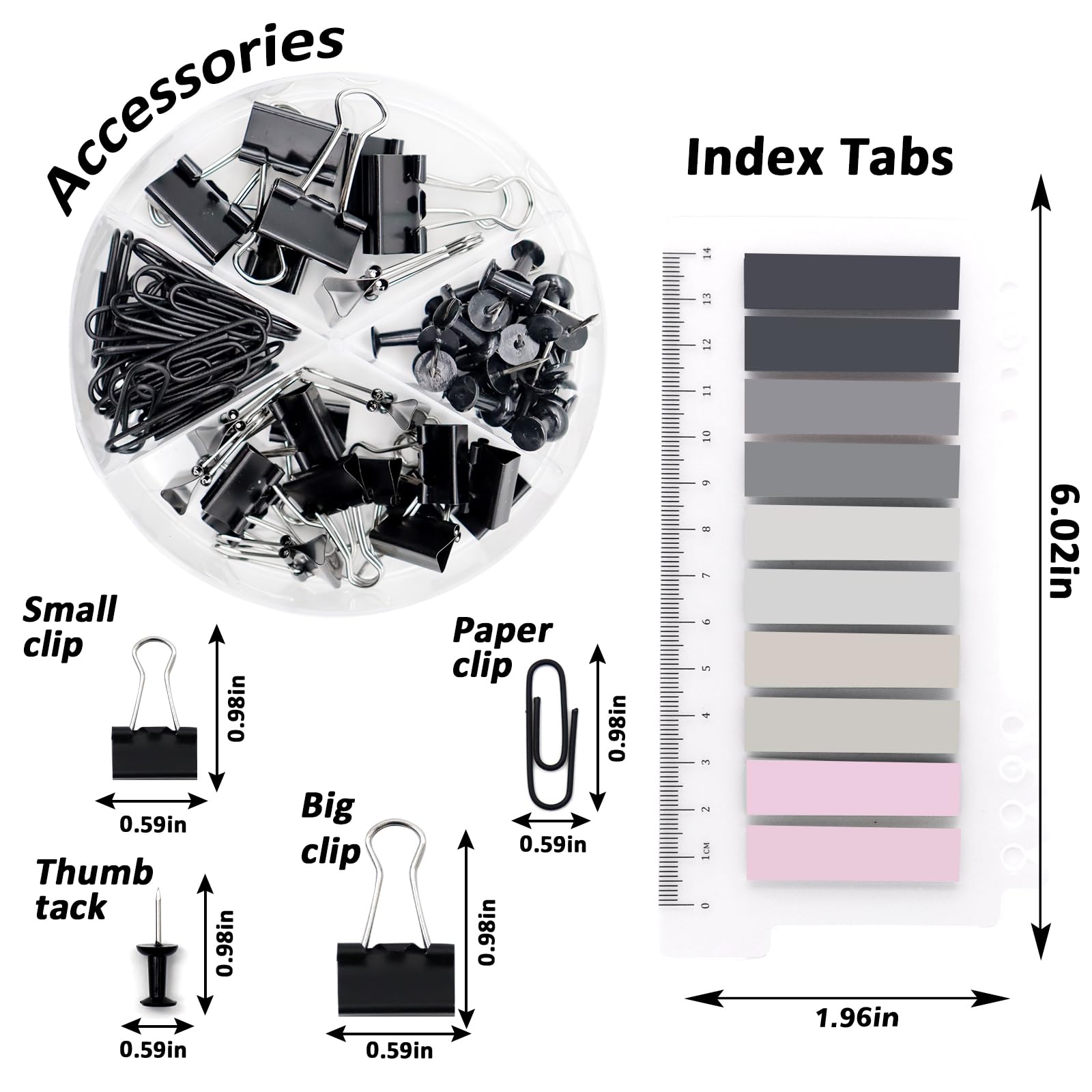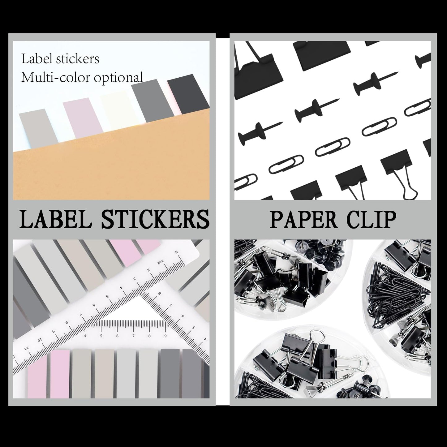 "Package includes: This black office accessory set includes 1 x 6.4 inch large staples, 1 x staple remover, 1000 x staples, 1 x tape dispenser, 1 x office scissors, 25 x push pins, 10 x large clips, 20 x small clips, 45 x paper clips, 10 colored tabs with ruler. Such a complete black desk accessory combination can meet your daily office and study needs.