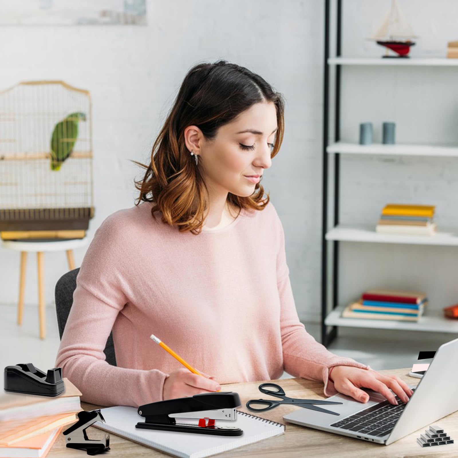 "High-quality material: Stapler and tape dispenser set made of high-quality hard plastic and metal, feels smooth and comfortable, sturdy and durable. The large black stapler can bind 50 pages at a time, which is very suitable for office use. The uniform black desk accessory design makes your desk look neater and more convenient.