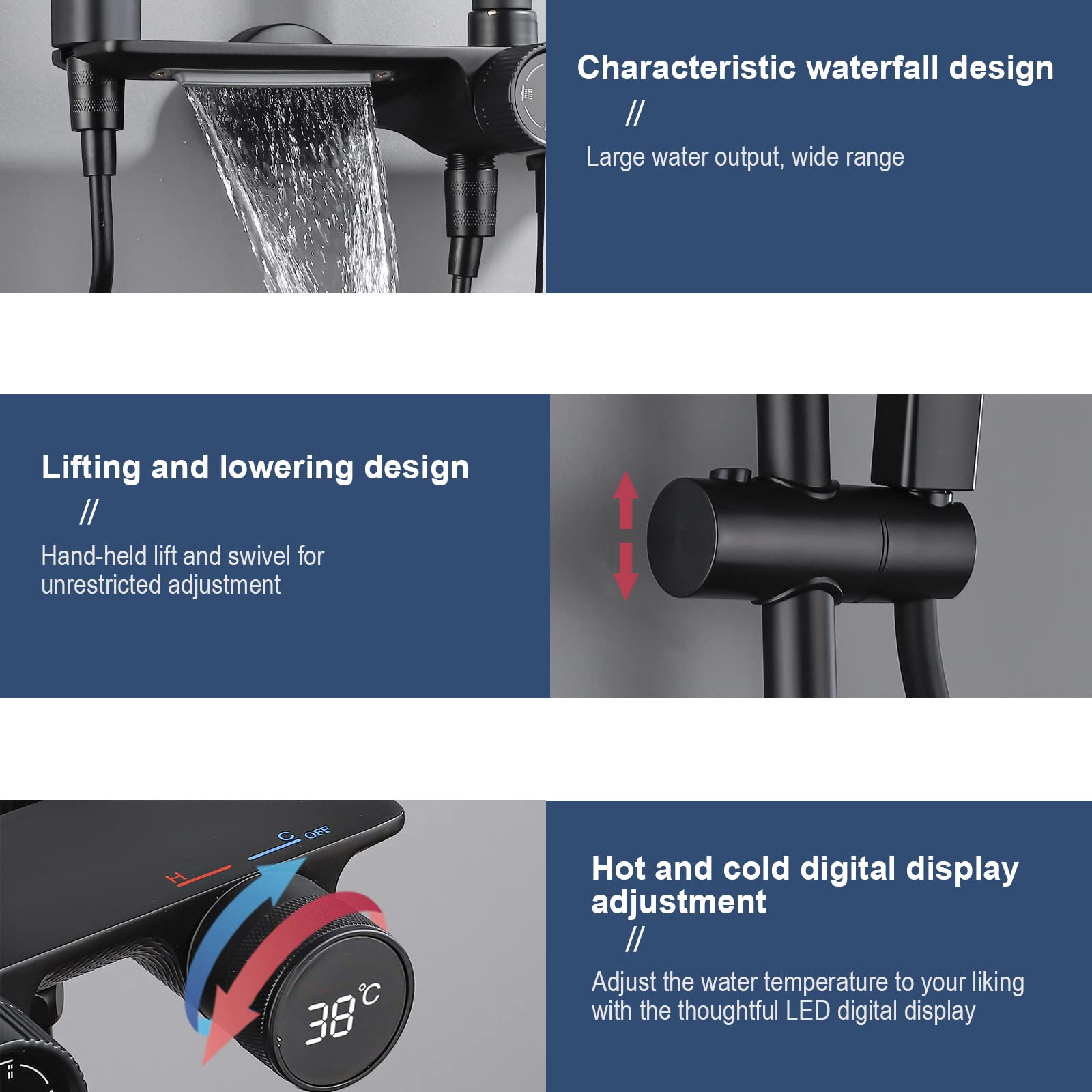 ["Temperature Visualization】The LED display shows the water temperature so you can always know the water temperature of the water heater. Help you find the shower water temperature that is best for you. (Non-thermostatic)","【Adjustable Models】The four water outlets are functional: overhead shower, regular shower, faucet, and booster gun outlet; switching between water outlets is easy with the push-button switch.","【Shower Rod+Shelf】Height-adjustable shower rod made of rust-free 304 stainless steel, easy to clean. with an integrated shelf made of thickened ABS for toiletries.","【Wash Away Fatigue】The 31.5*21CM ultra-thin overhead shower with large format can be freely adjustable in angle and is perfect for relaxing after a long day of work, washing away stress and fatigue.","【Excellent Quality】The body made of thickened fine brass. The explosion-proof stainless steel hoses are rust-free and tangle-free, making them durable.","🚿【Note】Minor errors may occur in the temperature value of the digital display."]