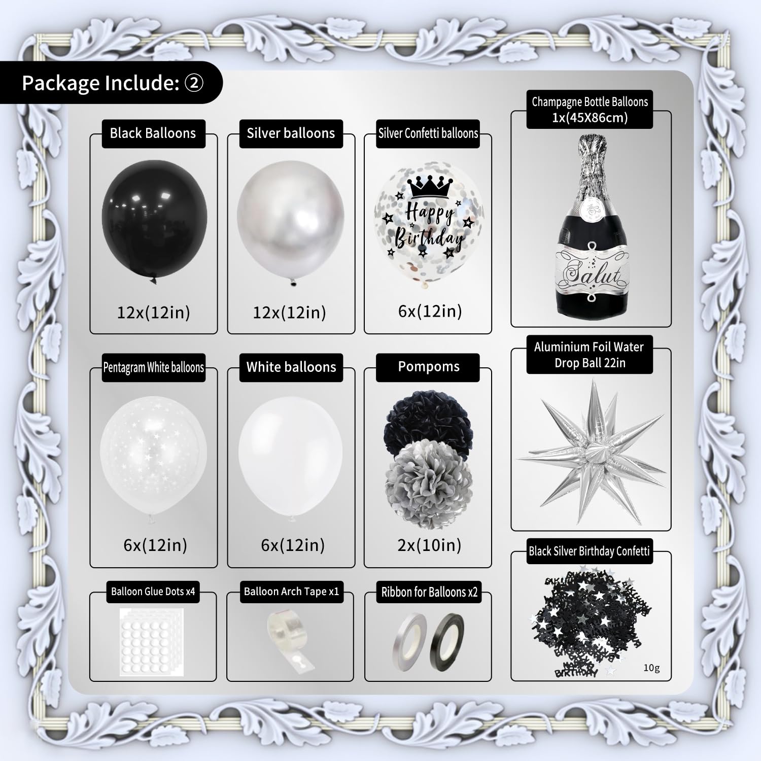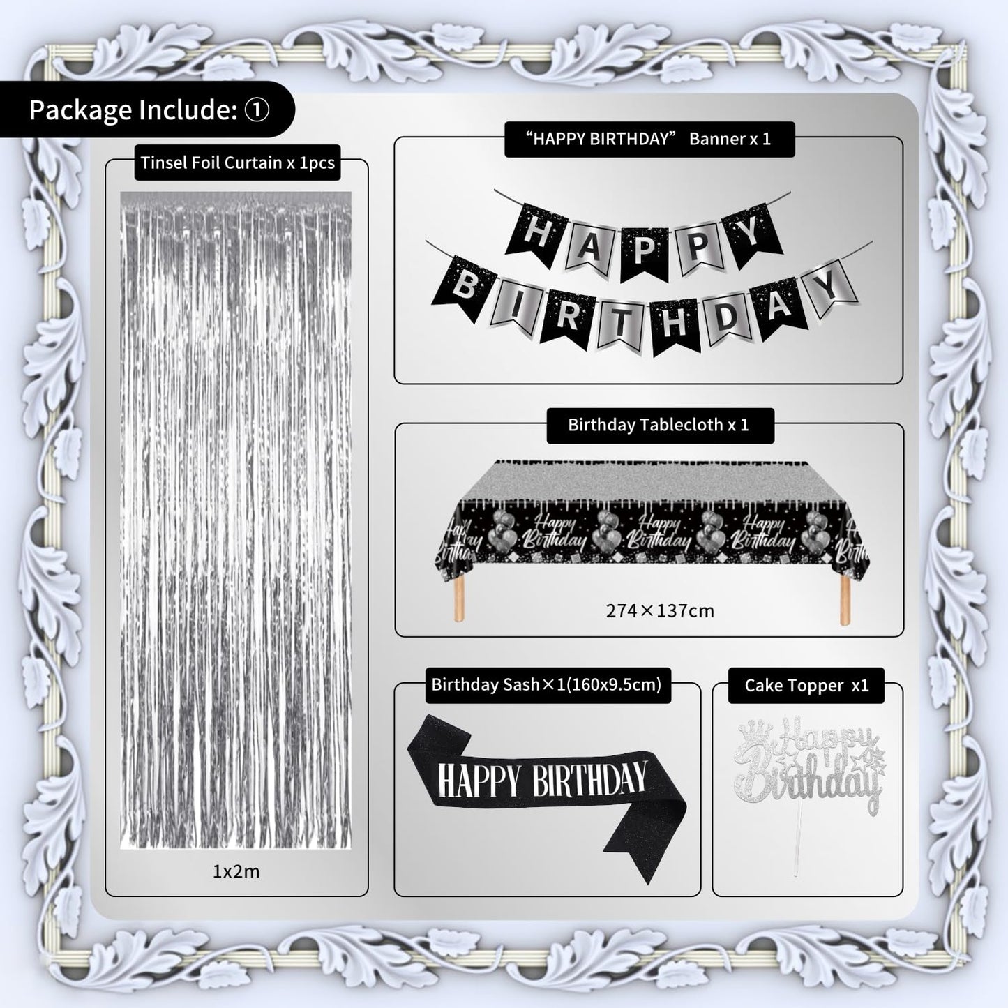 "【Black Silver Birthday Decorations Set】Includes 1* Happy Birthday Banner, 1* black birthday sash 160 x 9.5cm, 1* black silver tablecloth 274 x 137cm, 1* silver rain curtain 1 x 2m, 12* black balloons 12\", 12* silver balloons 12\", 6* white balloons 12\", 6* white pentagram balloons 12\", 6* silver confetti printed balloons 12\", 2* foil balloons, 2* paper pom poms,1* Happy Birthday Cake Topper, 10g gold confetti, 2* 10m ribbon, 1* 16ft balloon chain, 4 piece adhesive."