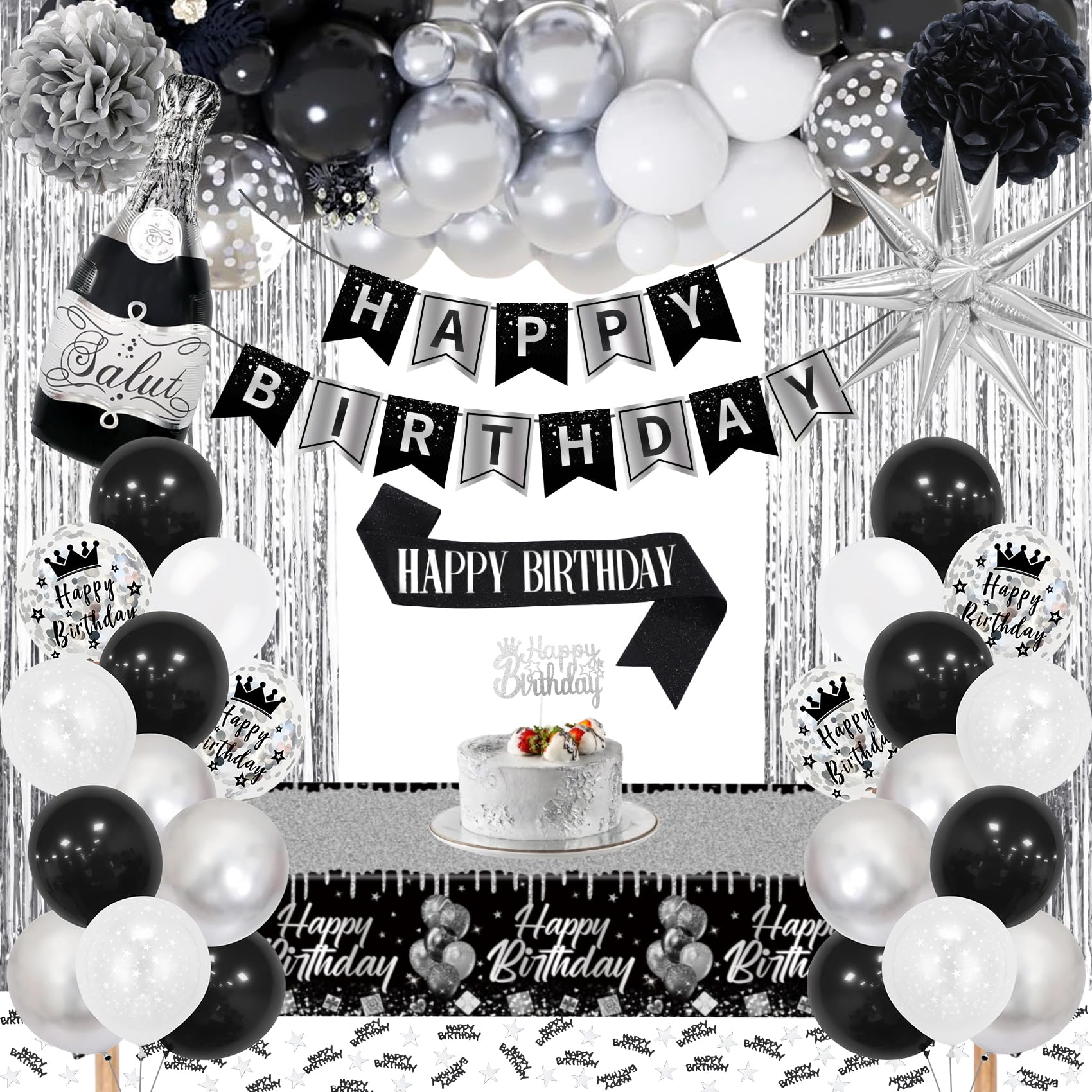 Black Silver Birthday Decorations, Silver Black White Party Decor Set with Happy Birthday Banner, Confetti Balloons, Sash, Tablecloth, Curtain, Pom Poms for Men Women Boys Girls Birthday Party Decor.