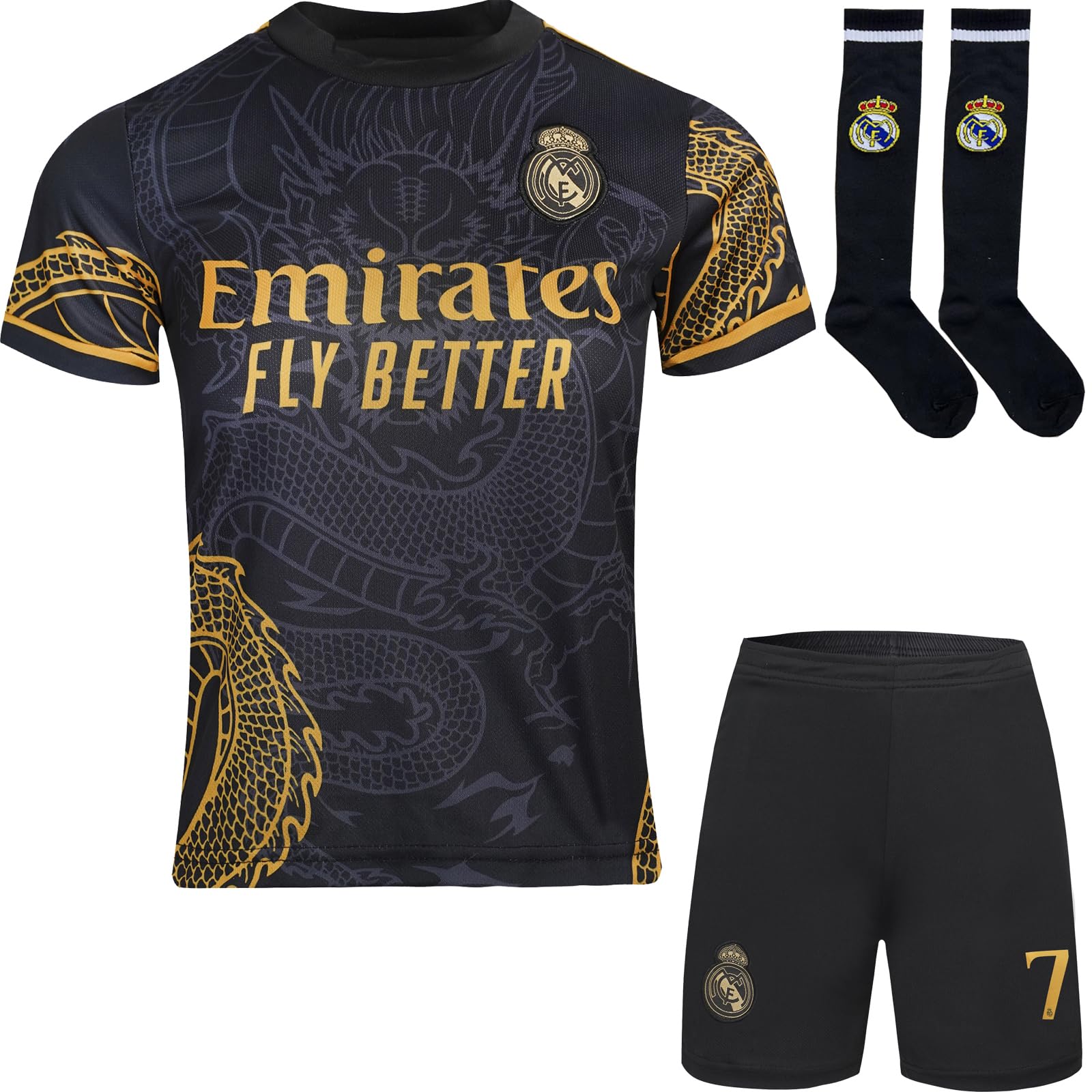 BlackAzat 2023/2024 Madrid #7 Vini Jr. Vinicius Kids Soccer Jersey Special Golddragons Edition, Shorts Socks Youth Sizes (Black, 24)