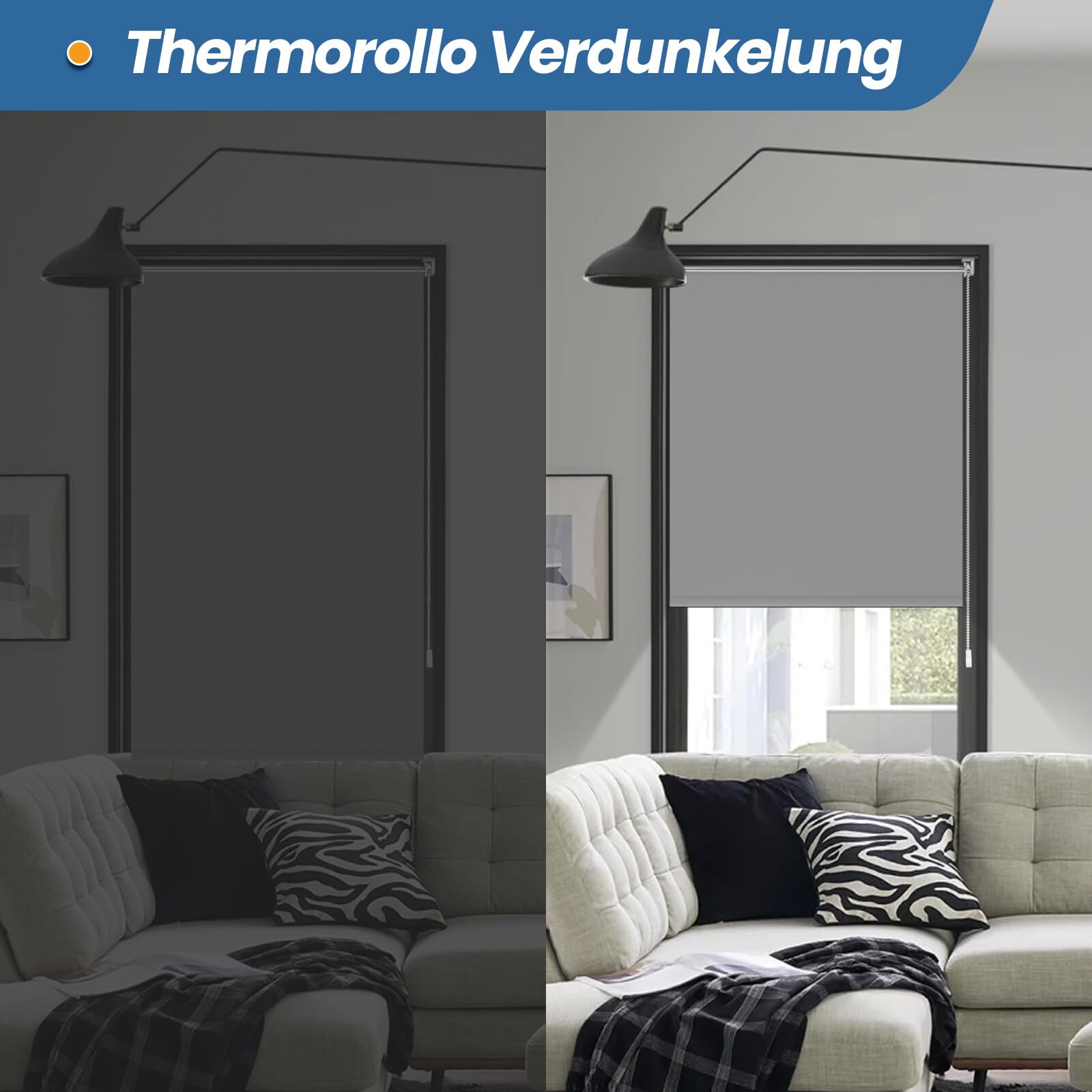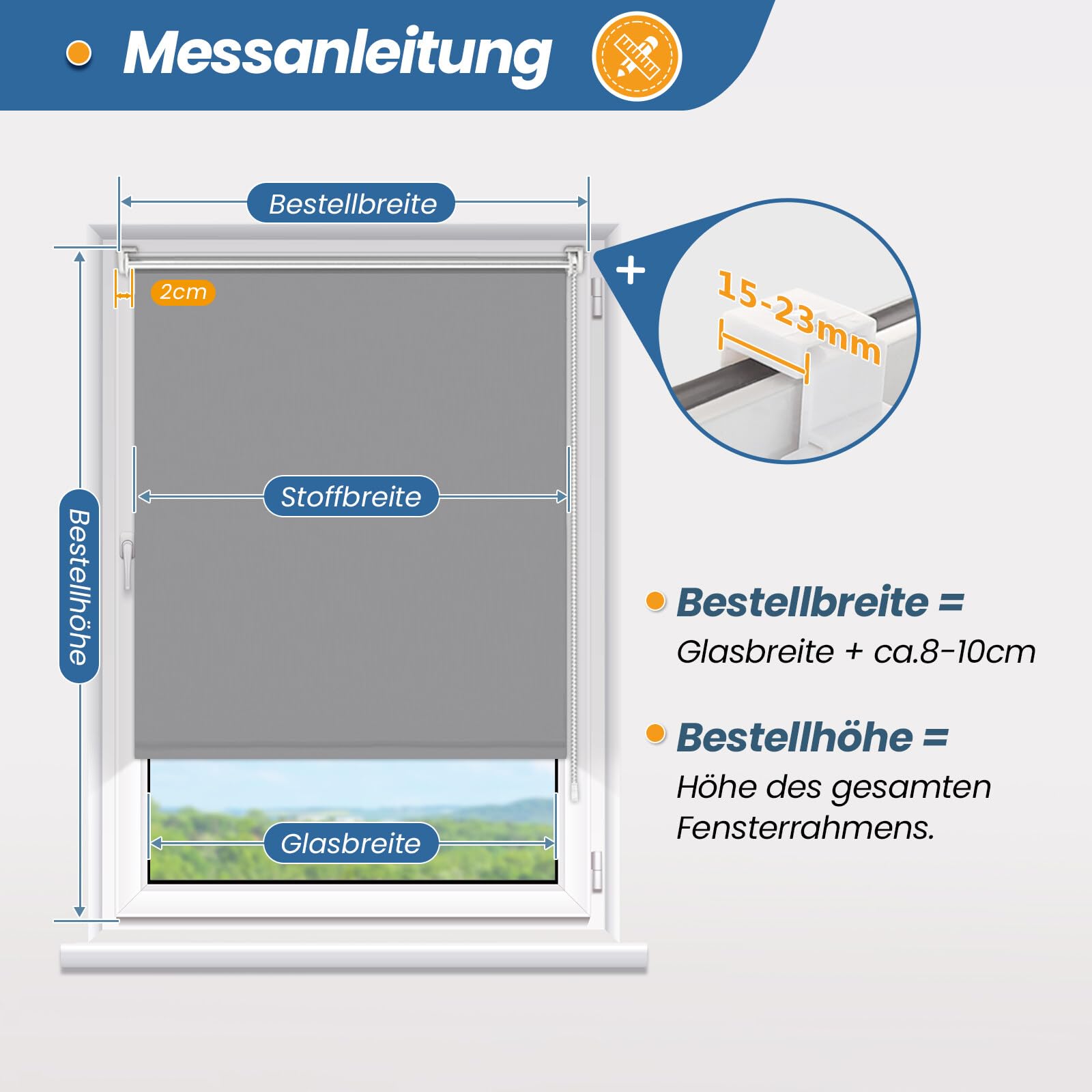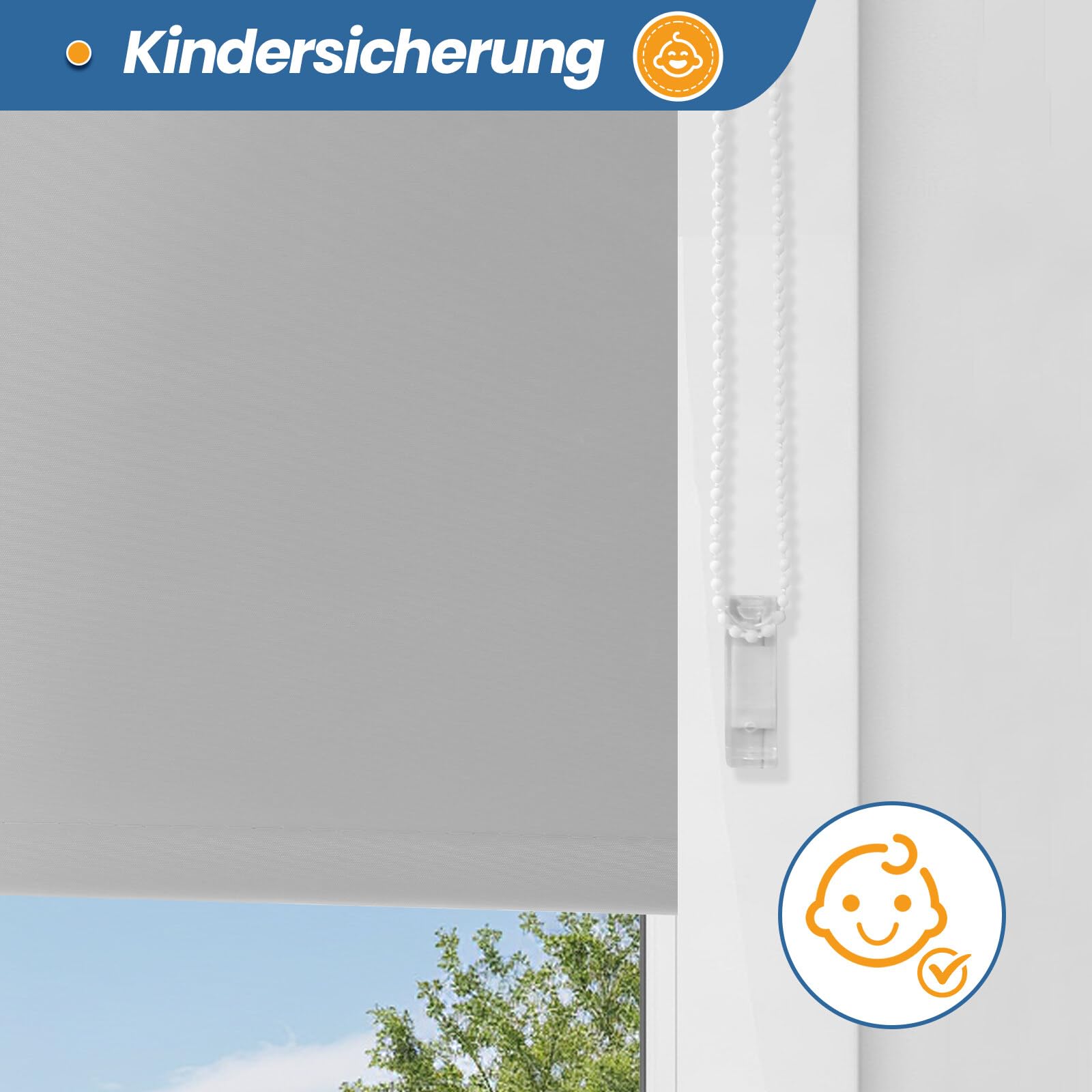 ["Size Info - Important Before Buying! The specified order width is the total width including brackets, not the fabric width! The fabric width is approximately 5 cm narrower than the order width (e.g. 80 cm order width → approx. 75 cm fabric width). Please measure your glass surface and add about 4-5 cm on each side for optimal privacy protection","Effective Sun & Heat Protection The sun protection roller blind is made of 100% easy-care polyester. The silver thermal coating on the back reflects sunlight effectively and helps to regulate the room temperature comfortably","Blackout & Privacy With the chain drive, the blackout roller blind can be continuously adjusted - so you can control the light entry as desired. Ideal for bedrooms, living rooms, children's rooms, and more","Child- and pet-safe design The chain drive can be flexibly mounted on the left or right - as it suits you. For added safety, the chain drive is equipped with a child safety device - ensuring the chain remains securely tensioned and does not dangle loosely. Especially important if there are children or pets in the household","No-Drill Installation (or with) Thanks to the supplied clamp brackets, quick installation on the window frame (thickness: 1.5-2.3 cm) without drilling is possible. Alternatively, the thermal roller blind can also be attached with screws to the wall or ceiling. Not suitable for skylights, wooden windows, or fixed windows","Included in Delivery 1 x blackout roller blind; 1 x mounting set (without/with drilling); 1 x assembly instructions. For questions or issues, contact us anytime - we are happy to help!"]
