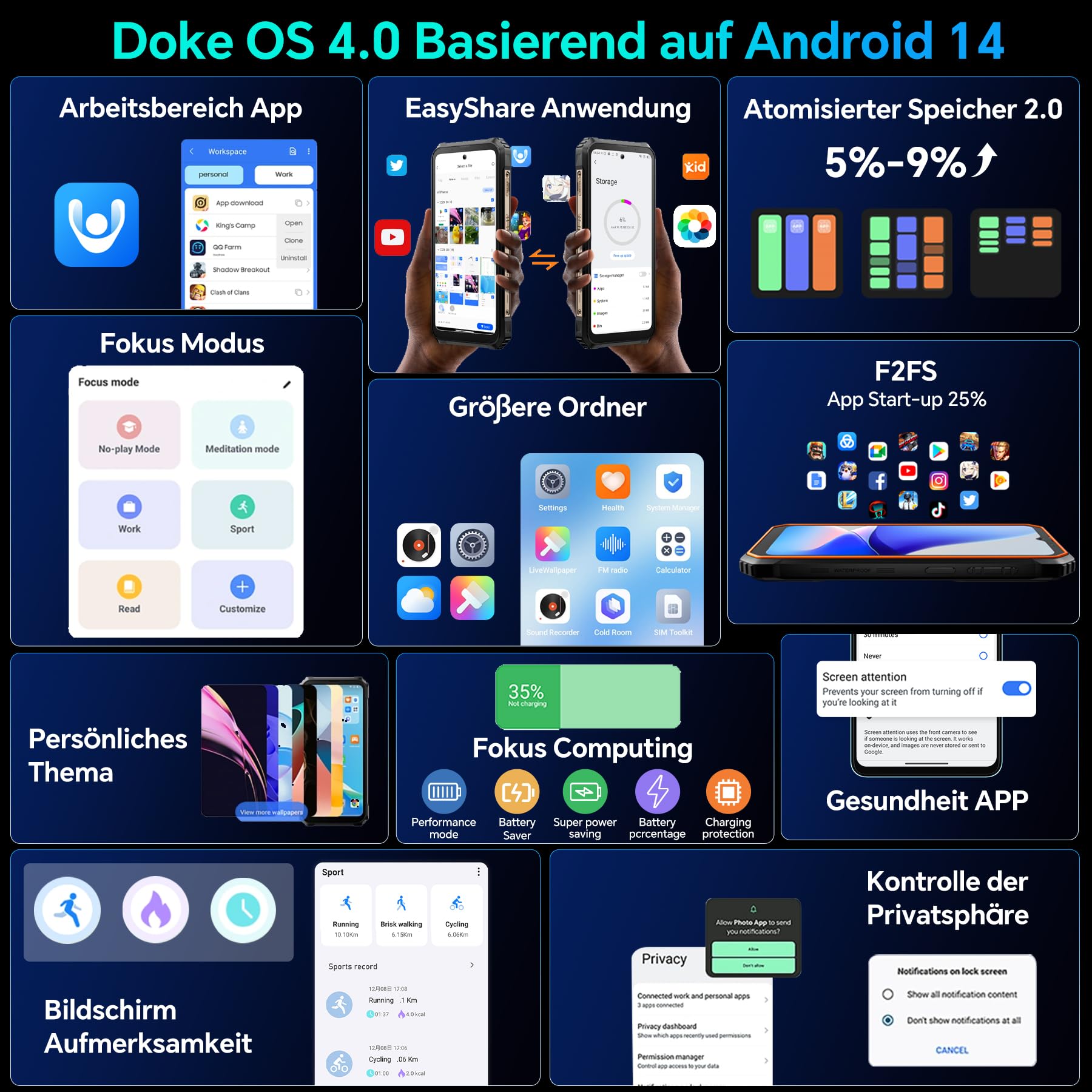 šć2025 Android 14 Neues SmartphonećNew Android 14 smartphone, offering more personality options, widgets, and a renewed UI, bringing a new experience. It provides the most comprehensive security, automatically protecting you from fraudulent emails, apps, and dangerous websites, making using the smartphone easy and safe! Blackview Doke OS 4.1 brings fine optimizations in every detail, offering you a better experience with the same hardware.