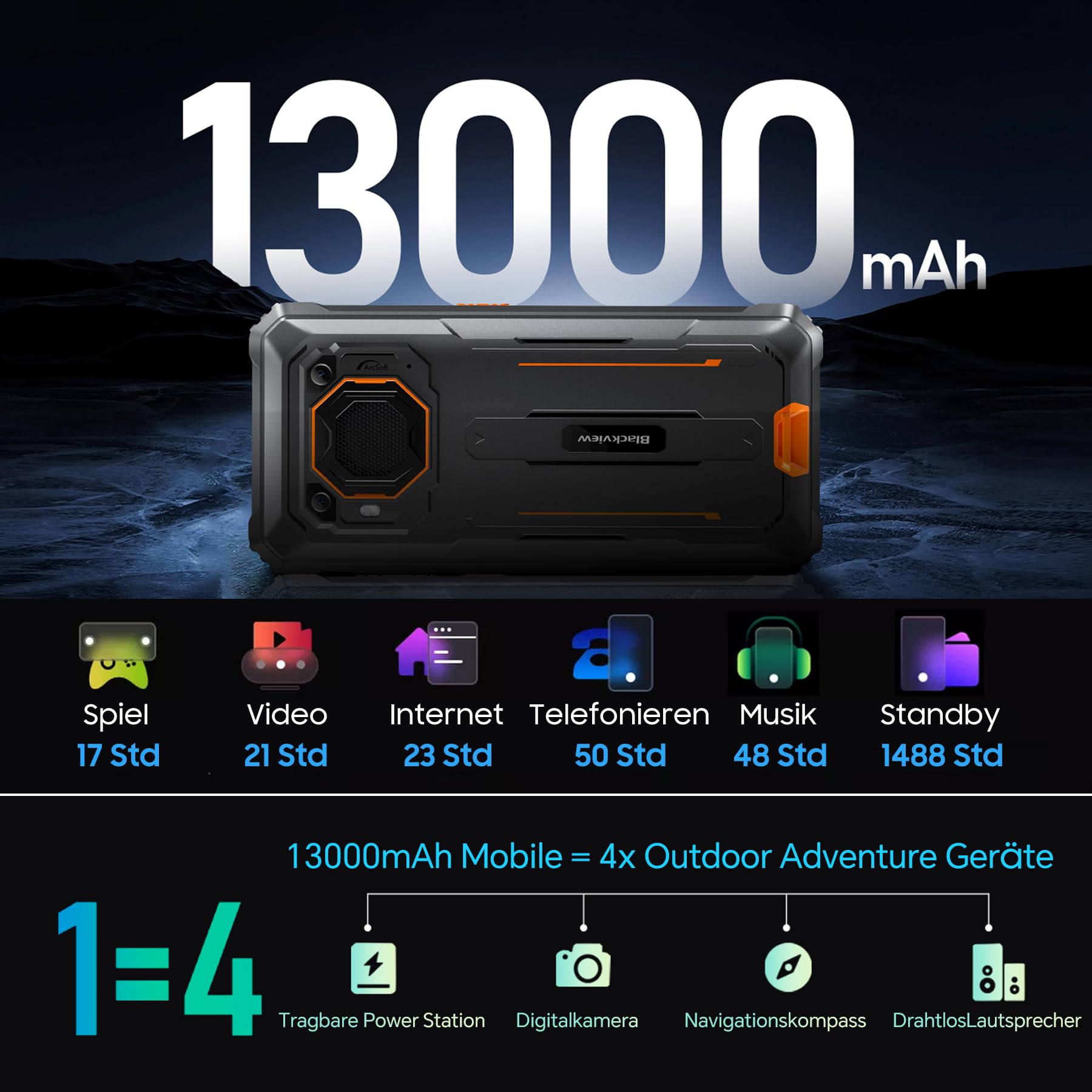 "šćOutdoor-SmartphonećBlackview BV6200Pro is designed to meet all your needs in outdoor adventures: 13000mAh battery, OTG Reverse Charging, 98DB speaker, 18GB(6GB+12GB) RAM 128GB ROM, Helio P35 2.3Ghz processor, IP68&IP69K Military Certification, 13MP Arcsoft camera, 6.56\" screen, NFC, Dual SIM, GPS, full functionalities making the rugged phone the ideal device for outdoor enthusiasts. With Doke OS 4.0 based on the latest Android 14, it provides a comfortable and personalized system."