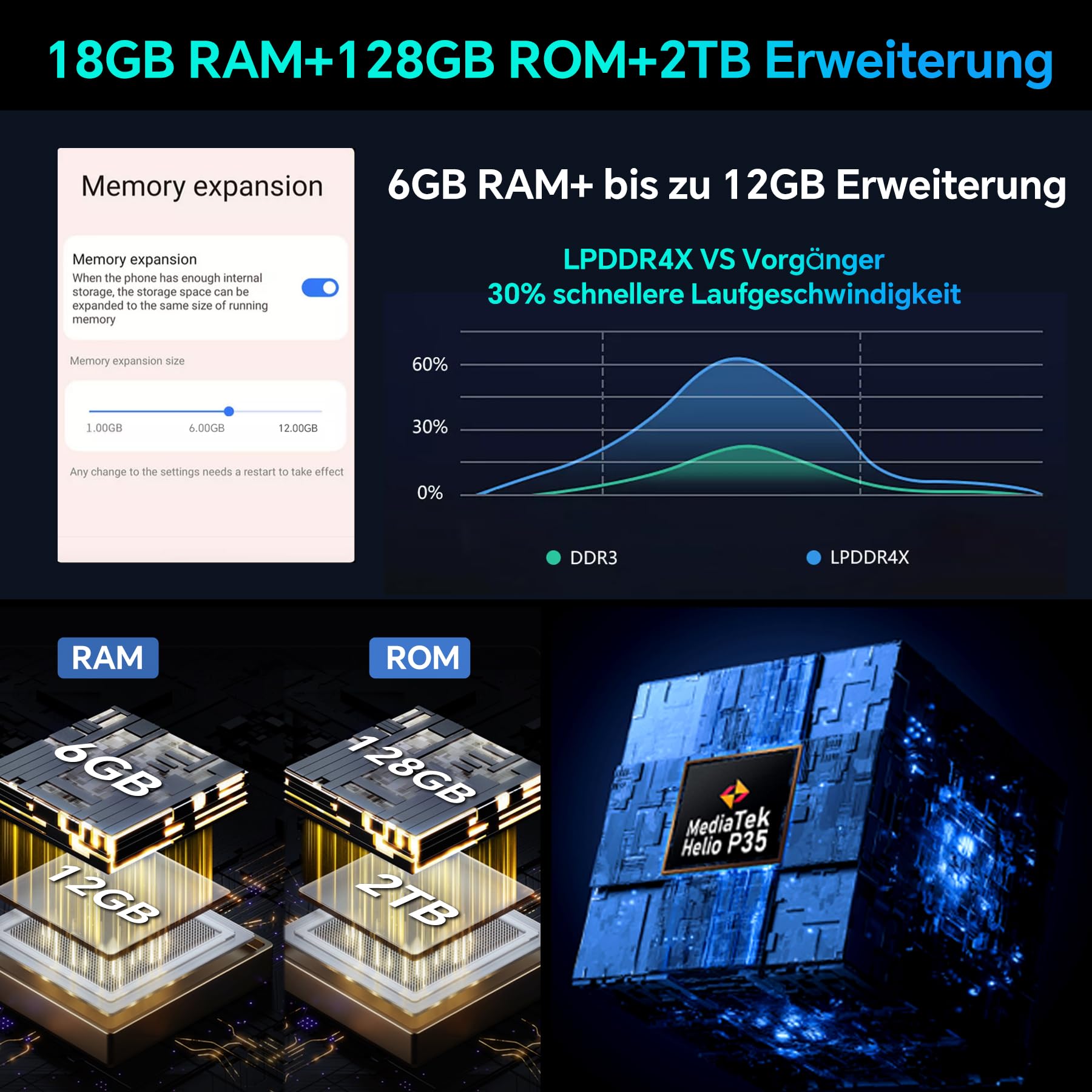 š¾ć18GB+128GB, smoother performance, more storagećThe Blackview Smartphone adopts RAM expansion technology, allowing you to convert a portion of ROM into the same amount of virtual RAM, 18GB RAM (6GB physical RAM + 12GB virtual RAM) brings a 50% improvement in performance, it is able to run more apps in the background. 128GB ROM is enough for your daily needs, also supports TF card up to 1TB.