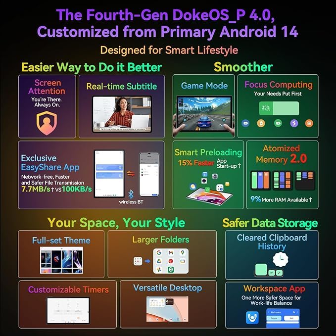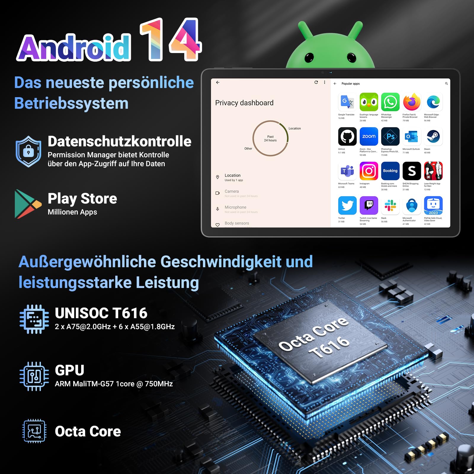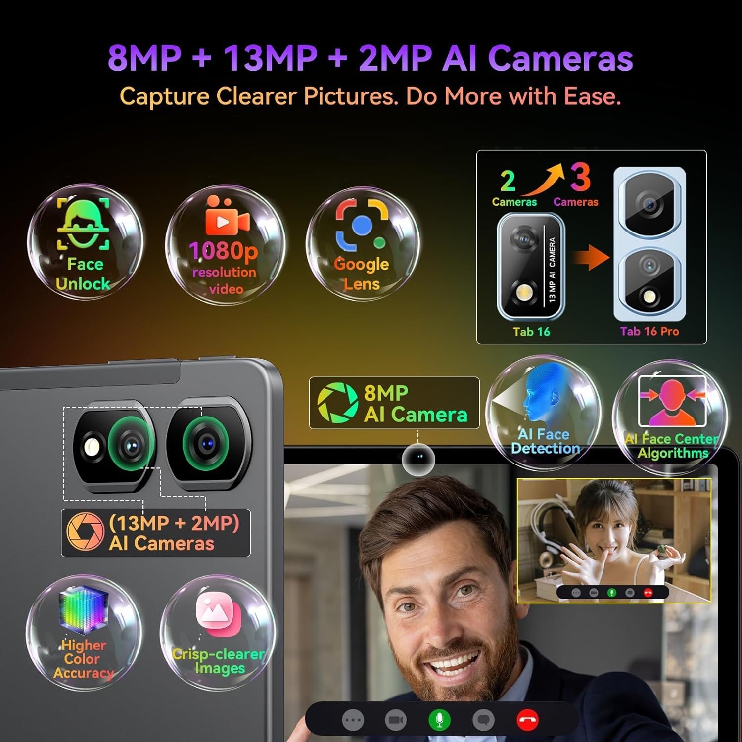 ["【2K Display & 11 Inch & Widevine L1】The Blackview Android 14 tablet features an 11-inch InCell 2K IPS display with high pixel density for crystal-clear, lifelike images and wide viewing angles. Equipped with InCell FHD IPS technology for sharp playback and an eye protection mode to reduce eye strain. With stereo speakers for an immersive sound experience. Supports Widevine L1 and playback of 1080P FHD videos on platforms like Netflix as well as wireless streaming to the TV.","【24 GB RAM + 256 GB ROM】The Android 14 tablet offers 24 GB of RAM (8 GB + 16 GB extended storage) for fast booting, fast file transfer, and outstanding multitasking. With 256 GB of storage and expandable via TF card up to 2 TB, it provides plenty of space for games, e-books, and videos. UFS 2.2 technology enables faster data transfer rates.","【Dual-SIM 4G LTE & 5G Wi-Fi & GPS】The Blackview Android 14 tablet combines telephony and Wi-Fi functions in one device. With two SIM slots, it supports 4G LTE for calls and mobile internet - ideal for on the go without Wi-Fi. It offers Wi-Fi 2.4G/5G, Bluetooth 5.0, and automatically detects the most stable signal for an intelligent user experience. Equipped with GPS, B1C, GLONASS, and Galileo, the Tab16Pro tablet also serves as a navigation system in the car.","【Android 14 Tablet & DokeOS 4.0】The 11-inch Android 14 tablet with DokeOS 4.0 offers a smoother user experience and easier interaction. It has been comprehensively optimized for performance, speed, security, and privacy. With an 8-core processor (2x A75 & 6x A55), it increases work speed by 30% with lower power consumption. Games and multitasking run smoothly. The PC mode, intelligent power-saving mode, split-screen, and notebook functions provide additional convenient features.","【7700 mAh Battery & 18W Fast Charging】The 7700 mAh battery ensures long runtime and enables hours of enjoyment of movies, e-books, and music. The 18W fast charger significantly reduces charging times. The Tab16Pro tablet is GMS certified."]