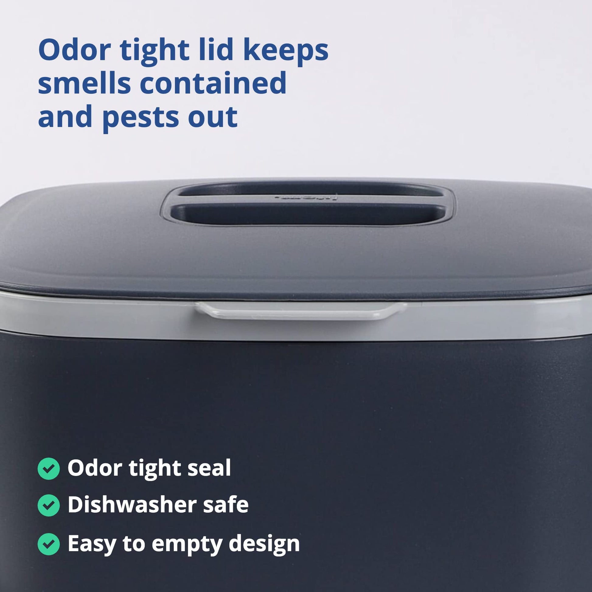"PRACTICAL MODERN DESIGN - This countertop kitchen compost bin makes composting kitchen waste easier and more convenient. Sturdy, easy to clean, and lightweight, it features a tightly sealing lid to keep odors at bay and repel insects, as well as two handles, one on the bin and one on the inner sieve, for a clean disposal experience."