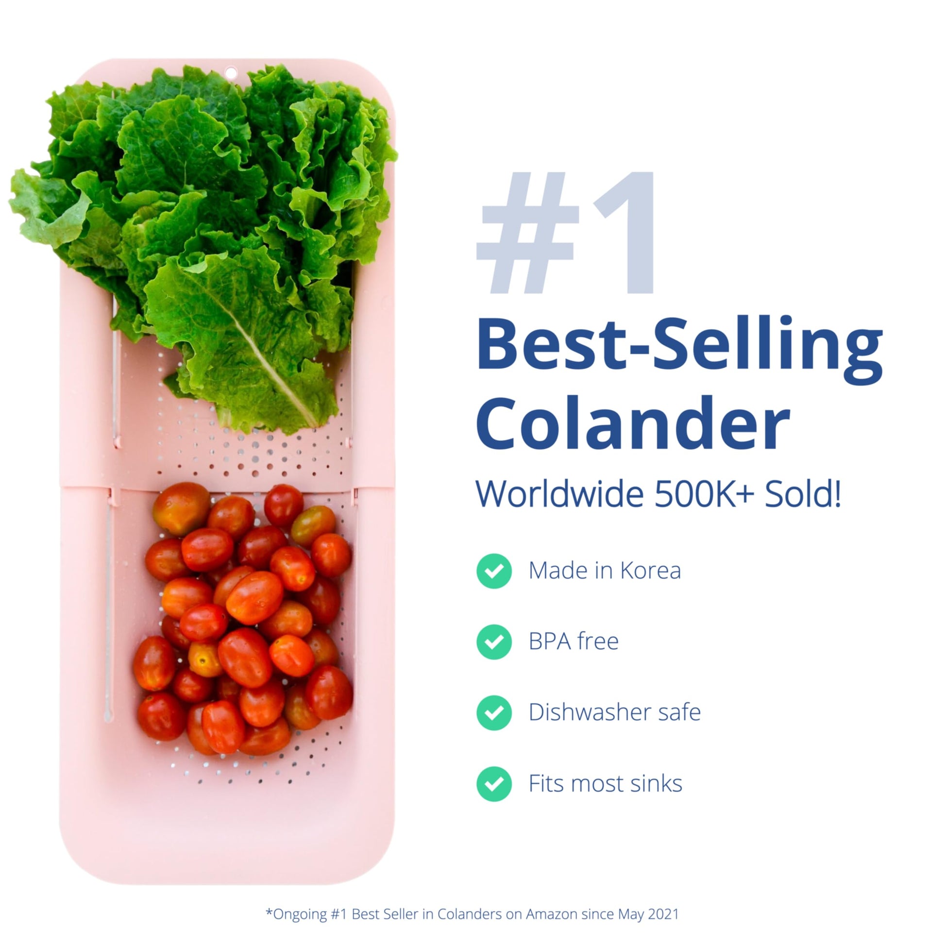 "Modern Design - Adjustable, this strainer can expand from 14.5 to 19.5 inches to hold more or less space, saving space when not in use, and fits most sinks. When spanned over the sink, the bottom lifts off your sink floor, preventing drained pasta water from returning to your food.",