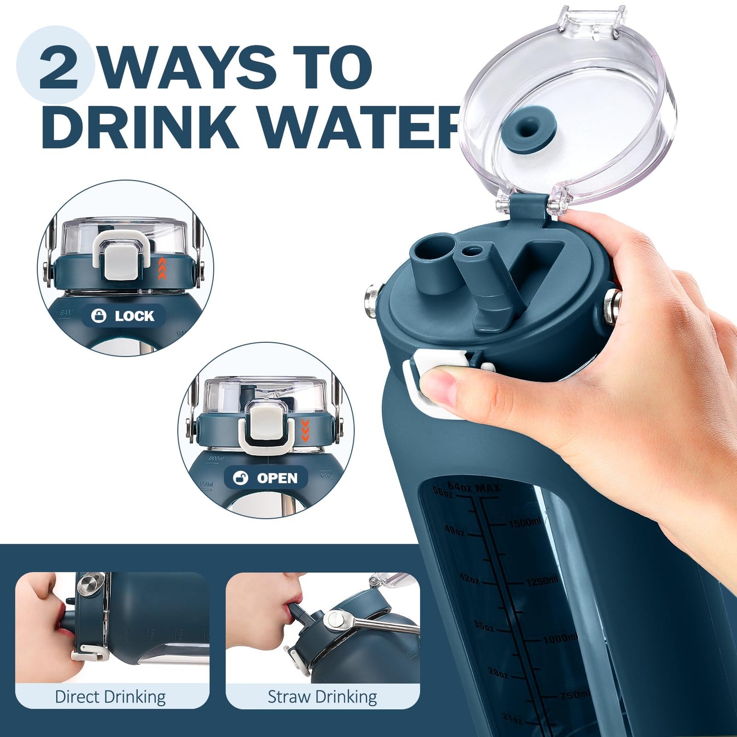 ["【Design with pop-up lid】: The BLUEGO 67oz glass water bottle with straw offers two drinking options, with a pop-up lid design, one-touch button makes it easy to drink water, simply press the button and the straw will automatically pop up. Pop-up with sealable lid, one-touch flip lid keeps surfaces covered and clean.","【With time marking】: This 2-liter glass water bottle features a time marking and water capacity marking, which can be a good measure of how much water you drink daily. Scientifically, the intake of 8 cups of water is sufficient, no frequent refills required, enjoy the refreshing taste of clean and pure water.","【STAINLESS STEEL HANDLE】: The glass water bottle with a unique stainless steel handle has a stronger load-bearing capacity, so you don't have to worry about it falling out when taking it out, and it is easy to carry.","【WIDE MOUTH DESIGN】: This water bottle with wide mouth design not only accommodates ice cubes and fruits, but is also very easy to clean. Additionally, you can use our free cup brush to clean the water bottle.","【GREAT GIFT】: This water bottle offers a wide range of colors, with a simple and generous appearance, it is also an ideal gift choice, whether for family, friends, or lovers, it is very meaningful."]