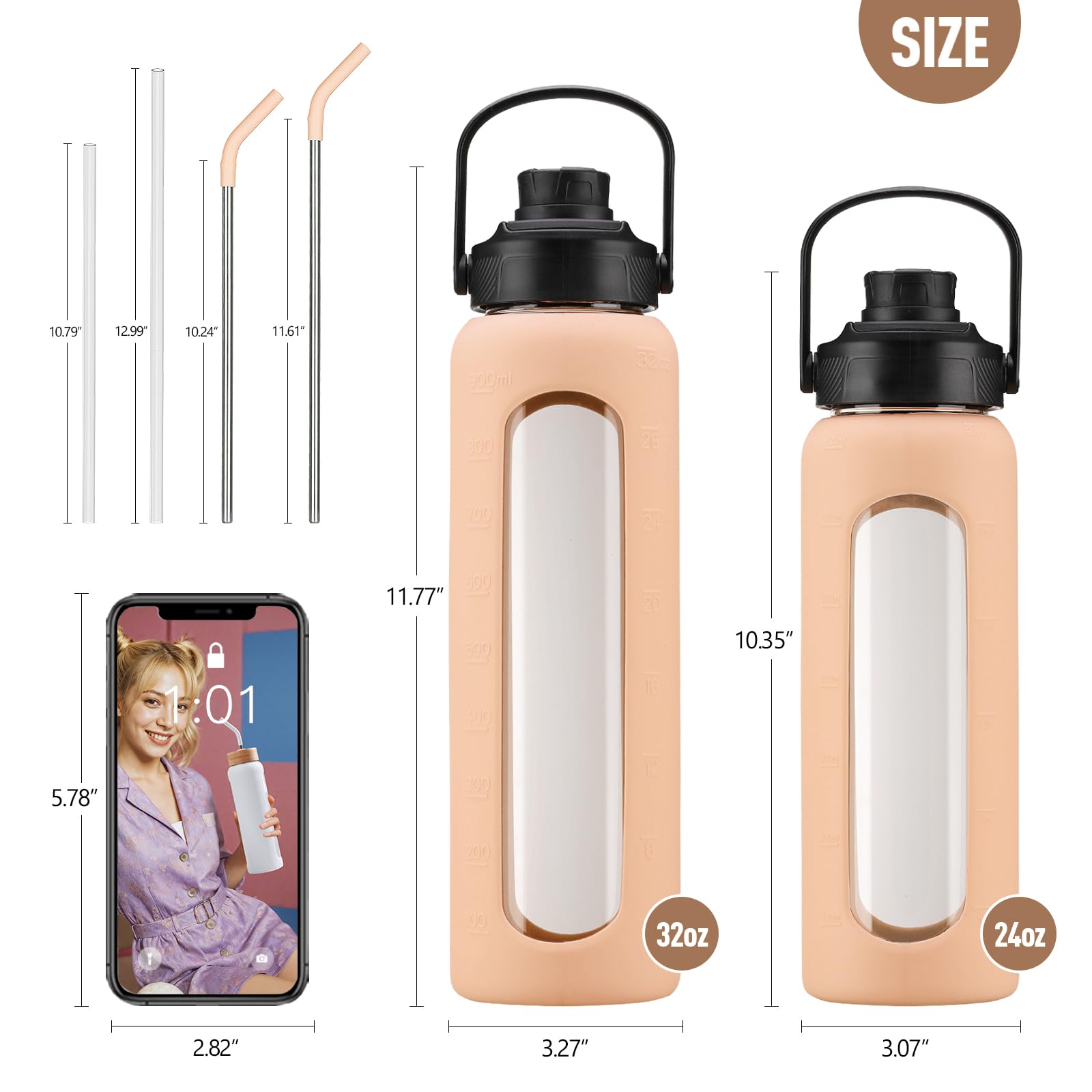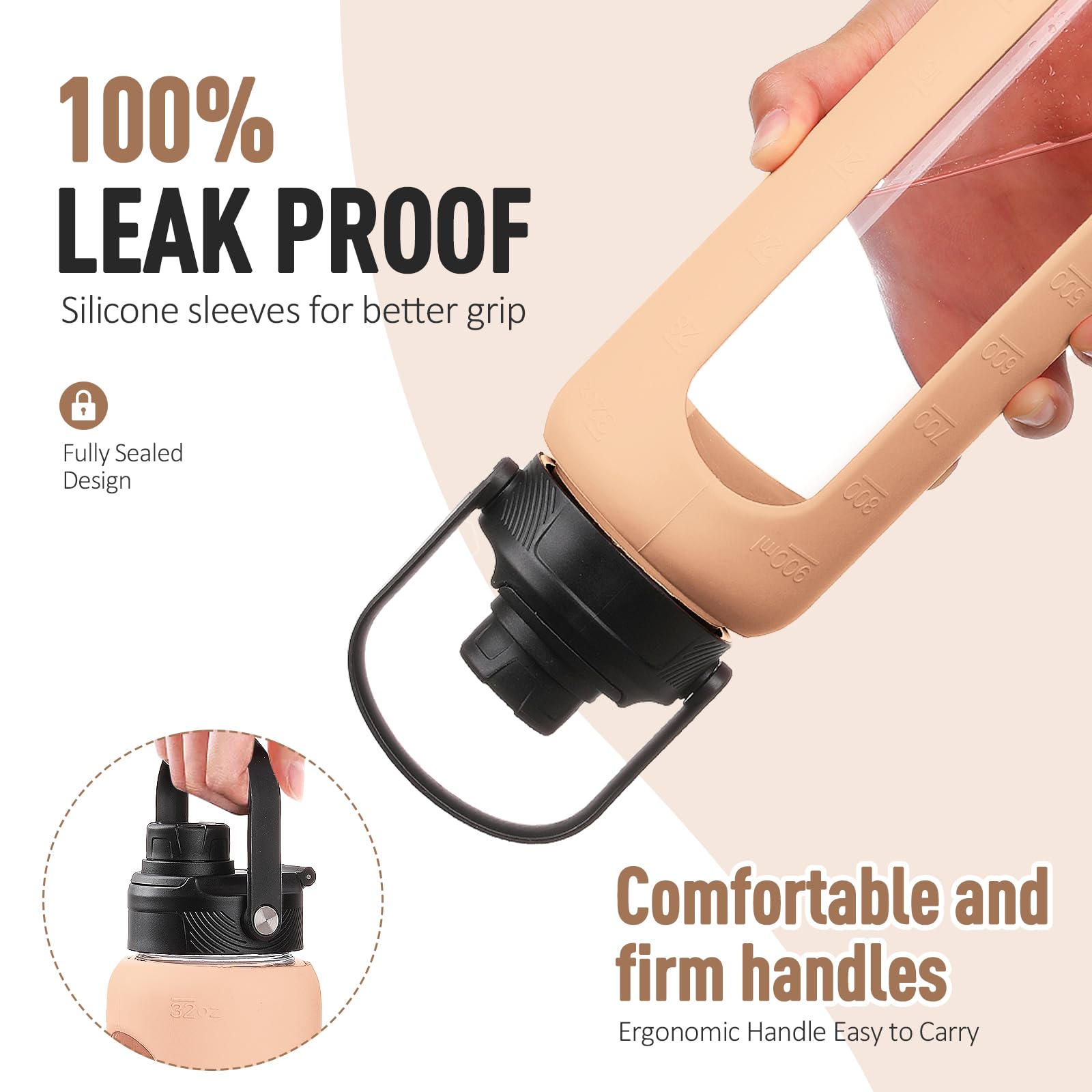 BLUEGO 900ml glass water bottle with straw and 2 lids Glass coffee cup with time markings and silicone sleeve Glass cup for drinks, soda, cola BPA-free, Amber