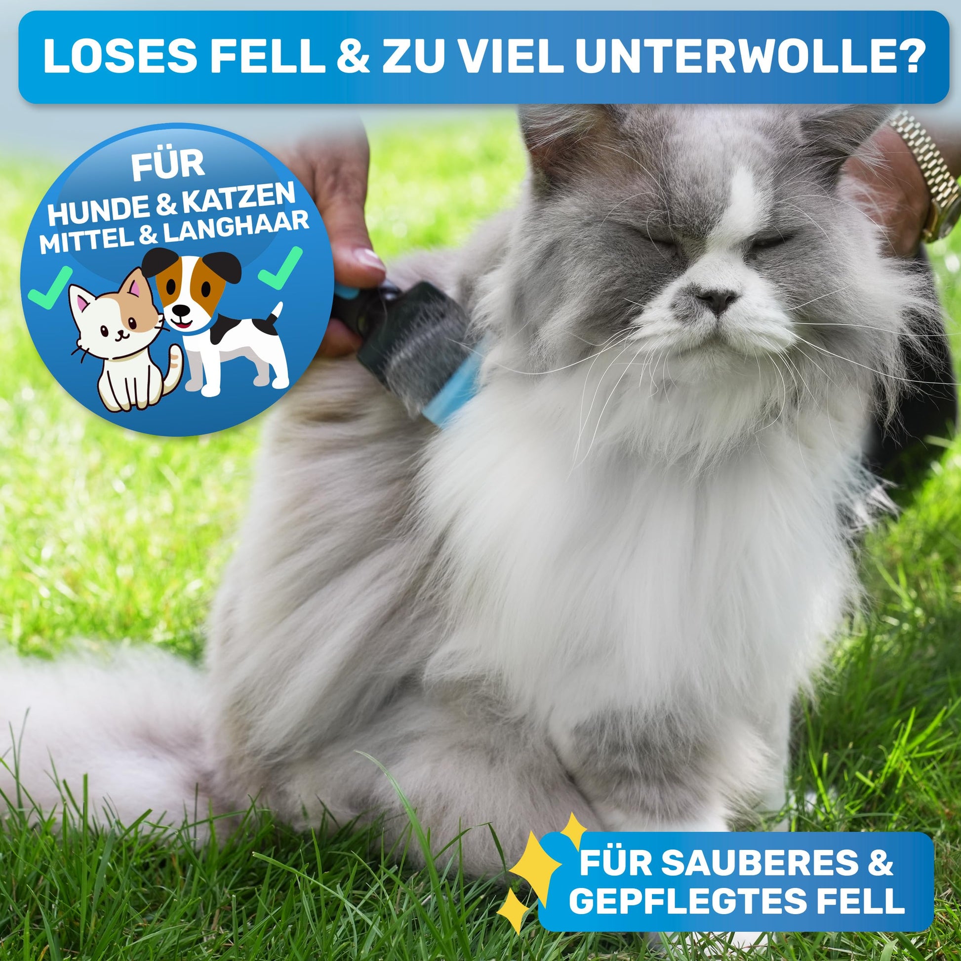 ["Double-sided brush = High-quality undercoat brush with soft pins for smooth & shiny fur.","Gentle fur care = Brush gently removes loose fur, knots & tangles. Flexible brush head prevents too much pressure.","By experts = Professional fur care like at the dog groomer. Make brushing a special moment.","For dog & cat = Dog brush and cat brush for long and medium-length hair.","BLUEPET = The reliable brand for passionate pet care. First-class products for your beloved four-legged friends."]