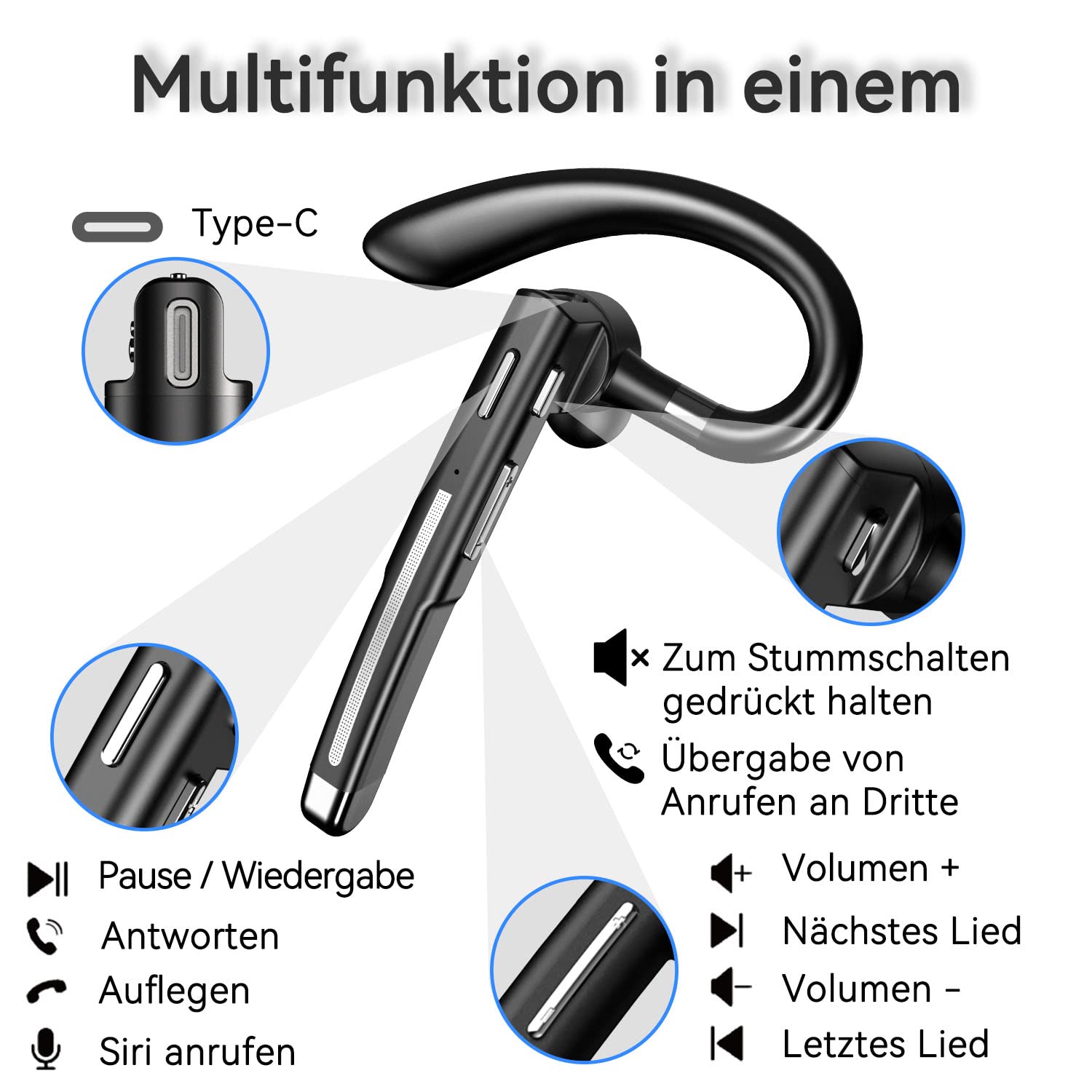 ["[Hands-Free and Top Sound Quality] The Bluetooth headset integrates the latest Bluetooth 6.1 chip technology, providing clear audio and a stable connection for you to make calls as if you were face to face.","[LED Charging Case & 100 Hours Playback Time] Equipped with a 500mAh battery charging case that fully charges in just 1.5 hours, this Bluetooth headset offers approximately 100 hours of uninterrupted use and supports 7-8 charges for your wireless headphones.","[In-Ear Comfort Design] Designed for optimal comfort, the headset features a flexible ear hook that rotates 180° vertically and 360° horizontally, ensuring a secure fit in both ears - light enough to wear for hours without discomfort.","[Mute Function & Siri Activation] Easily manage your calls with the mute function, allowing you to mute and unmute with a single press of a button. It also supports activating the voice assistant for added convenience.","[Connect to Two Devices] This wireless headset can be connected to two devices simultaneously, making it perfect for seamlessly managing work and personal life. Music playback and call management can be easily controlled with just one button."]