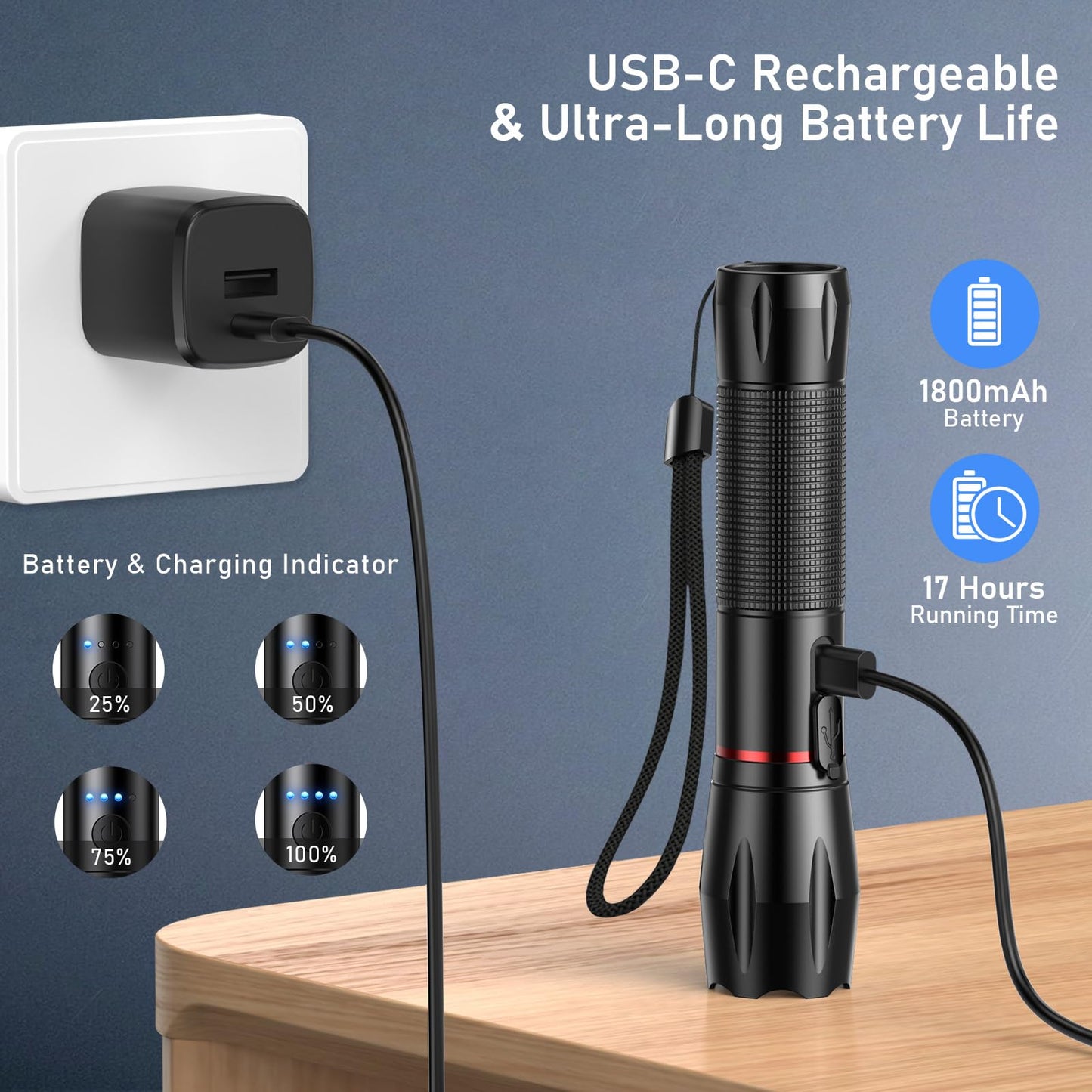 "Super bright LED flashlight: This LED flashlight is extremely bright and provides a uniform beam with high brightness and a larger lighting area to meet your daily needs. Zoomable & 5 light modes: With zoomable design, you can freely choose the focal point between spot beam and flood beam to meet the lighting requirements of different distances. 5 lighting modes - High, Normal, Soft, Strobe, SOS for free selection. USB C rechargeable: The built-in 1800 mAH battery provides up to 17 hours of lighting time. With the standard USB C cable charging cable (included), you can use not only a USB wall charger but also a power bank, computer, and other devices to charge your flashlight, which is especially useful outdoors. Waterproof & user-friendly: It is IPX6 waterproof, perfect for various outdoor activities such as camping, hiking, fishing, and can also be used as an emergency light source for power outages. Thanks to the battery power indicator, you can track the battery power anytime, anywhere. And in every mode, press and hold the switch to turn off the flashlight. Portable & 2 pack: This product is very compact and can be easily carried in your pocket. Whether you are hiking or walking your dog, this lightweight and portable flashlight is ideal for you. At an affordable price, you get 2* flashlights, 2* USB C charging cables, 1* user manual."