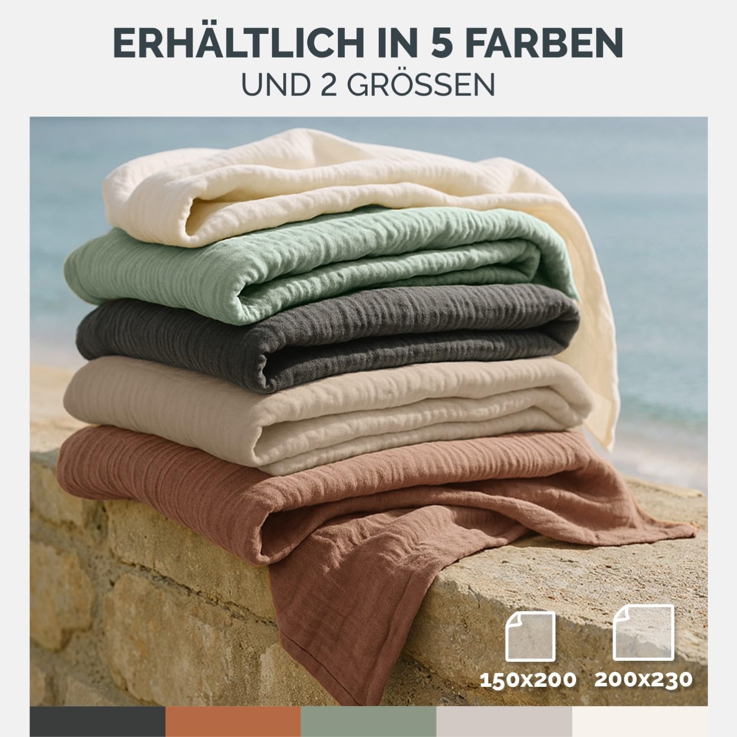 ["AIRY-LIGHT MUSSELIN FABRIC: Our extremely light daybed cover creates an inviting atmosphere with its muslin fabric in a beautiful Boho style, ensuring a relaxed living atmosphere - whether used as a delicate blanket or bedspread!","100% BREATHABLE COTTON: The daybed cover is made of high-quality, 6-layer muslin fabric made of breathable cotton, which feels particularly airy and not too warm on the skin - available in 150x200 cm and 200x230 cm!","OEKO-TEX CERTIFIED: To ensure worry-free comfort, we prioritize the safety of our products! That's why our living room blanket is certified to OEKO-TEX standards and free from harmful substances.","MACHINE WASHABLE AT 40°C: Our easy-care blanket can be washed in the washing machine at 40°C without losing its shape or softness - for the perfect crinkle look, wash without fabric softener and dry at low temperatures.","FIVE BEAUTIFUL COLORS: The Boho blanket is available in five lovingly selected colors by us - find your favorite color now and enjoy the versatile applications of our extra light daybed cover!"]
