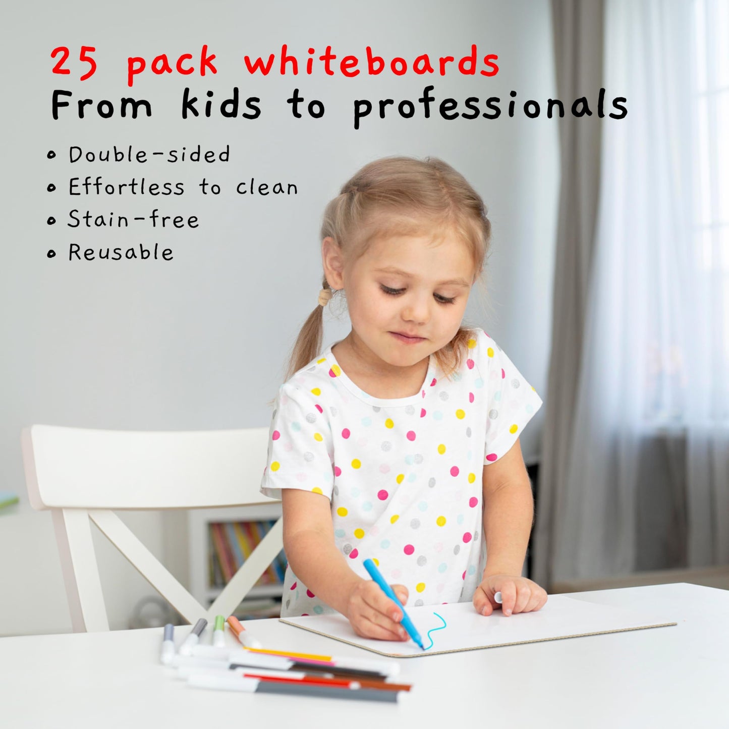 ["Versatile writing surface: Our double-sided whiteboards offer 8.6 x 11.8 inches for learning and fun. Rounded corners for children's safety.",