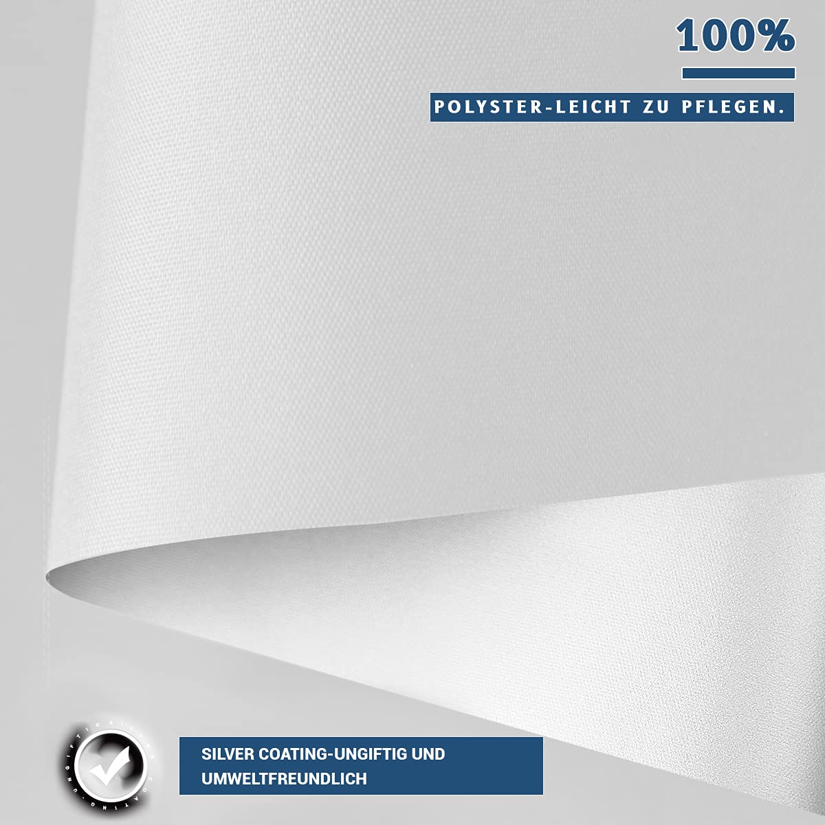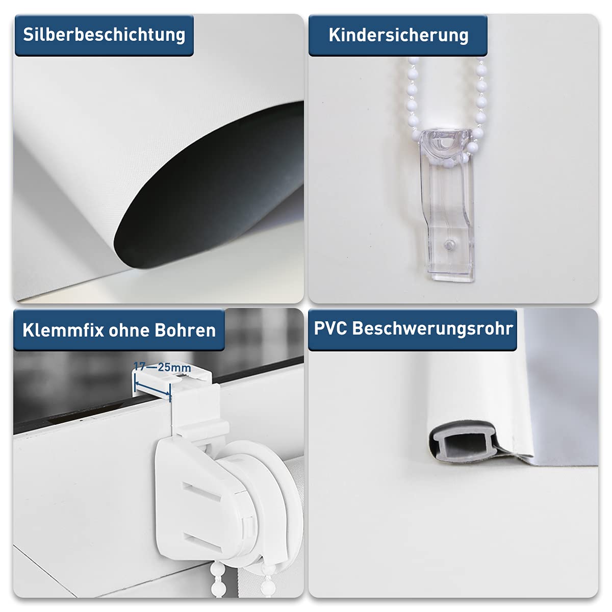 ["Material: Blackout roller blind is made of durable, light-proof 100% polyester with silver-colored light stop coating on the back. OEKO-TEX certified, non-toxic and harmless","Installation without drilling & with drilling: The blackout roller blind can be attached without drilling. With 2 clamp brackets, suitable window frame thickness: 0.6 to 0.9 inches, dismantling and installation are quick and easy. Or screw it onto the window, balcony door or patio door","100% blackout & privacy and sun protection: The window blind without drilling can darken the room. The thermal blind has a reflective coating on the back, thus cooling the living spaces in summer; and in winter it blocks the cold air from outside. With this blackout blind, you not only protect your privacy, but also keep your rooms dark and cozy","Choose size: Ordering width refers to the total width of the blackout blind with accessories. Please measure the glass width before purchasing. The ordering width = the glass width + approx. 3-4 inches. The fabric width of the thermal blind is approx. 2 inches shorter than the ordering width. For example, the fabric size of the window blind 20x67 inches is 18x67 inches. The chain pull can be mounted on the left or right. However, note that window handles on the window must be taken into account when determining the width","Wide application: The blind is suitable for any room such as bedroom, children's room, living room, etc. But NOT suitable for roof windows. Wet rooms pose no problems for the chain pull blind. By installing without drilling, you bring a modern and attractive look combined with simple and reliable technology to your windows"]