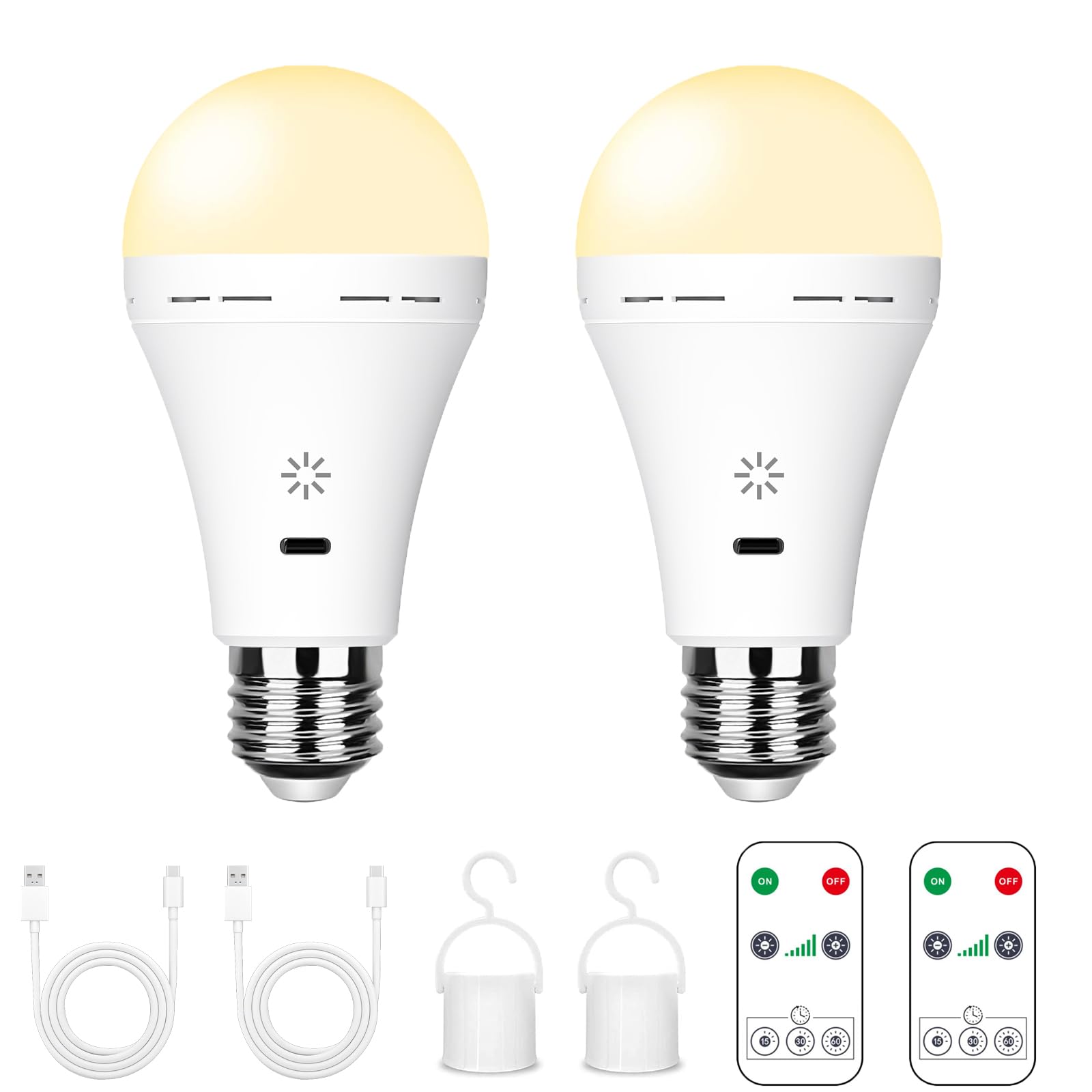 BOBOPAI USB-C Rechargeable Bulb With Remote Control, 7W E27 Smart Battery LED Bulb, Touch Control Dimmable, With Timing Function, Outdoor Camping Emergency Light With Hook, 3000k/2 pack
