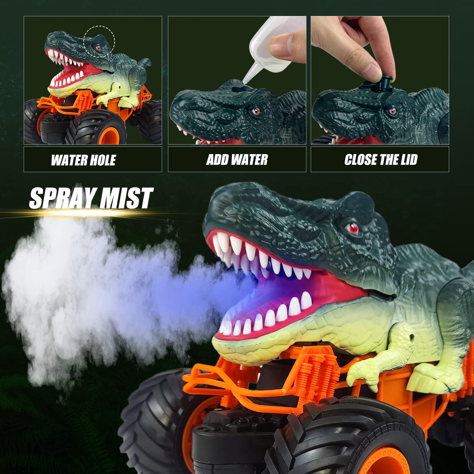 ["Dinosaur RC Monster Truck for Kids - This remote control car for 3 4 5 6 7 8 years old is designed in a vibrant Tyrannosaurus Rex shape with bright red eyes and a large monster mouth. It can spray mist from the dinosaur's mouth, accompanied by realistic dinosaur sounds and lights. The flexible control and high driving speed give children a realistic racing experience, making it an exciting dinosaur RC car toy for dino lovers.","2.4 GHz Anti-Interference Control - With a interference-free 2.4 GHz control frequency RC car for kids multiple toy cars girls boys from 3-12 years old, race at the same time and with the remote control. The control distance is up to 50 feet. Provides more outdoor fun for multiple players with the monster truck. Additionally, it can be a perfect gift for kids on birthdays, Children's Day, Christmas, Halloween, etc.","High-performance Gaming Experience - Our remote control dinosaurs can not only move forward/backward and turn right/left like a real car, but also have newly improved spray, sound, and light features, like a dinosaur spitting fire. Just pour water on the head of the dinosaur RC car and press the spray button on the remote control. It is a great kids car toy gift and shocks every kid.","Suitable for Most Terrains - Powered by strong motors and equipped with flexible, non-slip rubber tires, this all-terrain remote control car is suitable for most terrains like concrete roads, dirt, at the beach, and allows kids to play in most environments. Simulation design and clear textures of the dinosaur toy allow kids to learn about and explore the world of dinosaurs.","Race Time up to 60 Minutes - The remote control car comes with 2 rechargeable 3.7V 800mAh high-capacity batteries that provide you with over 60 minutes of playtime (per battery 30 minutes). The batteries support multiple charging methods: computer, power bank, power adapter, outlet, etc. The charging time is about 3 hours for each battery with a USB charging cable. DON'T STOP THE GREAT MOMENTS WITH THE KIDS TOY CARS." ]