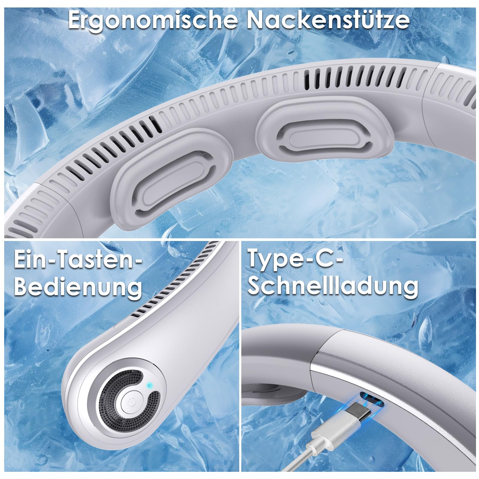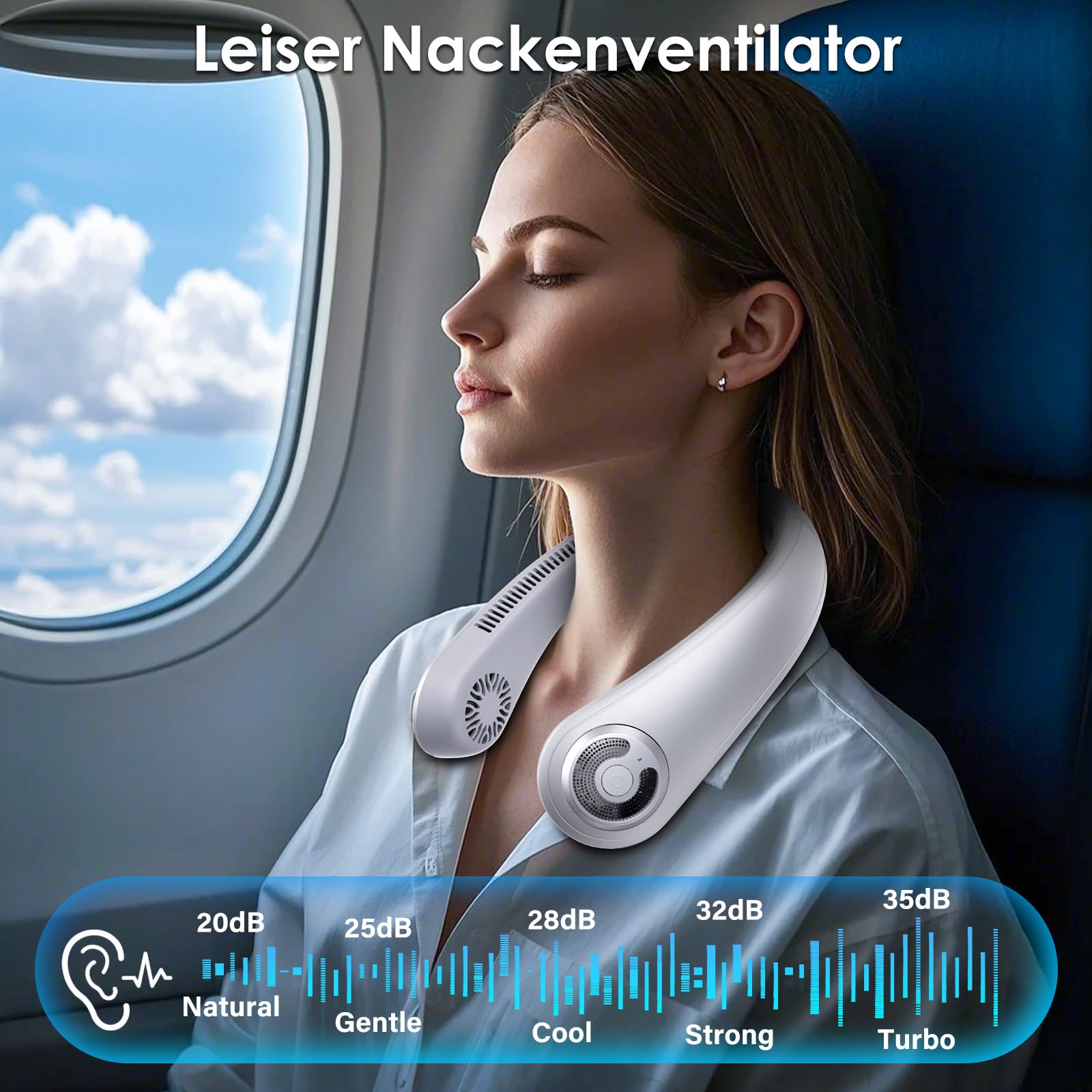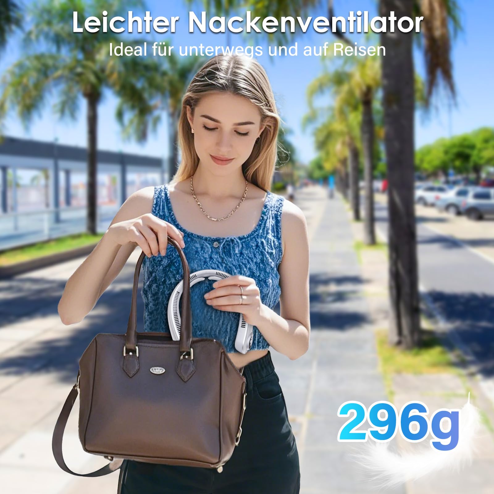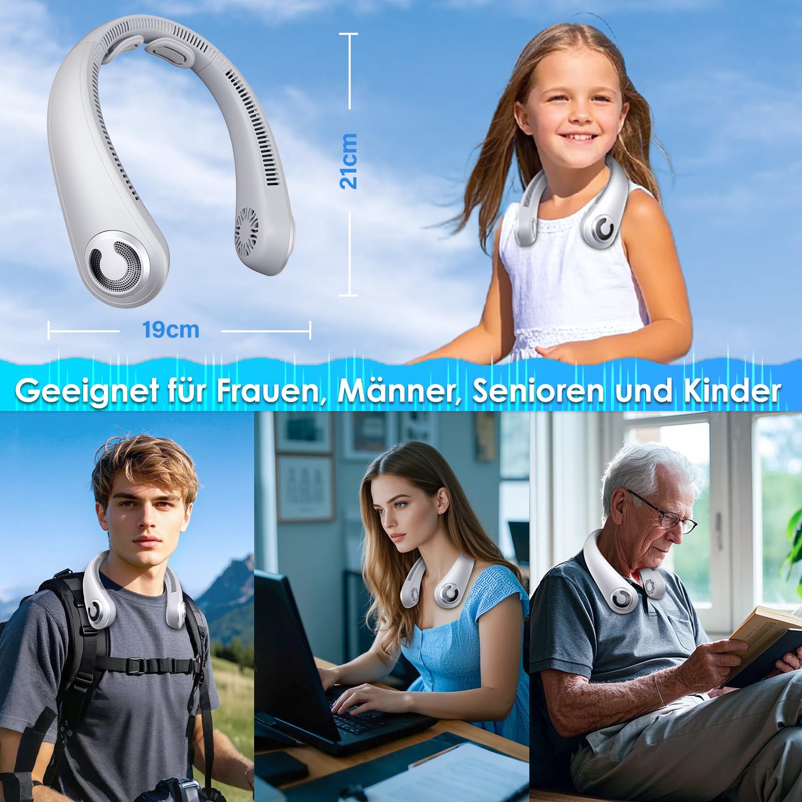 ["Neck Fan】The portable neck fan by BOIROS is equipped with 74 air vents that provide a 360° airflow - around the neck, face, and neck area. No direct airflow to the eyes or ears. The completely redesigned turbo motor increases airflow by 70%, while reducing weight by 25% and being 30% quieter than traditional neck fans - for noticeably stronger cooling with whisper-quiet operation","【5-Speed Neck Fan with Neck Support】Experience 5 individually adjustable cooling modes with a neck fan. The ergonomic neck support prevents a sticky and pressing feeling by reducing skin contact and allowing for efficient heat dissipation. This allows you to wear the fan for longer periods without putting pressure on the neck - for an incomparably comfortable wearing experience","【Quiet & Portable】This cooling neck fan integrates noise reduction technology and a custom airflow channel to minimize product noise. Even at the highest speed, it will not disturb your conversations. This lightweight neck fan is made of low-density ABS and aerospace-grade silicone and weighs only 296 g","【Long Battery Life Neck Fan】The built-in 5000mAh battery supports the rechargeable neck fan, keeping you refreshed all day long. A quick charging time ensures hours of uninterrupted cooling. Your indispensable companion for garden parties, hikes, or strenuous night shifts in scorching heat - stay cool wherever life takes you","【Sleek and Elegant】Stay cool in this hot summer with the rechargeable neck fan by BOIROS. The hair clip secure function provides extra comfort and guarantees safety, making it particularly user-friendly for women. It is a lifesaver for hot flashes, travel, music festivals, amusement parks, gardening, housework, and more. Also a perfect gift for women, men, mothers, fathers, and friends in the hot summer"]