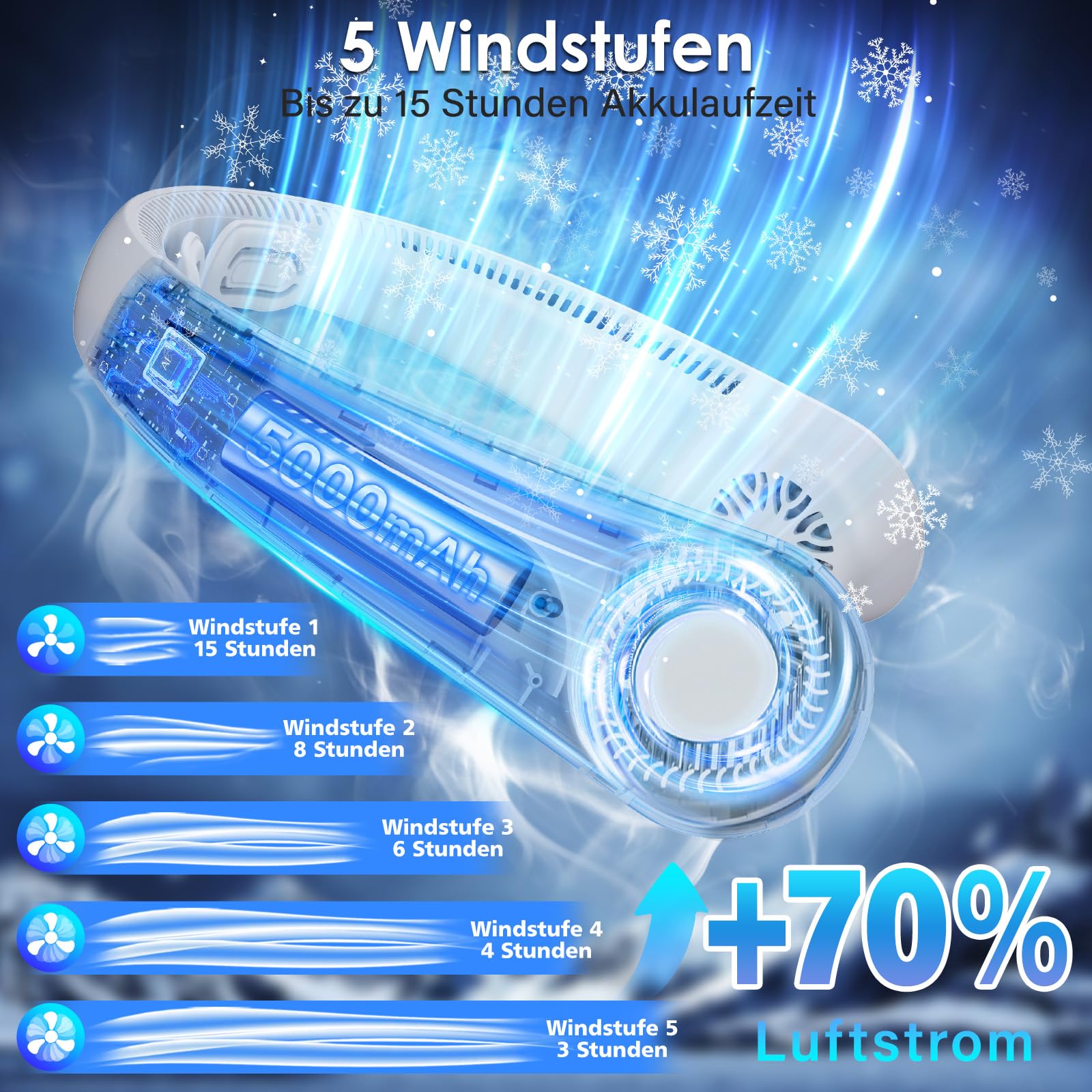 BOIROS Neck Fan, 5000mAh Neck Fan with Neck Support, Rechargeable USB Neck Fan Quiet, 5 Speed Levels, Portable, 360° Surround Airflow for Women and Men.