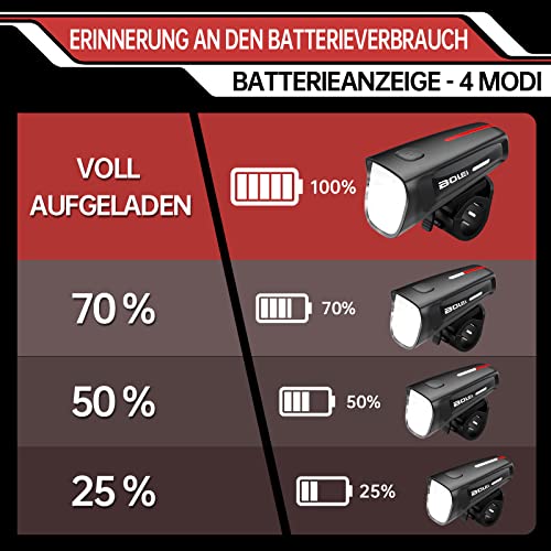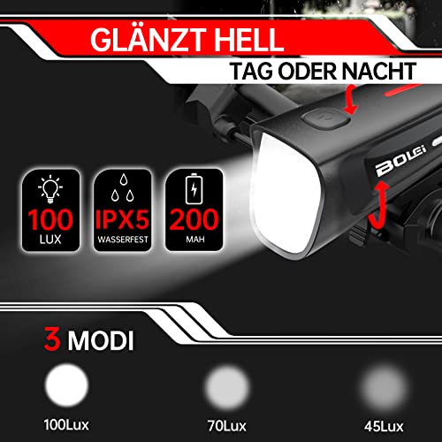 BOLEi LED Bike Light Set 100 LUX | StVZO Approved Bike Lamp | USB Rechargeable Bike Lighting | IPX5 Waterproof Bike Lights | Battery Reminder