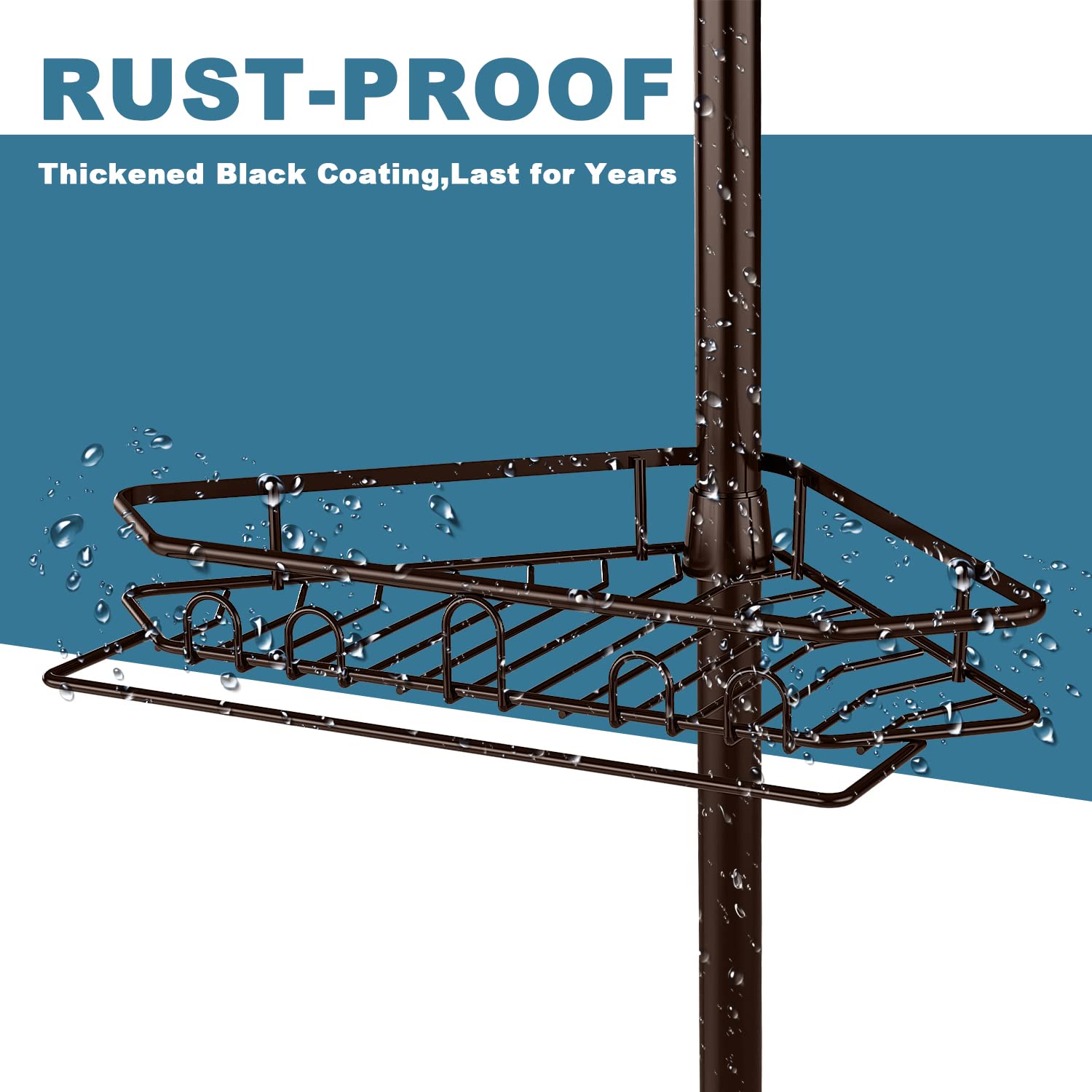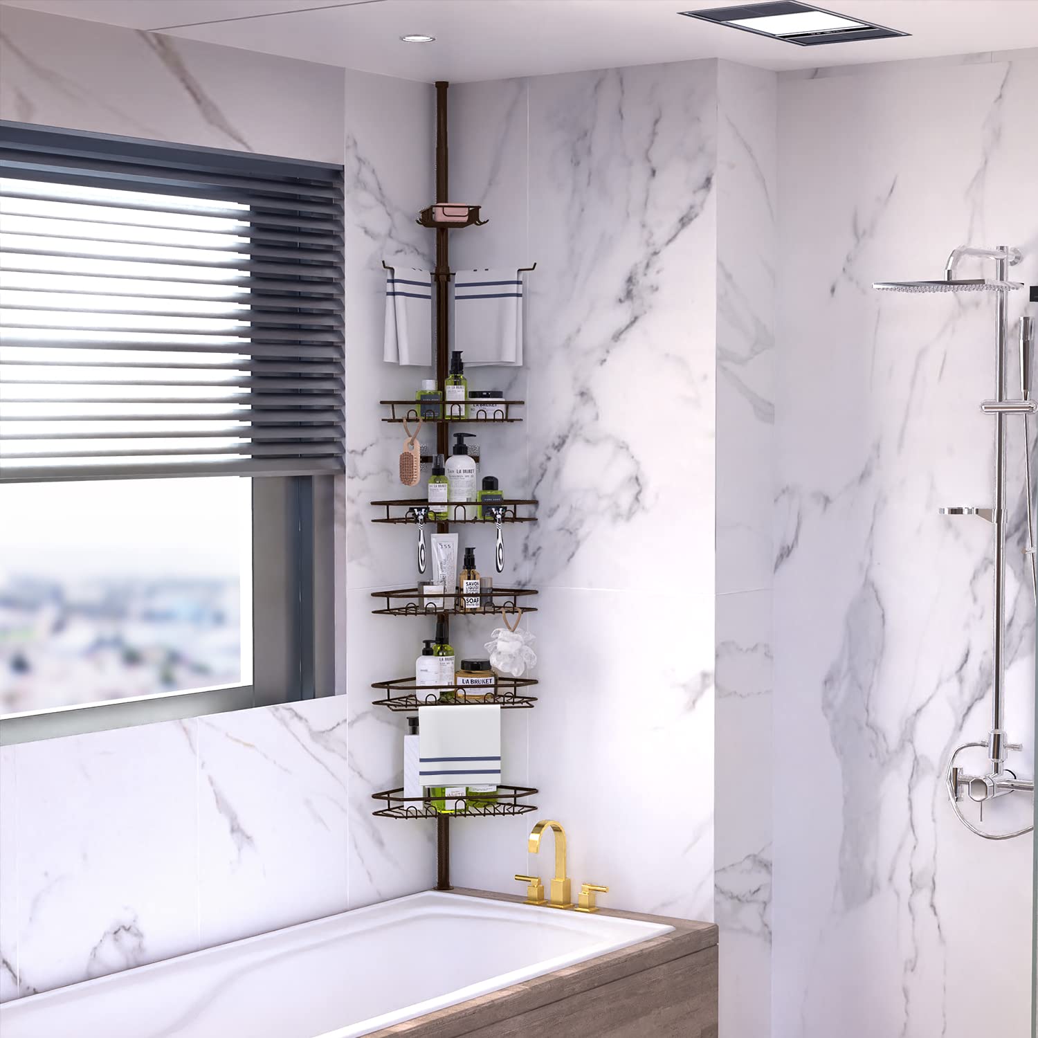 "【Sturdy and Secure】- The telescopic shower shelf is made of high-quality, durable metal iron and is designed with adhesive fixings to enhance stability. The powder coating is bronze, giving the surface a shine and longer lifespan. It also has good anti-rust and anti-corrosion abilities.",