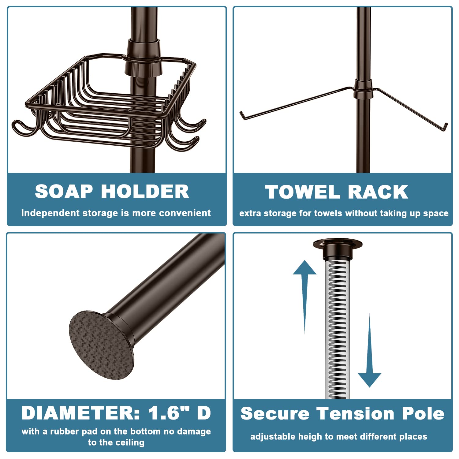 "【Adjustable Extendibility】- The shower caddy without drilling is equipped with a tension spring, which can be freely extended based on the desired height distance from the floor to the ceiling to protect your ceiling. All five railing frames are fixed with rubber rings, allowing you to adjust the position as needed.",