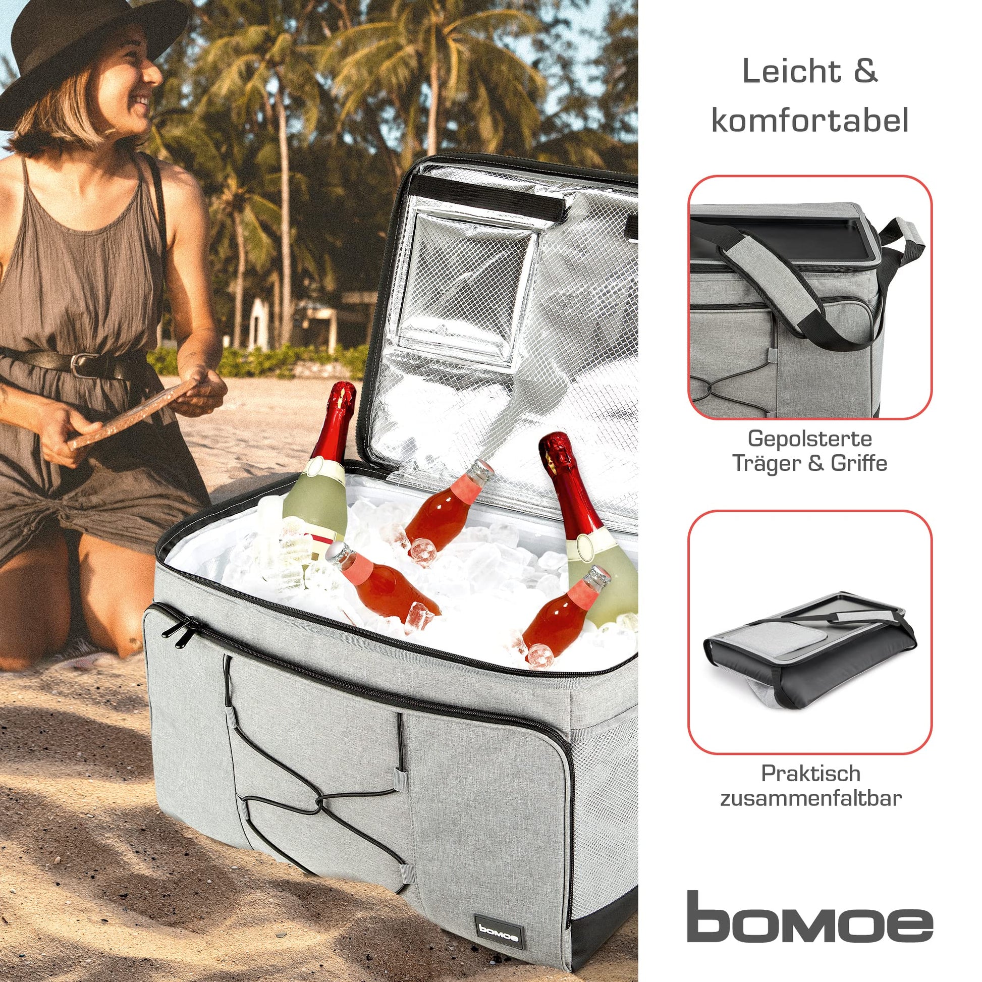 ["ICEBREEZER - The bomoe XXL cooler bag is the perfect companion for your trip, picnic, festival, or outdoor activity. Thanks to the thermal function, the cooler bag keeps drinks and food fresh for many hours. The bag can be easily folded to minimize storage space.", "16L CAPACITY & INSULATION - The cooler bag has a thermal coating that allows drinks and food to be kept warm or cold. The material of the beach bag is dirt-repellent and easy to clean. Thanks to the water-repellent bottom, the bag can also be placed on damp surfaces.", "BOX WITH GLASS HOLDER & STABILITY- The cooler box has a bordered storage area where you can comfortably place your glasses, bottles, or cups. The removable bottom plate inside reinforces the stability of the cooler box. The ergonomic shoulder strap is adjustable and padded for comfortable carrying. In addition, two side handles provide another comfortable carrying option.", "AUSLAUFSICHER & GEWENDEWICHT - Inside the cooler bag, there is a removable waterproof film. With the insulating film, you can easily keep the cooler bag cold with cold water for a long time without leaking. The lightweight cooler box is ideal for making a day trip with little luggage.", "WITH EXTRA POCKET, COMPARTMENTS & EASY ACCESS - The picnic Cooler Bag is equipped with an outer pocket and three compartments to store your personal belongings. Both the outer pocket and the main compartment can be opened and closed with a zipper. With the extra foldable lid, you have access to the contents of the bag without having to open the entire lid."]