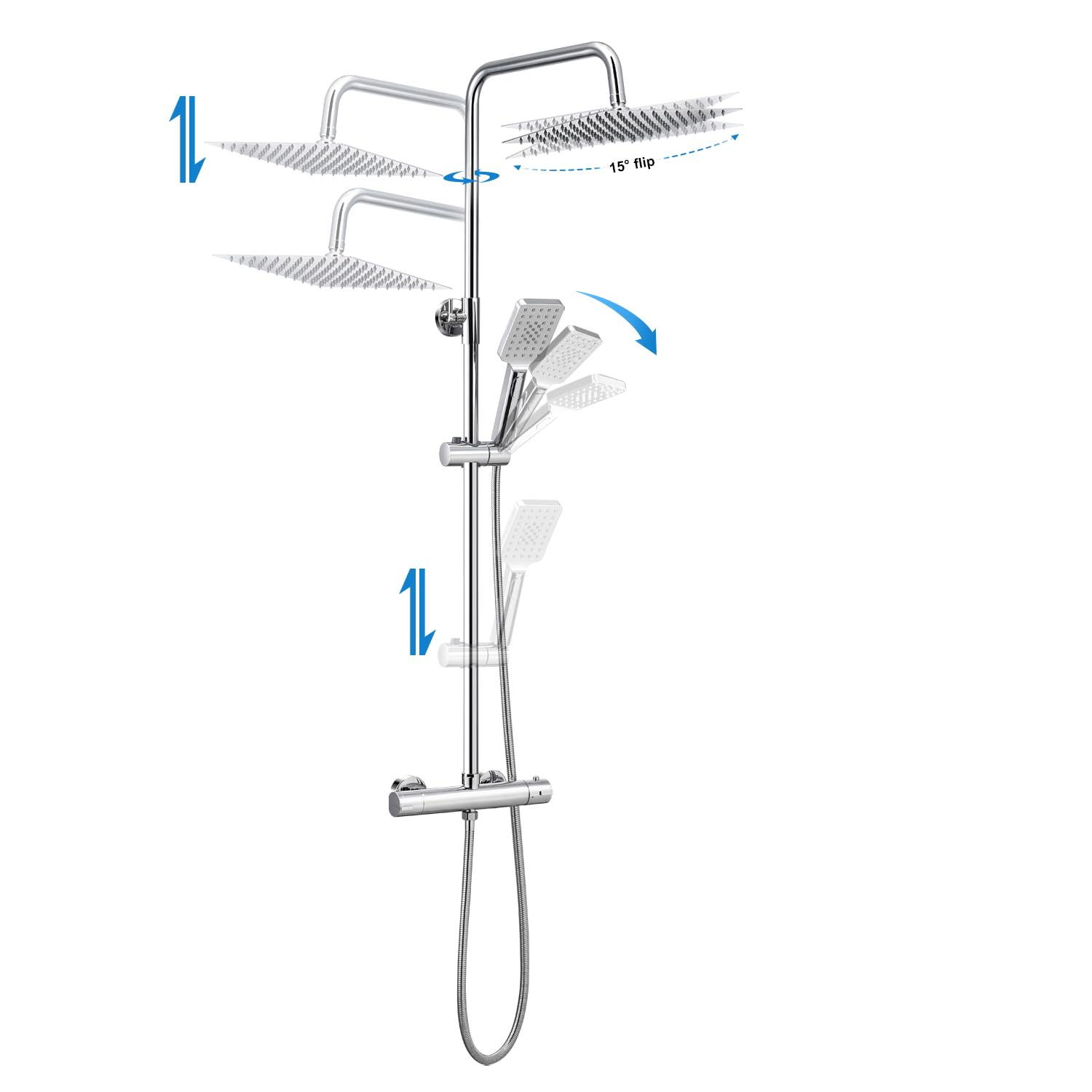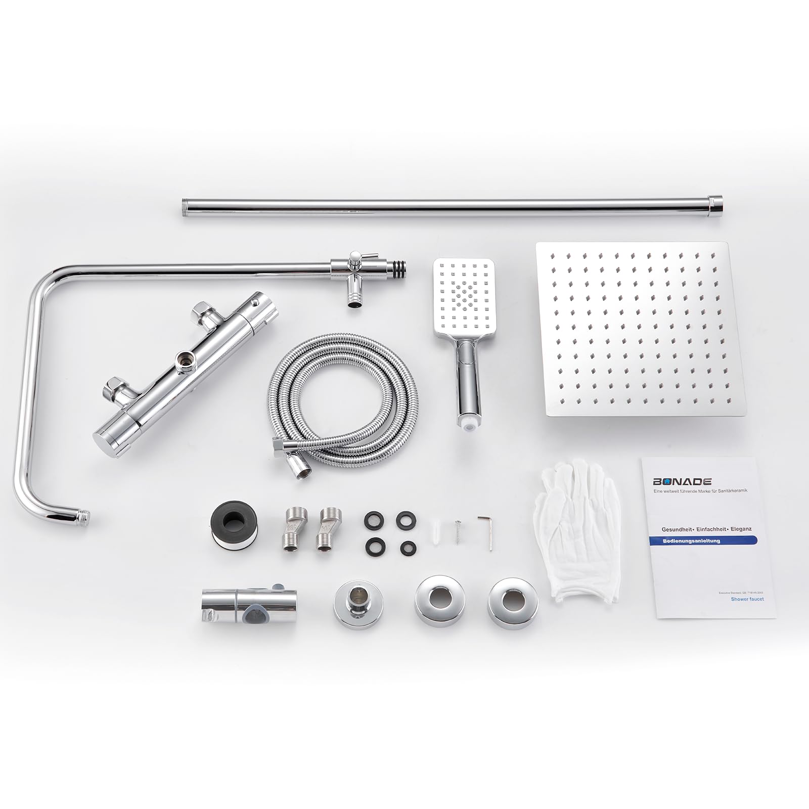["The shower set features precise thermostat control, allowing you to easily regulate the water temperature and maintain stability regardless of fluctuations in water pressure. This is a great way to enjoy a shower without worrying about hot or cold water. The shower is equipped with a safety system that locks the temperature at 38°C to prevent burns. This is especially beneficial for families with children and seniors.","The height-adjustable shower bar is made of high-quality stainless steel, corrosion-resistant, and easy to clean. It can be adjusted in height between 81 cm and 117.5 cm, allowing you to use existing drill holes. Both the overhead shower and the handheld shower can be adjusted in height and angle to suit each other. This adjustability makes the thermostatic shower system suitable for family members of different sizes.","The 10-inch ultra-thin overhead shower and 3 spray modes handheld shower are made of rust- and lead-free stainless steel. The overhead shower head is movable thanks to a ball joint, allowing for a rotation angle of 15°. The spray modes of the handheld shower can be easily and variably selected by pressing an oval button. All nozzles are made of soft rubber, making it easy to remove limestone buildup.","The shower system with thermostat mixer is made of brass with a chrome-plated surface, corrosion-resistant and rust-resistant. The shower system is compatible with any type of bathroom. The surface of the shower set not only looks great but is also very resistant to scratches and easy to care for. Simply wipe the surface with a cloth and the chrome finish will shine again.","The accessories are complete and easy to assemble. All parts are individually packaged in small fabric bags to prevent scratches. The installation of the shower system is straightforward and easy, as it comes with a complete standard accessory set and detailed instructions. The warranty is two years."]