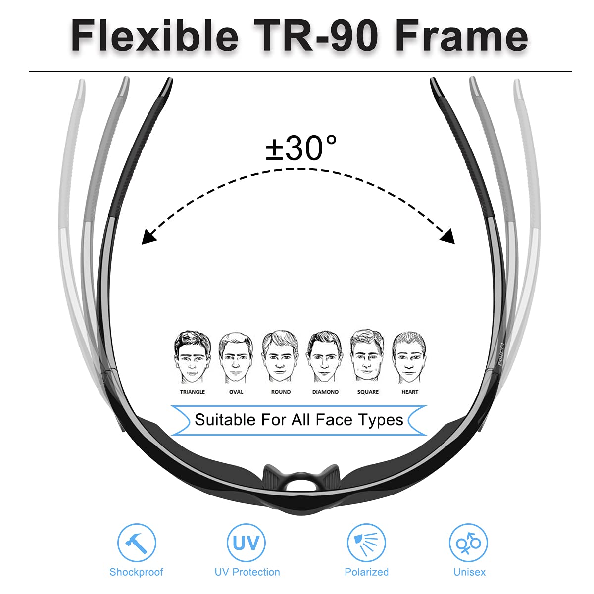 "Cycling glasses for every face shape: These cycling glasses for men and women with a special ergonomic design ensure a comfortable wearing experience. Our polarized sunglasses not only have fashionable style but also humanized design. Learn about different face shapes. The temple arm of the glasses has an anti-slip and rebound function. Perfectly adjust to your ear skin and head. And make it more comfortable when wearing our windproof glasses."