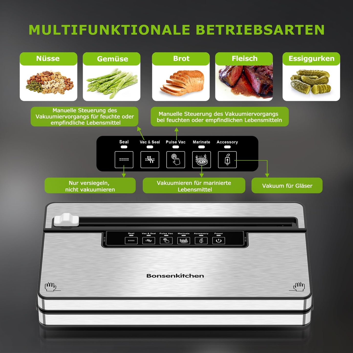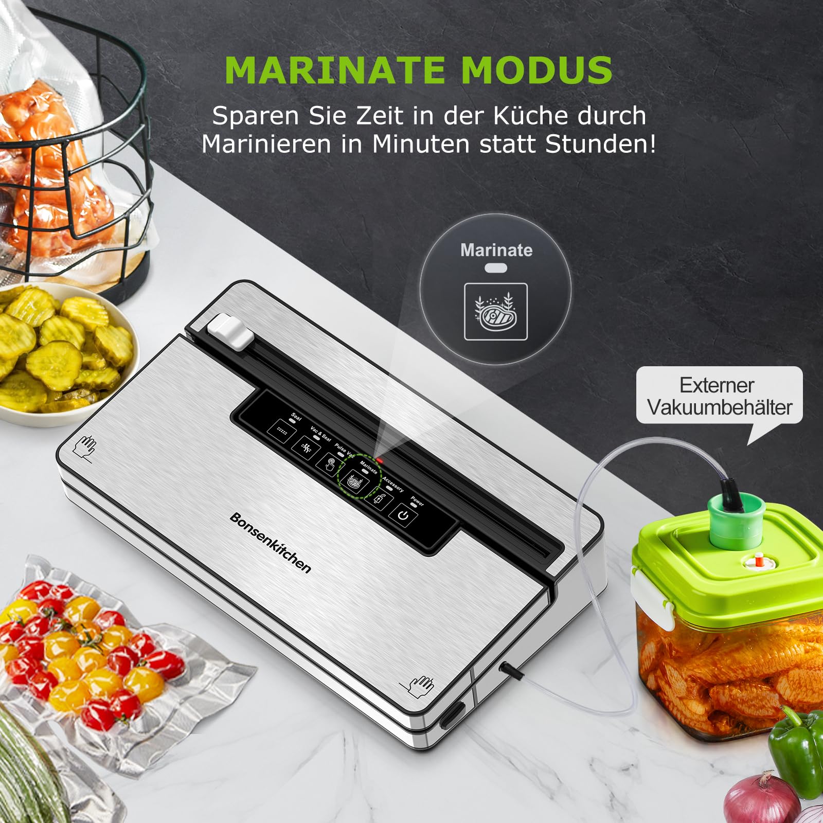 ["8L/Min Strong Suction Power: The improved 125W high-performance vacuum pump provides strong and stable suction power, globefish technology for high-speed continuous operation, sucks food faster and denser than ordinary machines. The vacuum sealer is suitable for sous vide cooking and can also effectively remove air from the bag to prevent freezing and keep food fresh for up to 25 days. Significantly reduce food waste","5 Multifunctional Modes: Vac & Seal - can vacuum and seal automatically; Pulse Vac - can manually control the vacuuming process and then the machine will seal automatically; Seal - for quick sealing of bags without vacuuming; Marinate - you can vacuum some marinated foods with a special external vacuum container; Accessory - you can use it for vacuuming wine, glass, etc. Multifunctional vacuum sealer is easy to use, even for beginners","Built-in Cutter and Bag Storage: The vacuum sealer features a built-in 34 cm cutter that makes it easy to cut vacuum bags of various sizes. The integrated bag slide allows for easy storage of the bags. It is best to use Bonsenkitchen's professional vacuum bags with deep air channels for a good seal","Accessory Storage and Sturdy Panels: The food vacuum sealer has a special storage space for accessories. External hoses and connectors are housed inside the unit, saving space and reducing the likelihood of losing accessories. The surface of the vacuum sealer is made of stainless steel, which is easy to clean and durable","Friendly Starter Kit: 1 x vacuum sealer, 100 x vacuum bags, 1 x roll bag (28*600 cm), 1 x external air suction hose, 3 x external interfaces, 1 x user manual. (Please note that the roll bag is placed in the bag storage unit of the machine)"]