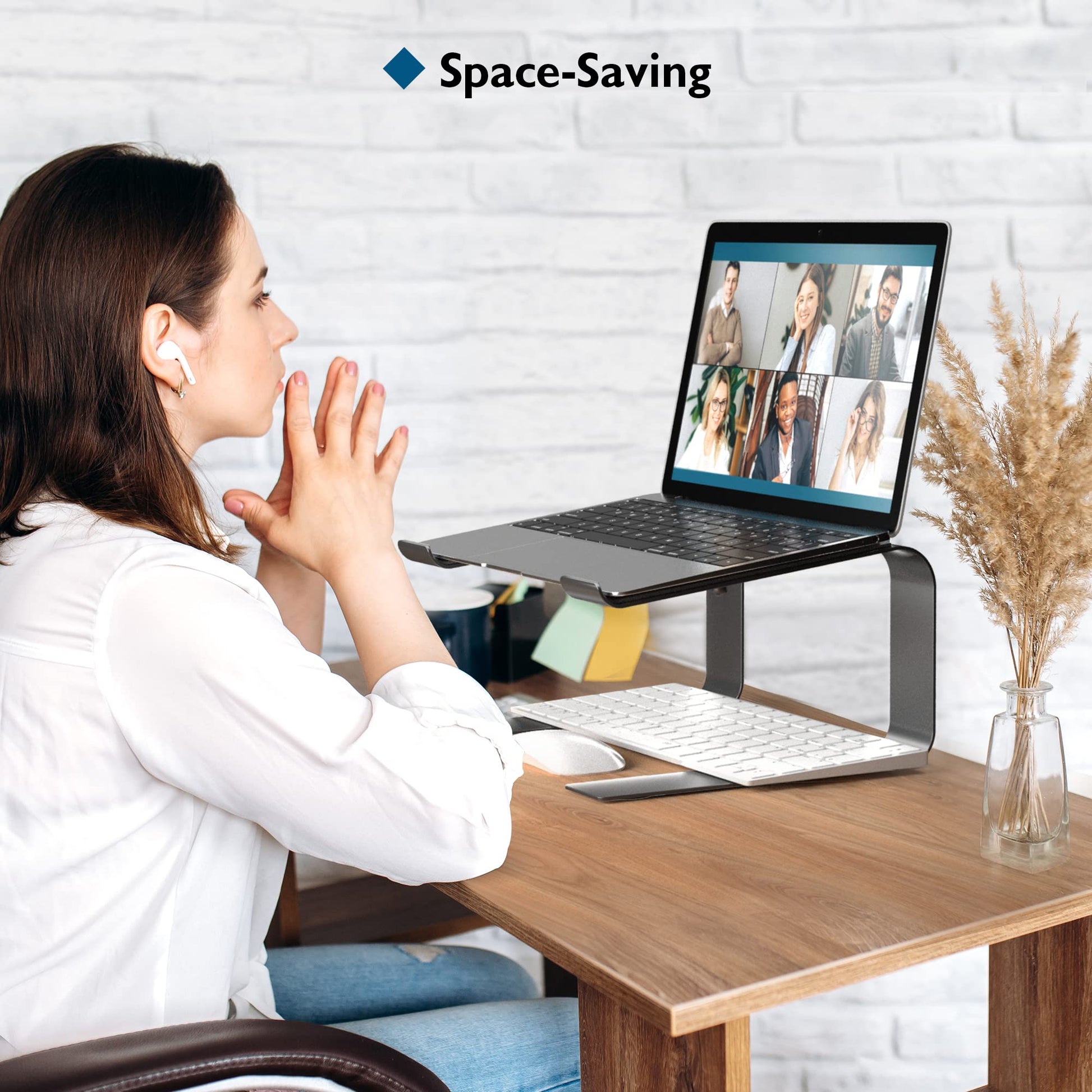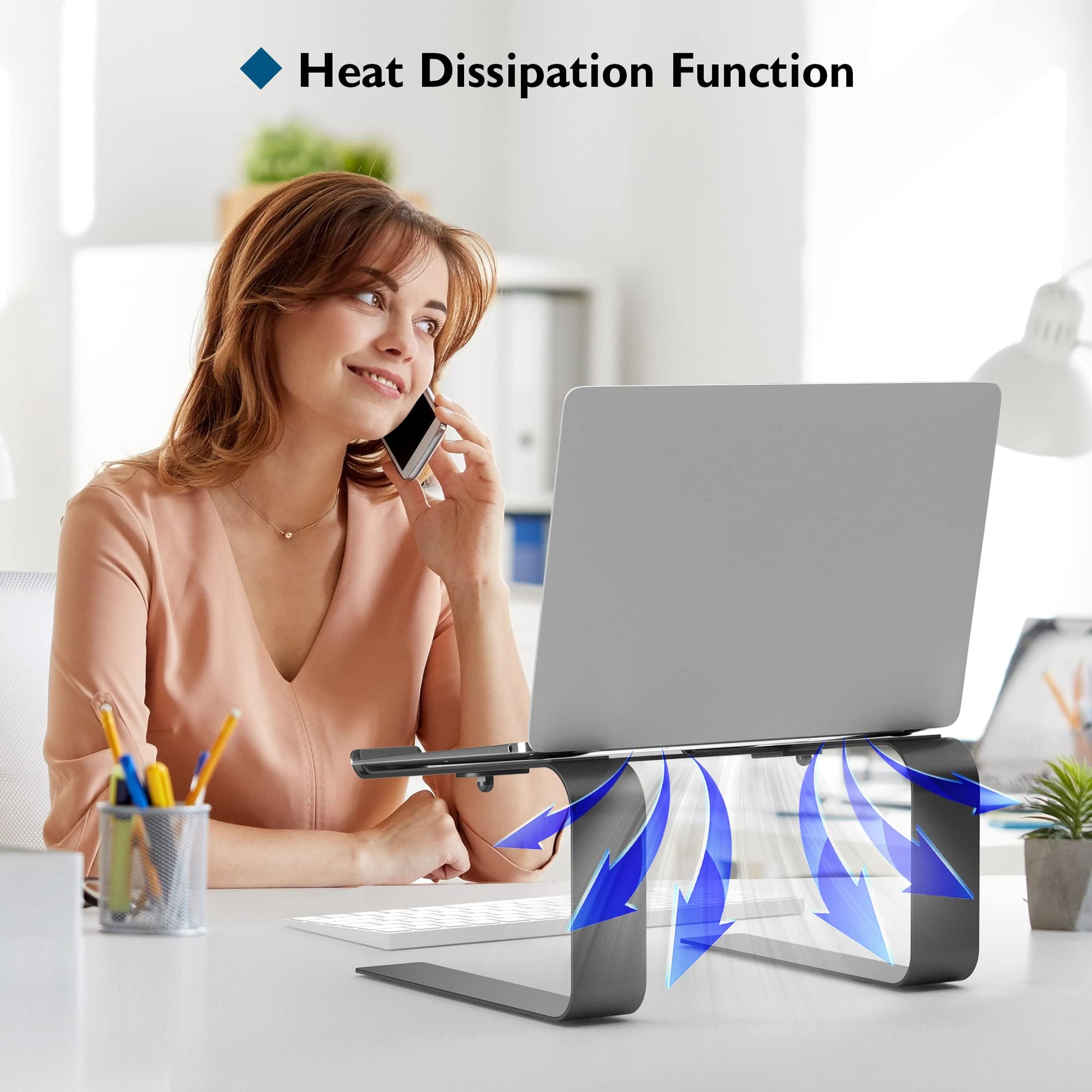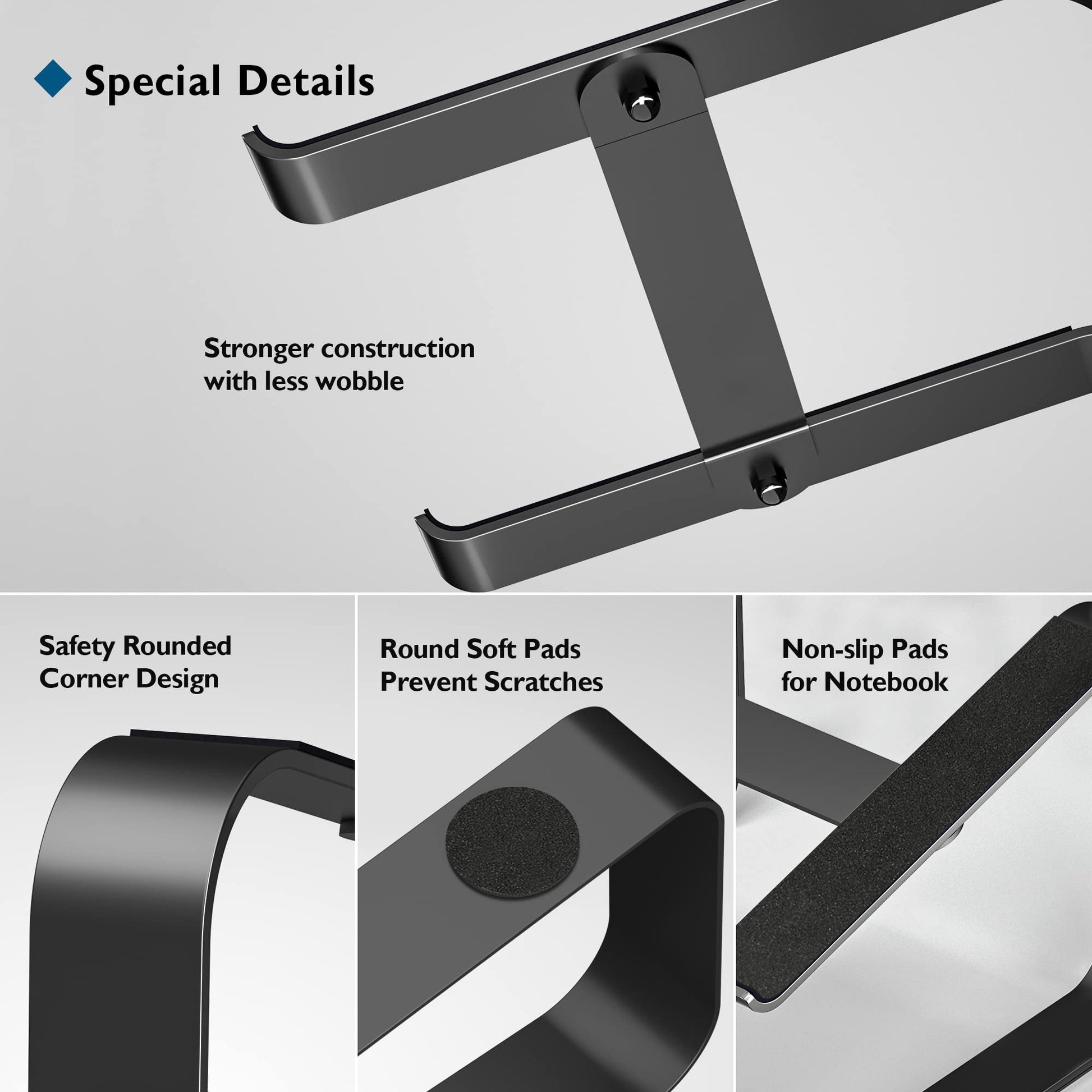["Health Benefits: The ergonomic laptop stand helps eliminate back pain and laziness. Our laptop stand effortlessly raises your laptop to a higher level, up to 14 cm away from the desk, and tilts 14 degrees to reach eye level, optimizing posture and comfort and relieving neck and shoulder pain","Universal Compatibility: This universal computer riser is suitable for all laptops from 10-17.3 inches. It is compatible with MacBook, MacBook Pro/Air, Asus, Sony, Dell, HP, Toshiba, Lenovo, etc., with a maximum load capacity of 5kg/11 pounds","Heat Dissipation: The key to extending the life of your laptop is to keep it cool. This laptop stand raises your laptop from a flat surface so that the air can continuously cool your laptop and protect it from overheating, extending the battery life and improving overall performance","Space-saving: The MacBook laptop stand can maximize the available space on your desk. The two cable outlets keep your desk organized. Additionally, there is extra space below to store your external keyboard. The laptop stand is equipped with four soft pads to avoid scratches on the desk, while the two top pads protect your laptop","Quick to install: This laptop stand is made of metal sheets, sturdy and durable, sleek and aesthetic, and the installation should take only a minute or so - just tighten 2 screws before use"]