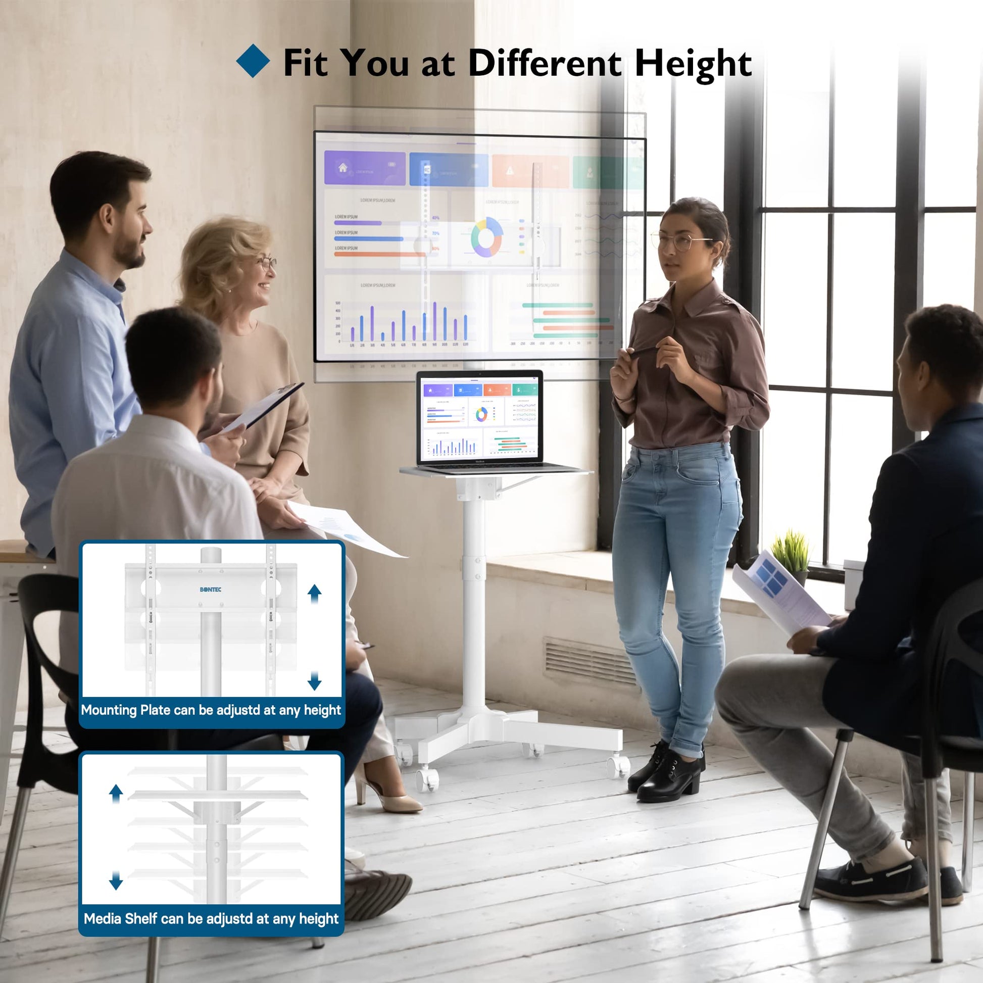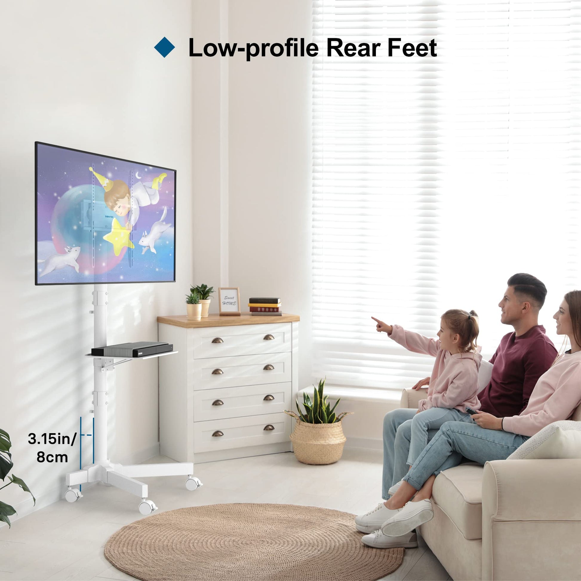 Functional Shelf and Easy Maintenance: Equipped with an adjustable shelf, this portable TV stand provides space for laptops, gaming consoles, or DVD players to keep accessories organized. The surface is easy to clean with a soft, dry cloth, maintaining a neat, professional appearance in both public and private spaces.
