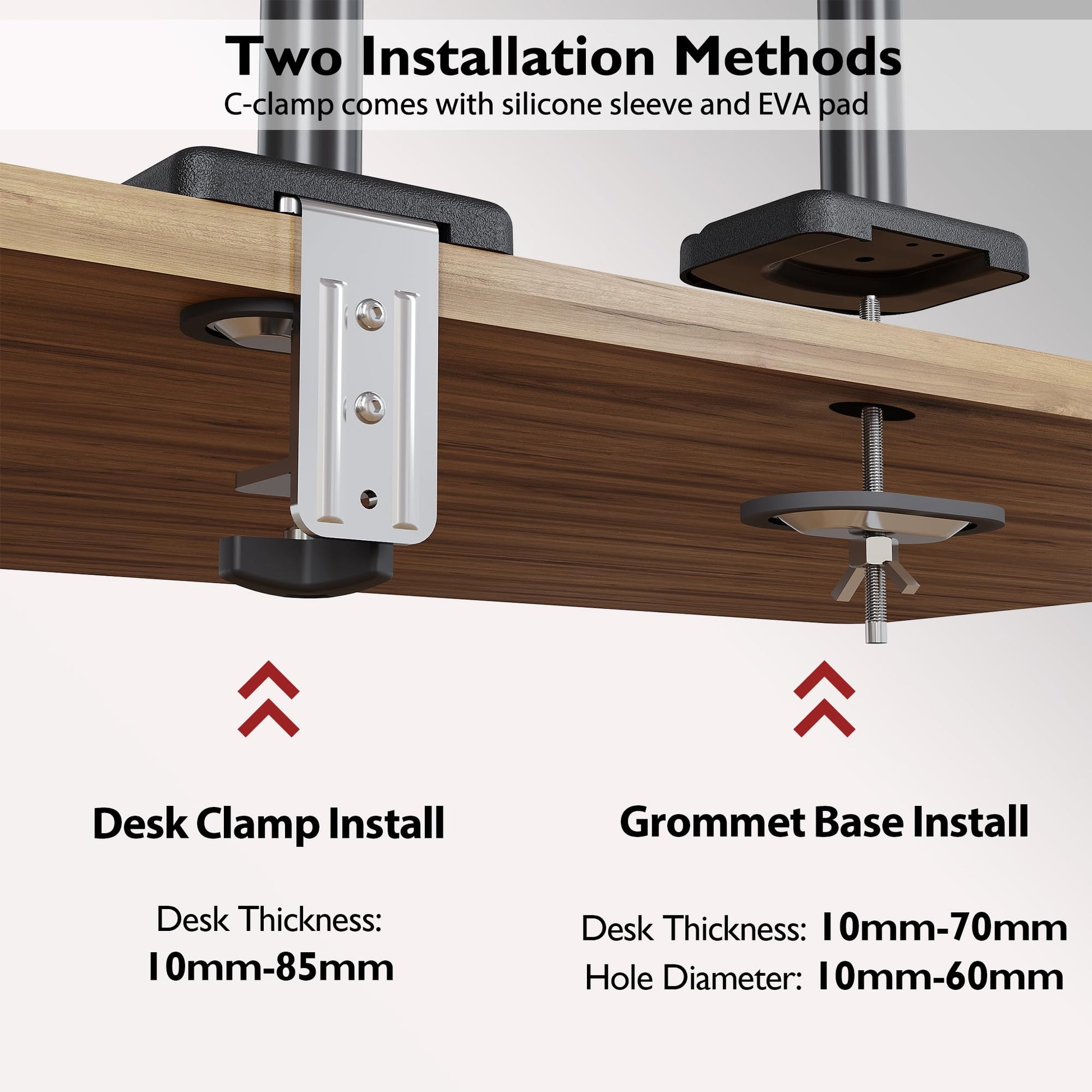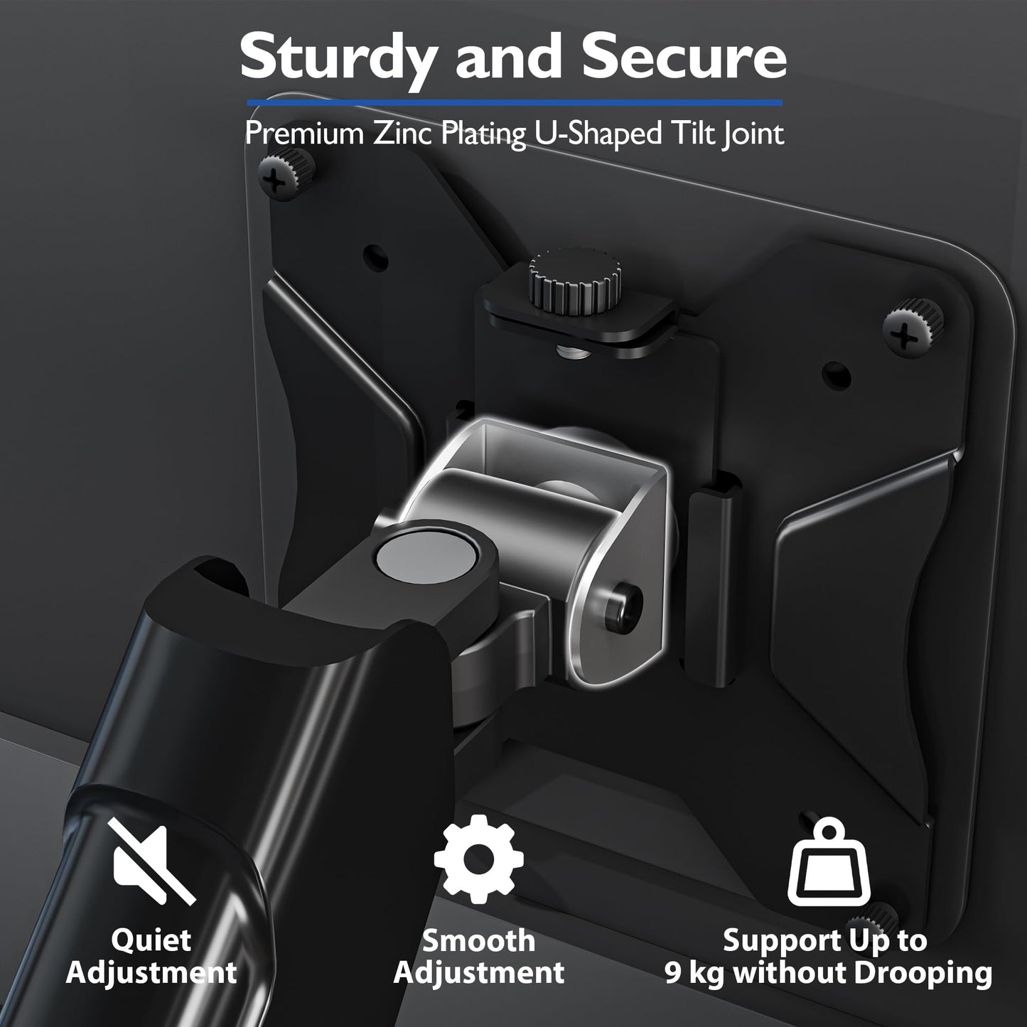 ["High-quality monitor arm for effortless movements After rigorous testing in the development phase, we have chosen zinc material of the highest quality and a reliable U-shaped joint head structure. This allows our monitor arm to effortlessly tilt, swivel, and rotate 34-inch monitors weighing up to 9 kg.","Compatibility & Flexibility for optimal adjustment Our monitor arm is suitable for screens ranging from 13 to 34 inches and weighing from 3 to 9 kg, with VESA patterns of 75x75mm and 100x100mm. The U-shaped joint head allows for tilts of ±90° and swivels of ±90°. The screen can be adjusted in both portrait and landscape orientations, with a 360° rotation. In addition, the 364mm long central pole allows for a maximum distance of 635mm from the VESA plate center to the tabletop.","Sturdy support for stability and security Our monitor mounts are designed to maximize strength and stability. The single monitor arm features a built-in gas spring with a load capacity of 750 N⋅m. This gas spring has successfully passed a durability test of 30,000 cycles to ensure long-lasting support for your monitor.","Two installation methods for optimal space utilization This product offers two flexible installation methods - C-clamps and grommet mounting. The recommended table thickness is 10 to 85 mm for C-clamps and 10 to 50 mm for grommets. This versatile solution not only creates more space on your desk but also ensures a tidy workspace thanks to the concealed cable management system.","Relieve neck fatigue for a comfortable work environment The gas spring monitor stand allows you to adjust your seating position as desired. By seamlessly switching between sitting and standing positions, you can reduce fatigue and counteract potential spinal deformation - the ideal solution for an ergonomic work environment."]