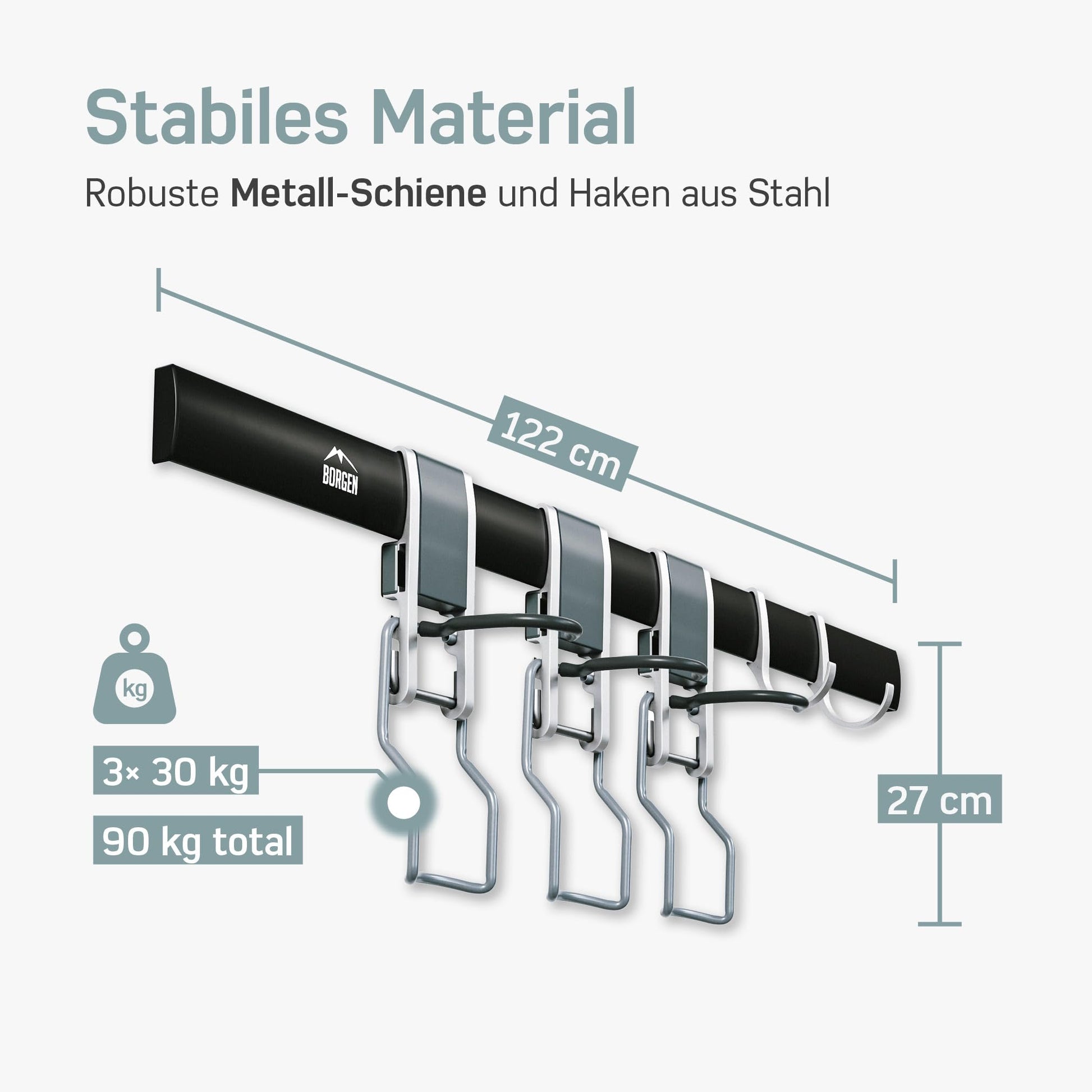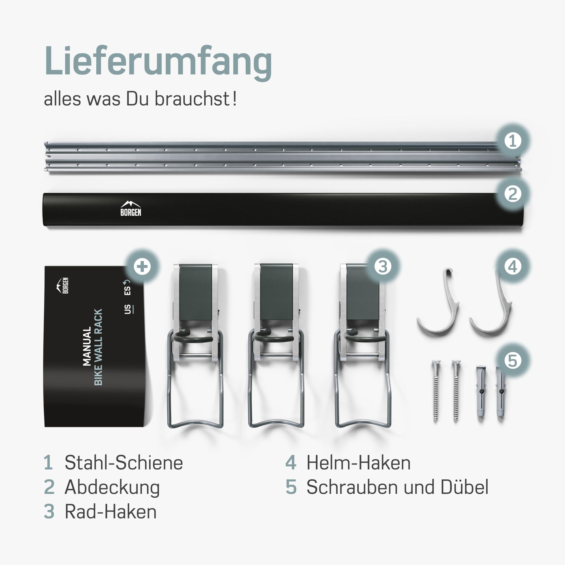 ["Garage space - Never has organization been so easy. The Borgen wall mount creates new space in the garage, as bicycles no longer clutter the floor. Perfect for 3 bicycles plus accessories.","For all common bicycle models - Any type of bicycle can be conveniently hung on the wall. Whether it's a mountain bike or an E-bike with a wide handlebar, a road bike or a children's bike, there is space for it.","Scratch-free - The rubber-coated hook of the bike hanger protects the rim from scratches or pressure marks. Bikes weighing up to 66 lbs can also be easily hung up.","Infinitely adjustable - Depending on your needs, the bike hooks or accessory hooks can be repositioned. Thanks to the included instructions, the bike suspension is very easy to mount.","100% BORGEN - Developed in Germany! We believe in quality that pays off."]